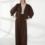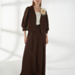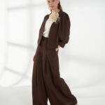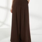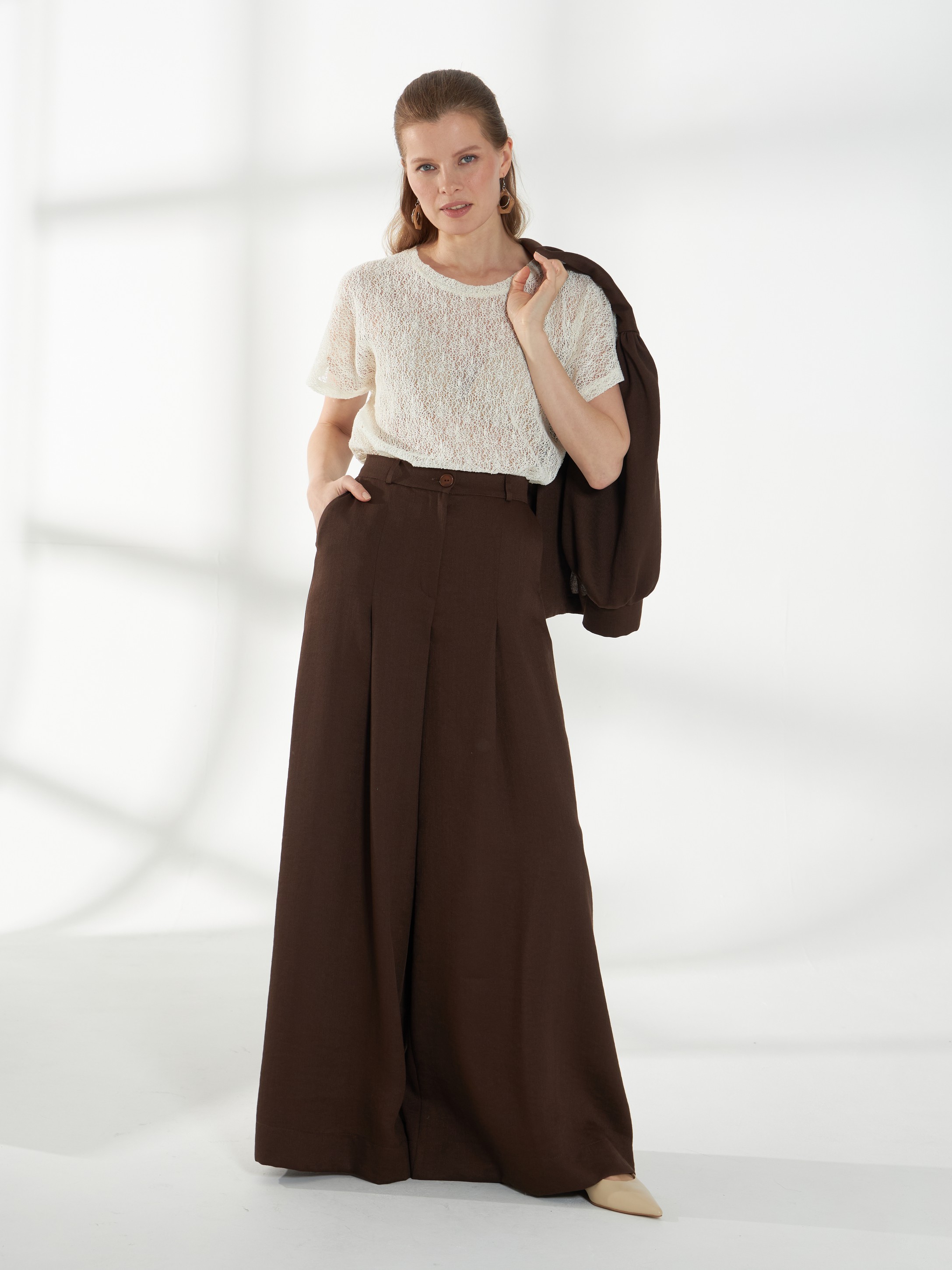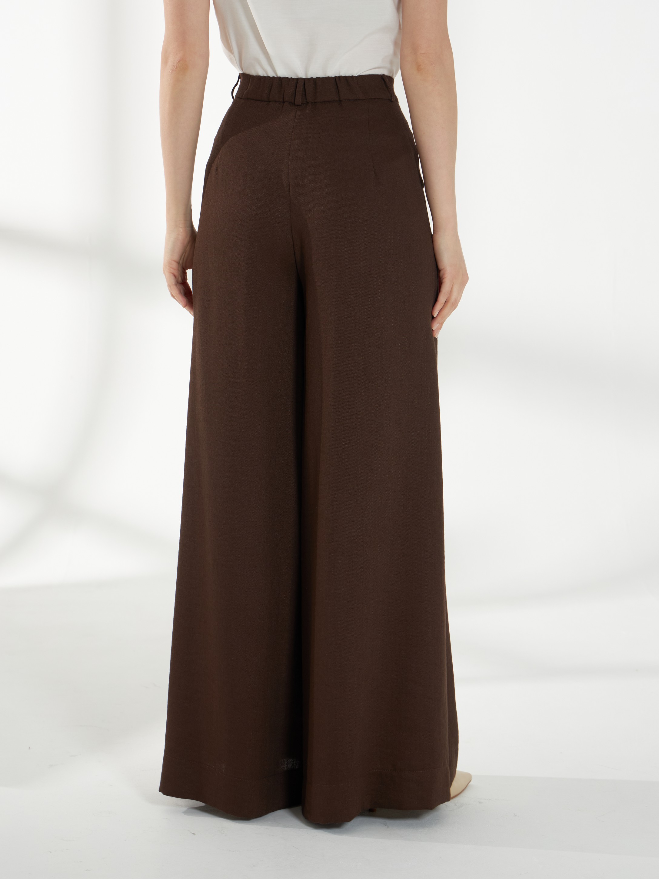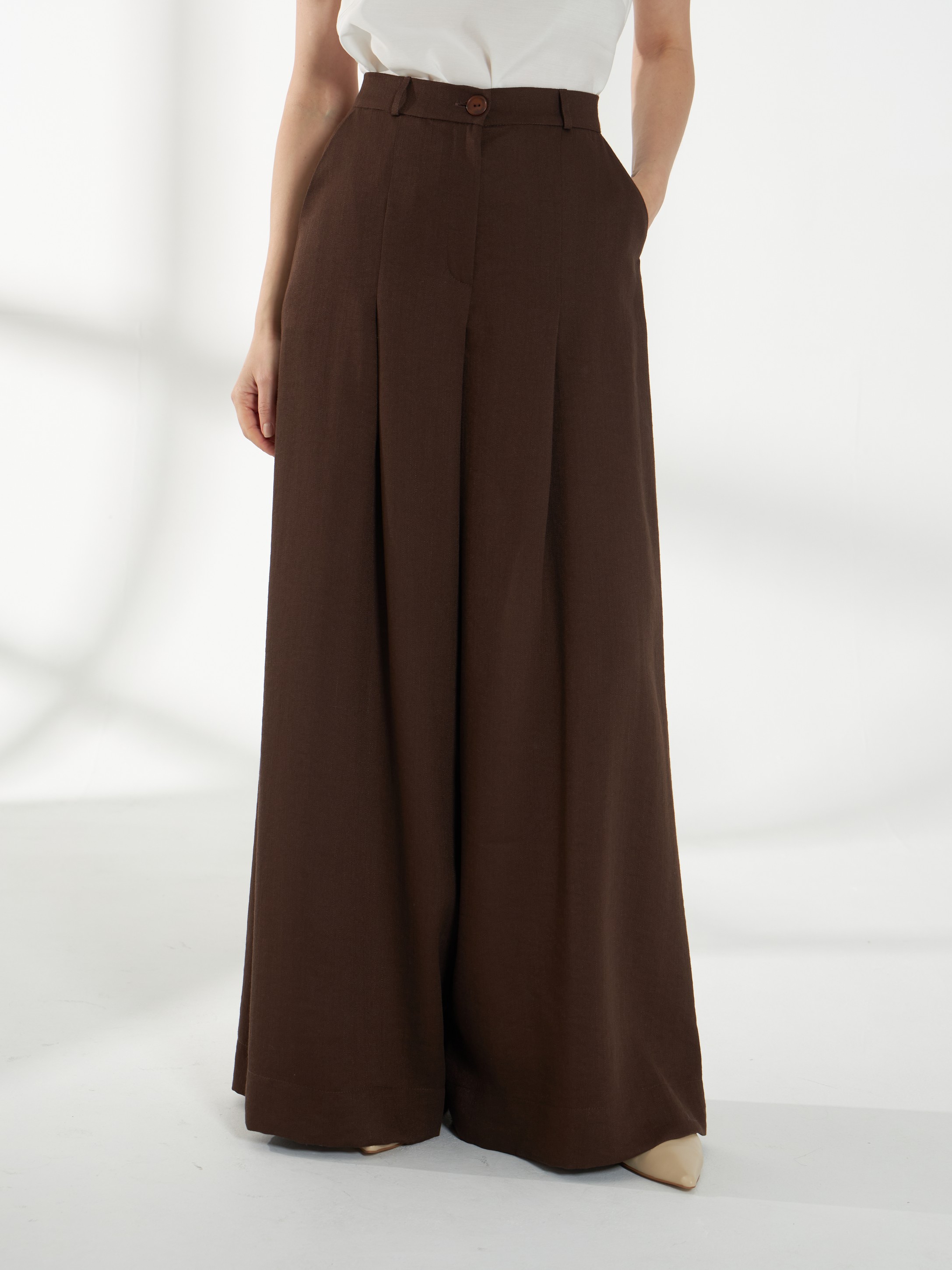 Брюки из смесового материала со льном, в коричневом оттенке, с высокой посадкой и плавно расширяющимся книзу силуэтом, создающим свободный и элегантный образ. Спереди — глубокие застроченные складки, по бокам — удобные карманы. Застежка — гульфик, сзади в поясе встроена резинка для комфортной посадки. На фото брюки представлена с джемпером С-34 НТР(В6) и жакетом В-944 ШОЛ(В6).