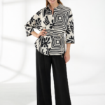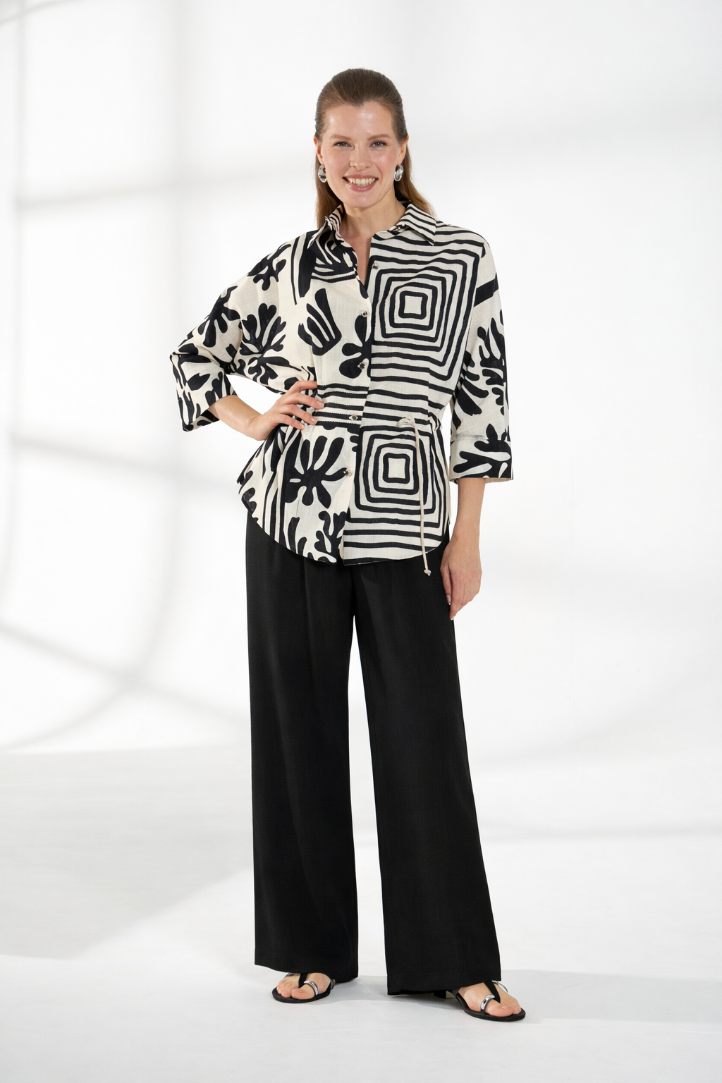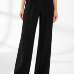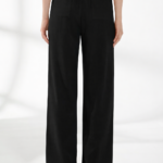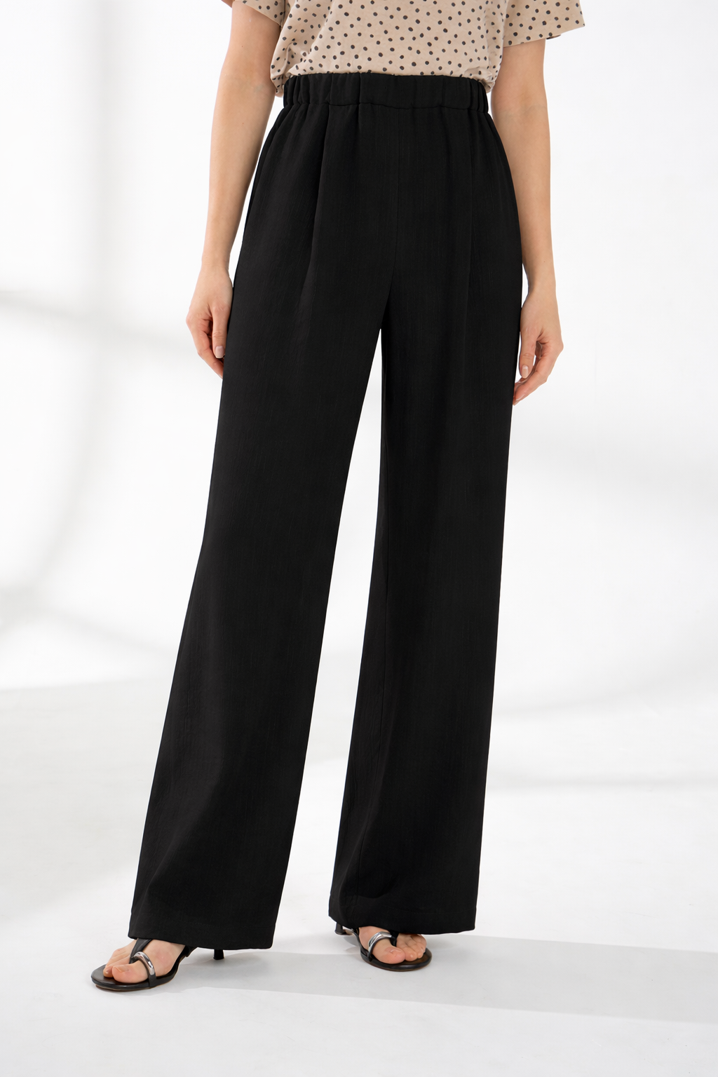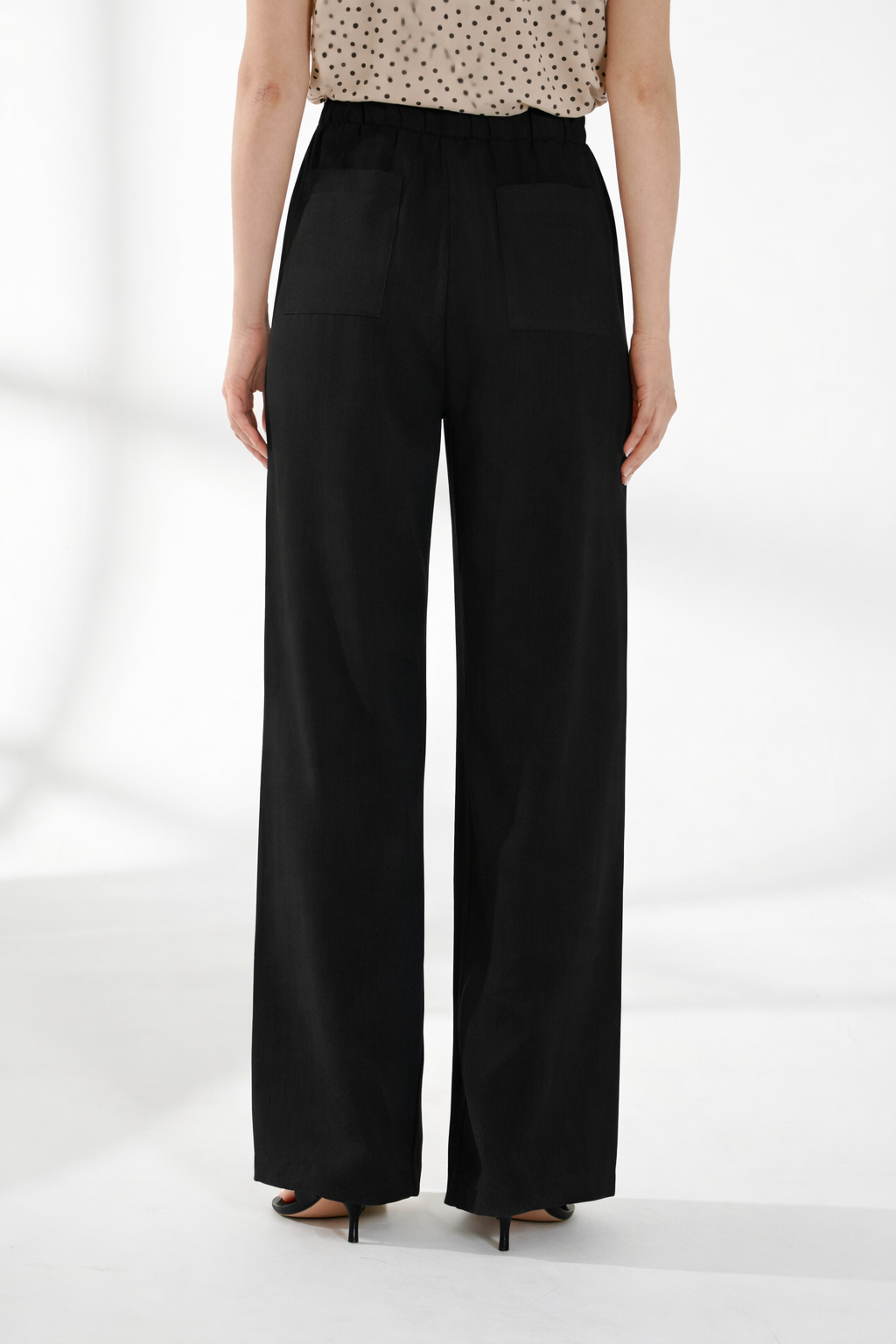 Широкие брюки, из смесовой ткани со льном в черном оттенке, без бокового шва, с аккуратными складками спереди, создающими мягкий расслабленный силуэт. Широкий пояс с резинкой внутри обеспечивает комфортную посадку, а накладные карманы сзади добавляют практичности и завершённости модели. На фото брюки представлены с блузкой Д-258 АТЛ(В6).