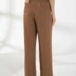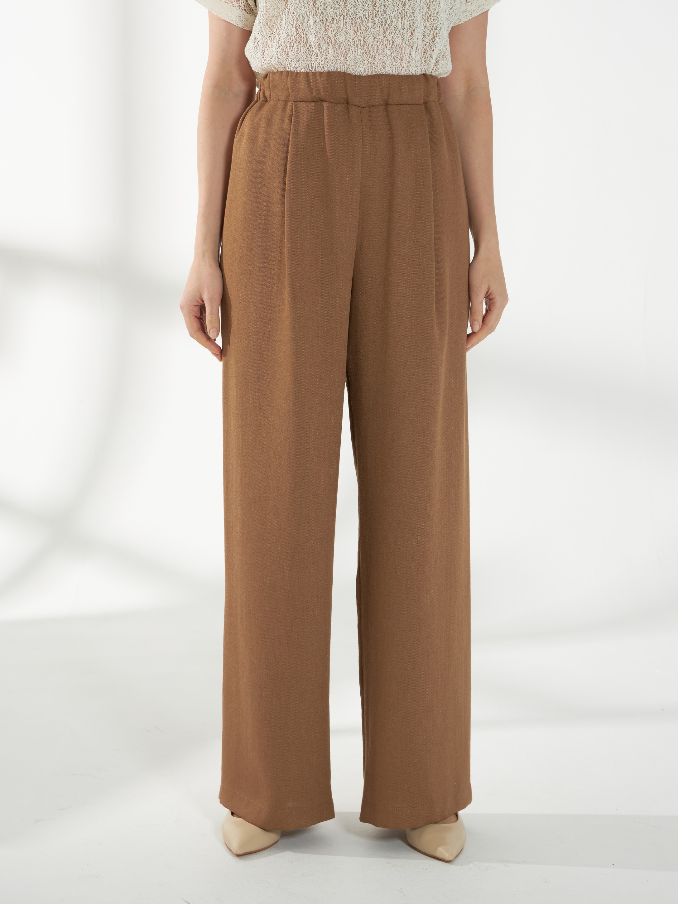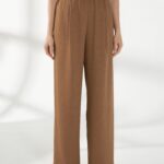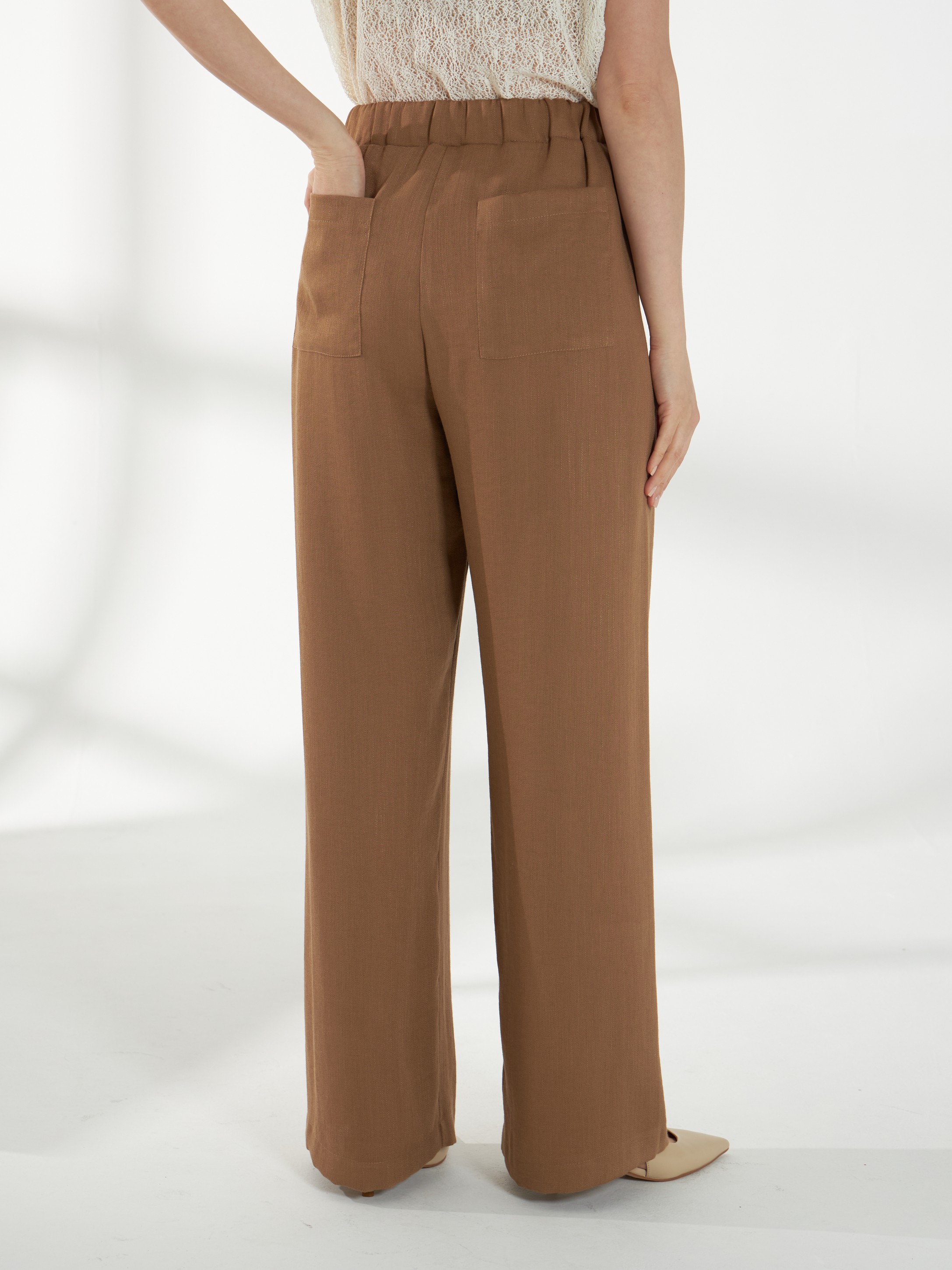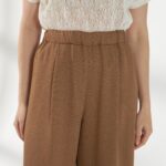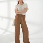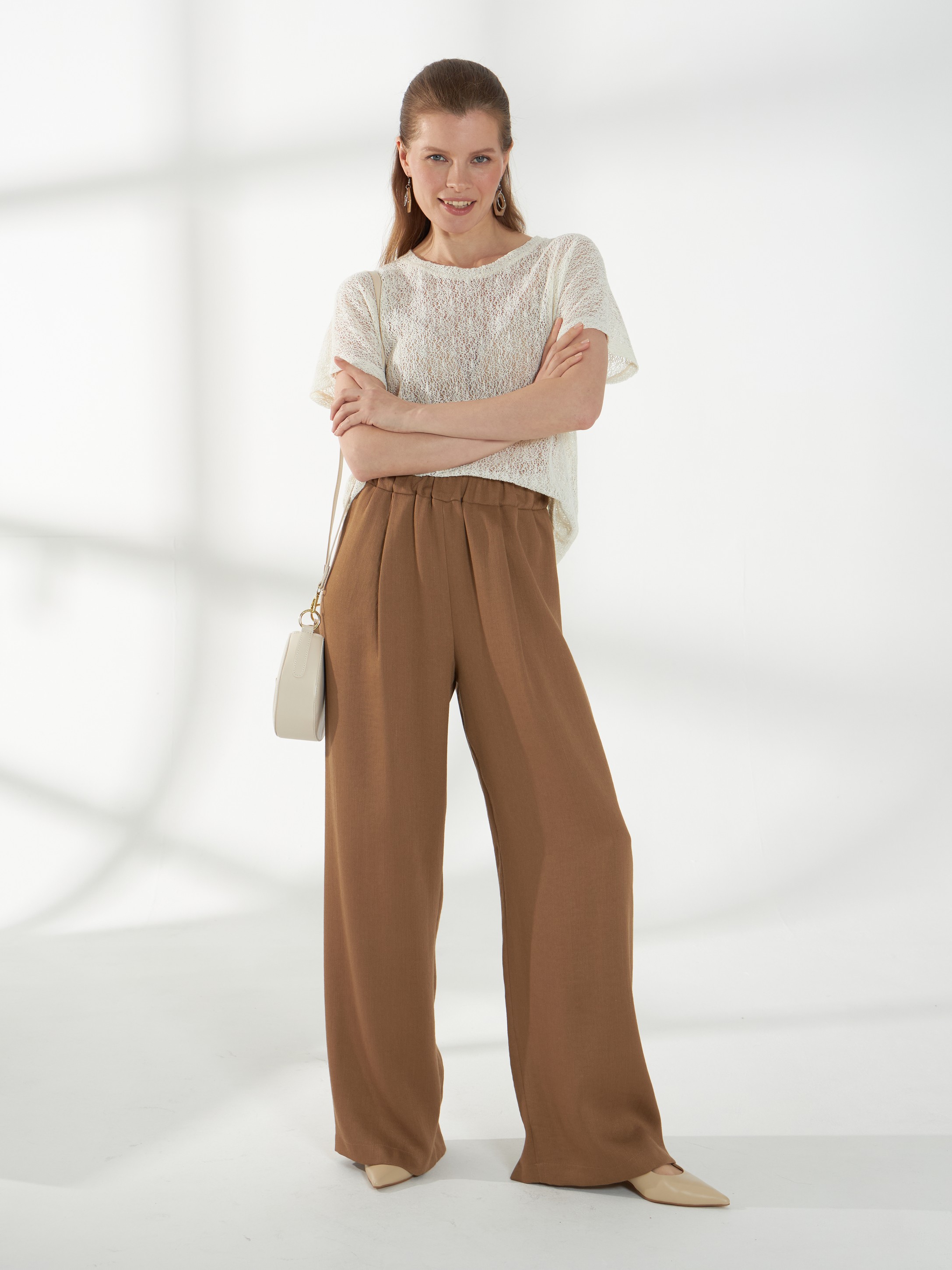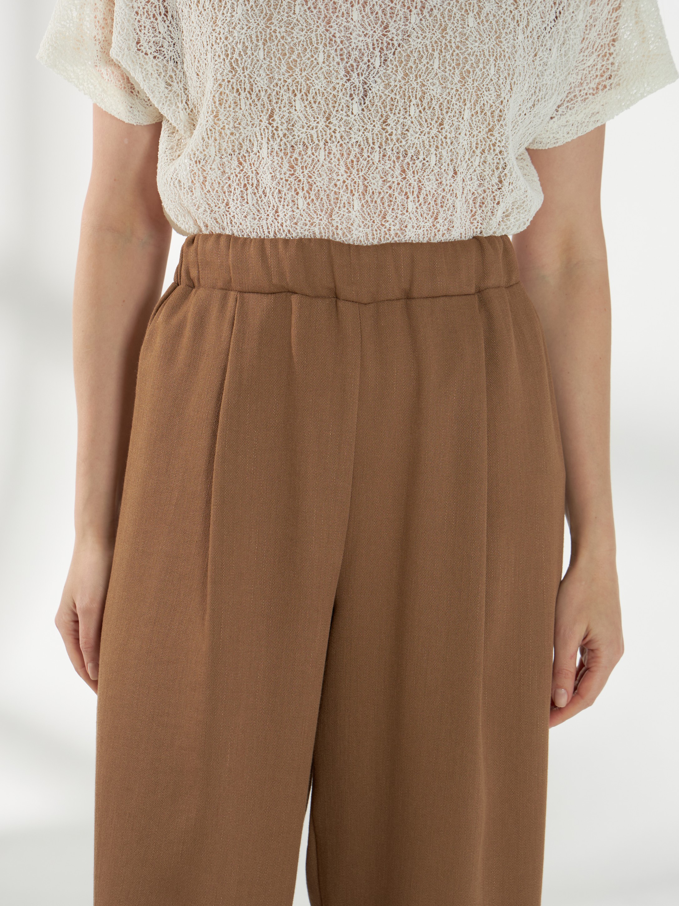Широкие брюки, из смесовой ткани со льном в песочном оттенке, без бокового шва, с аккуратными складками спереди, создающими мягкий расслабленный силуэт. Широкий пояс с резинкой внутри обеспечивает комфортную посадку, а накладные карманы сзади добавляют практичности и завершённости модели. На фото брюки представлены с джемпером С-34 НТР(В6).