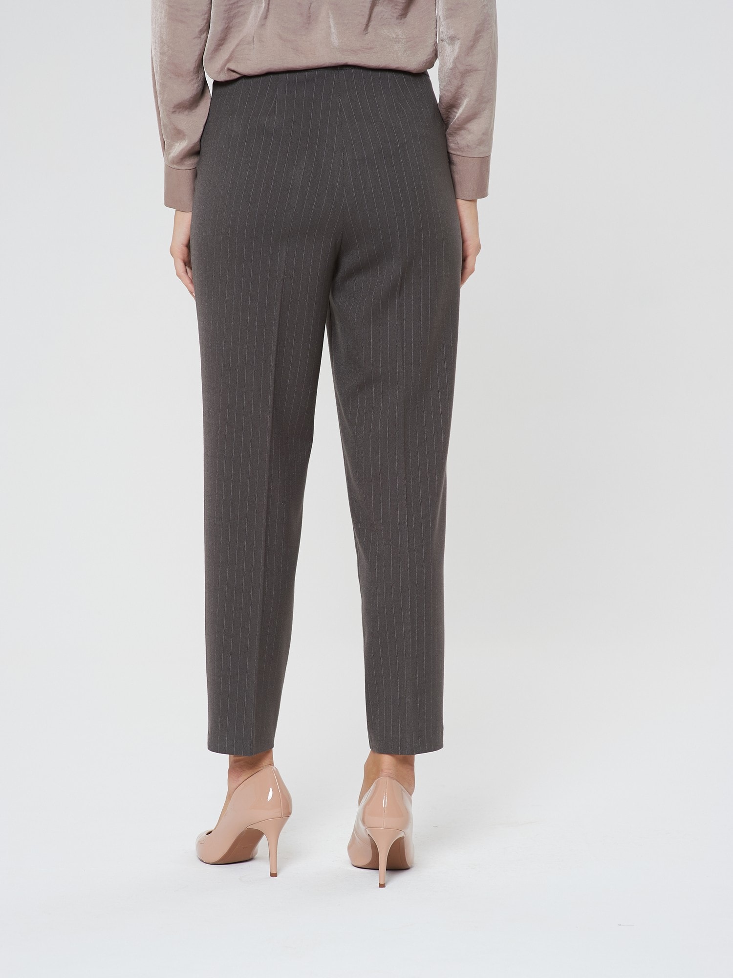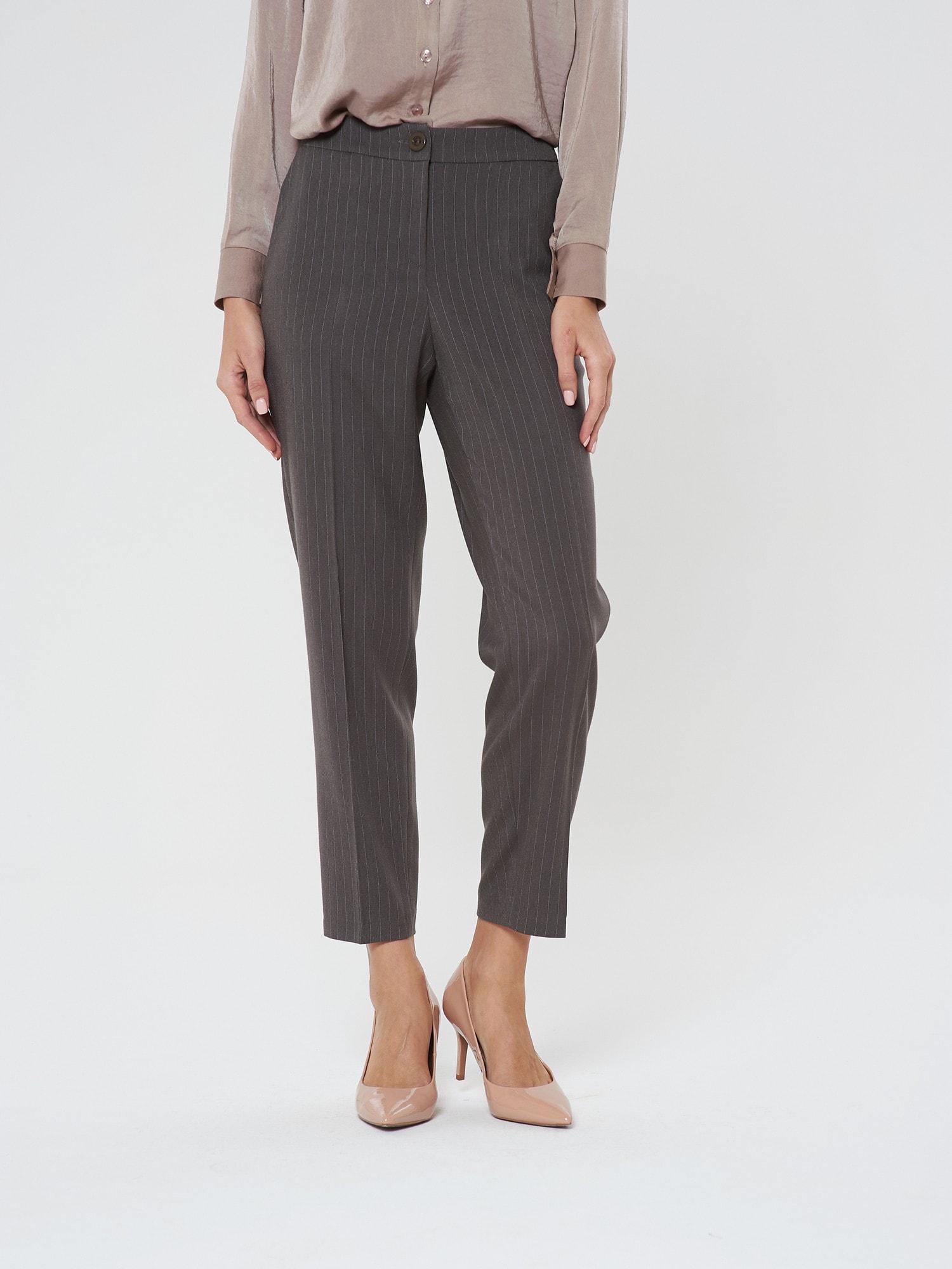 Укороченные брюки с высокой посадкой в тонкую полоску. Они идеально подходят как для офиса, так и для образов в стиле smart casual.