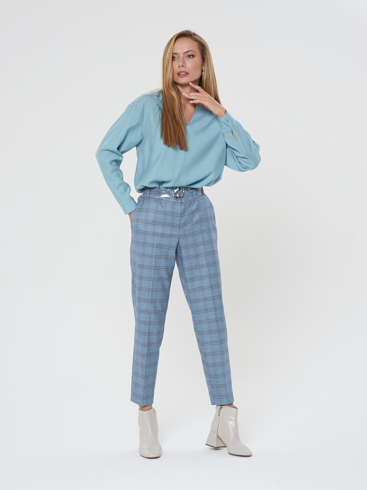 Брюки в клетку василькового оттенка. Прямой силуэт, карманы в боковых швах и шлевки для пояса. Прямой крой не будет стеснять движений на протяжении всего дня. Дополните блузкой Д-926 ОТБ(В20)