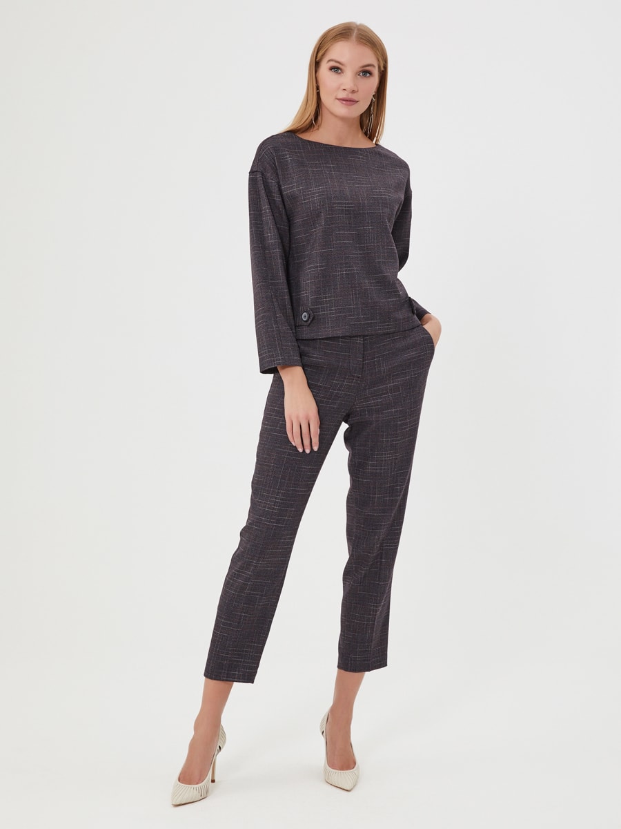 Описание: Брюки из серо-фиолетовой фактурной ткани. Карманы в боковых швах, классическая модель. Образ на фото дополнен блузкой Д-2009 МЖ(О) из той же ткани.