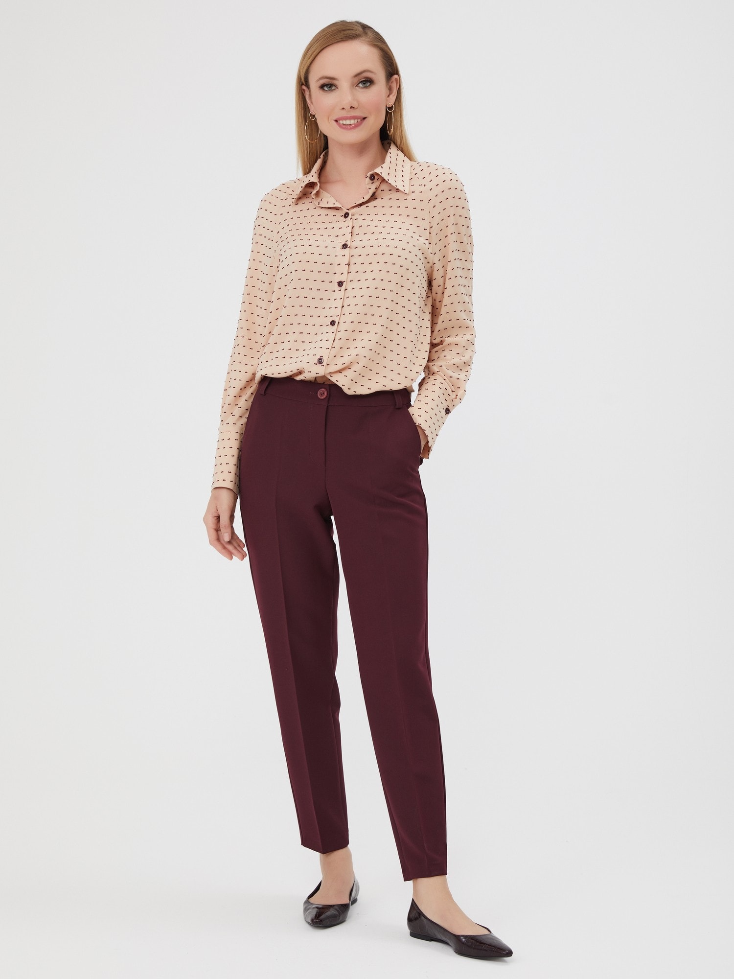 Бордовые брюки для образов в осенней палитре. Карманы, шлевки для пояса. Для полноценного комплекта сочетайте с блузкой Д-2005 ББ(О) и жакетом В-810 МЕР(О)