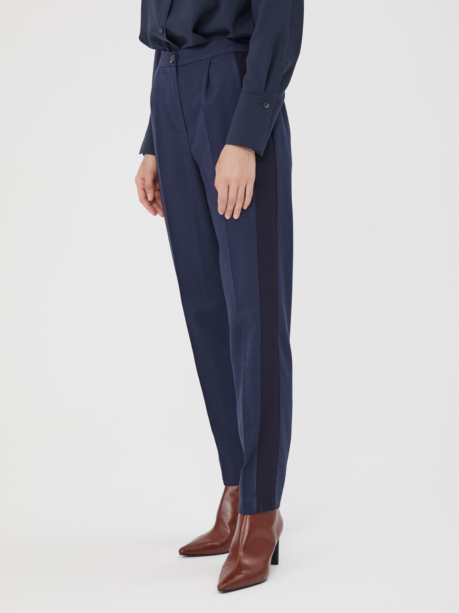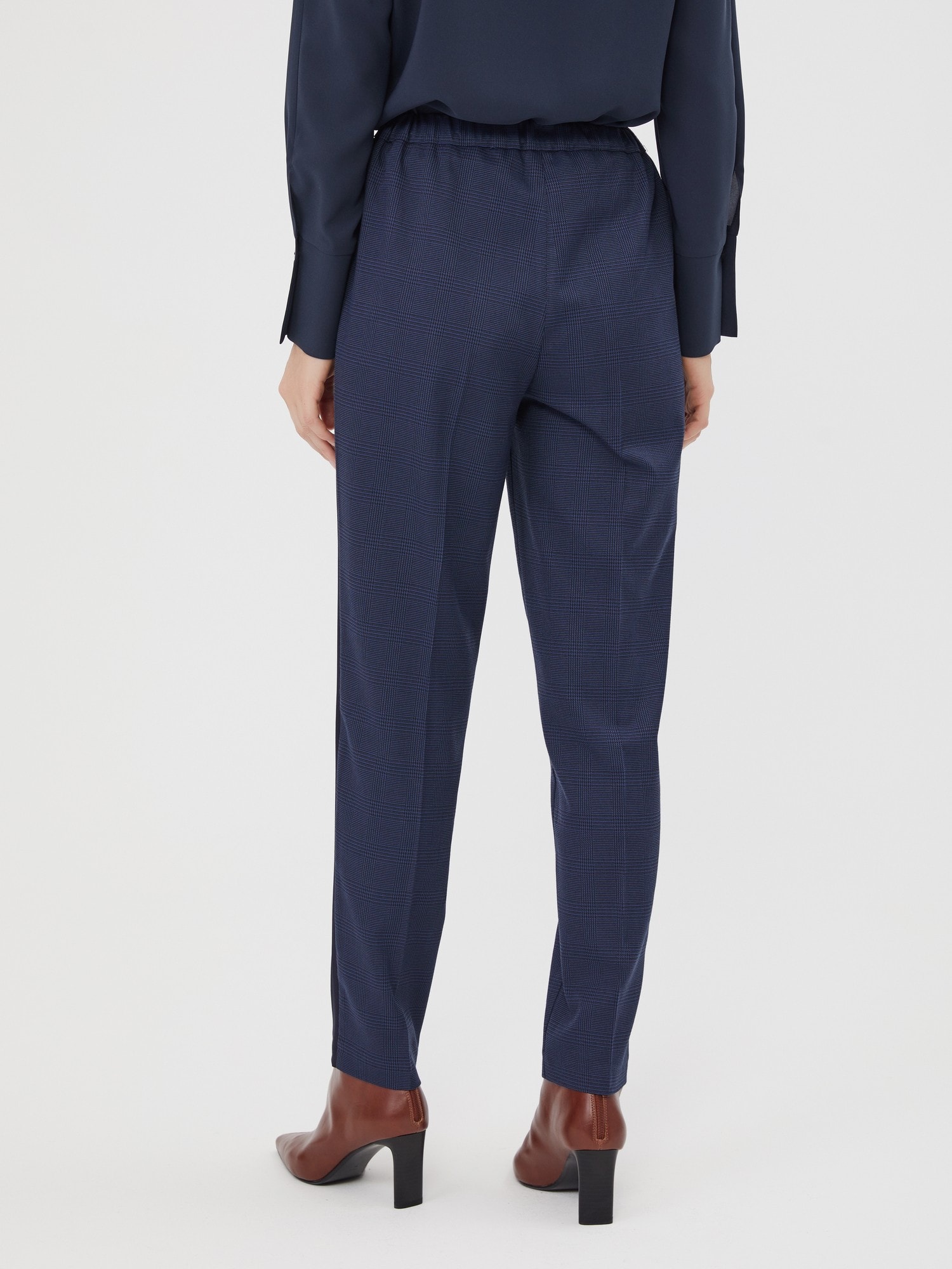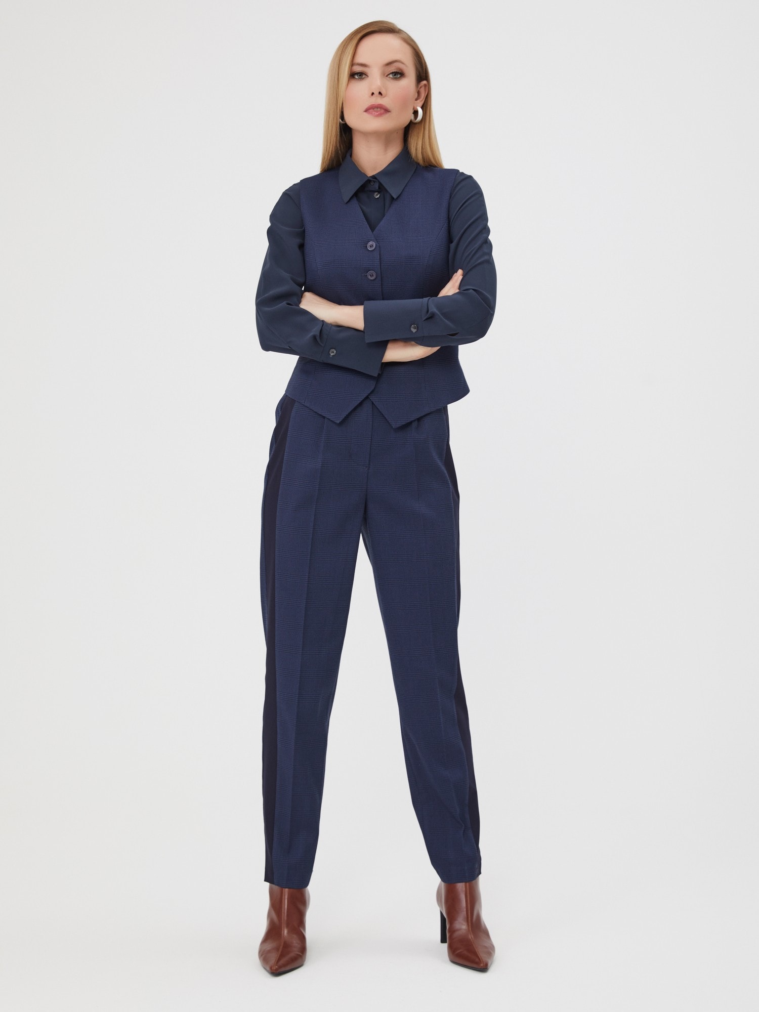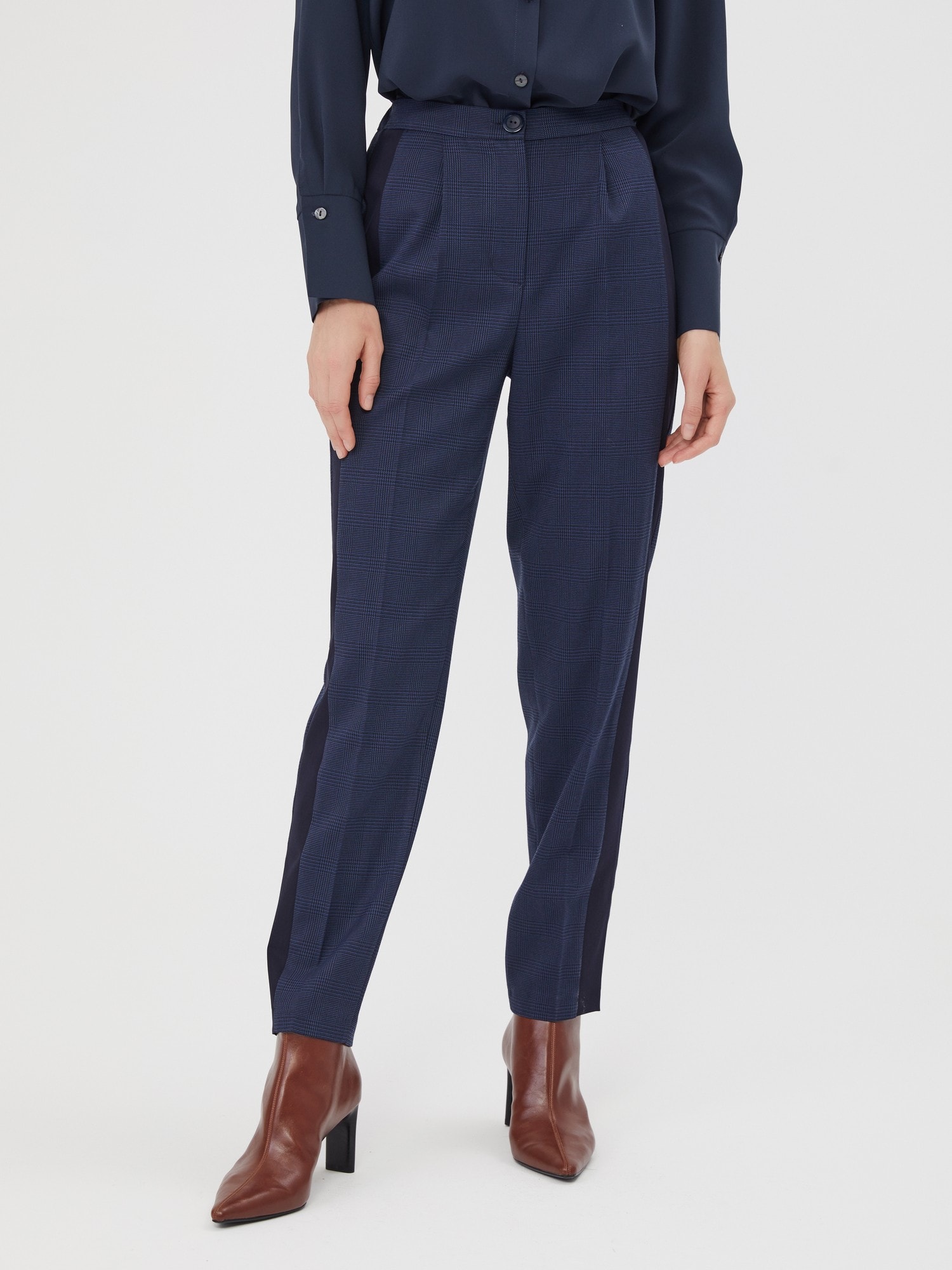 Брюки в мелкую сине-черную клетку "гленчек" с лампасами. Модель с защипами и резинкой по спинке для оптимального прилегания. Брюки являются частью самого трендового комплекта-тройки, состоящего из жилетки В-91 ЧЕК(О) и жилета В-91 ЧЕК(О)