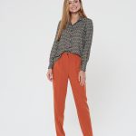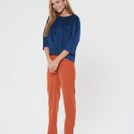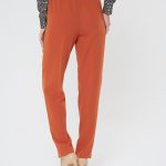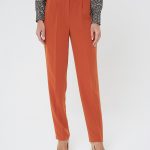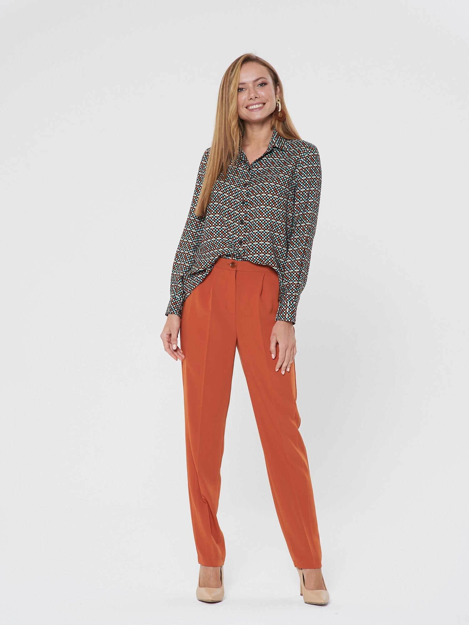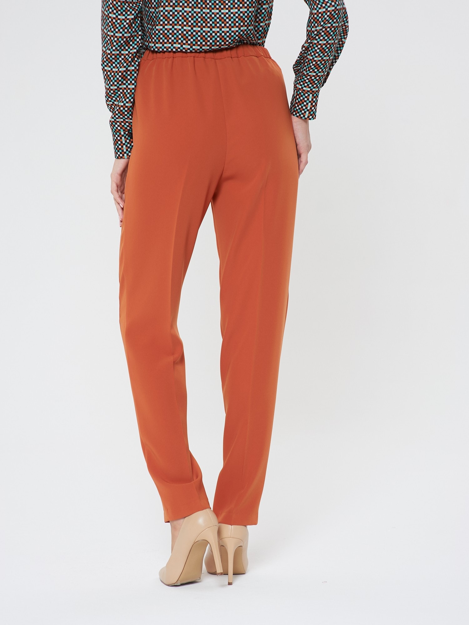 Прямые брюки насыщенного красно-оранжевого цвета. Модель имеет притачной пояс спереди, сзади линия талии собрана на резинку. Карманы расположены по бокам, заутюженные стрелки. Дополните брюки блузкой Д-912 Ш(В20)