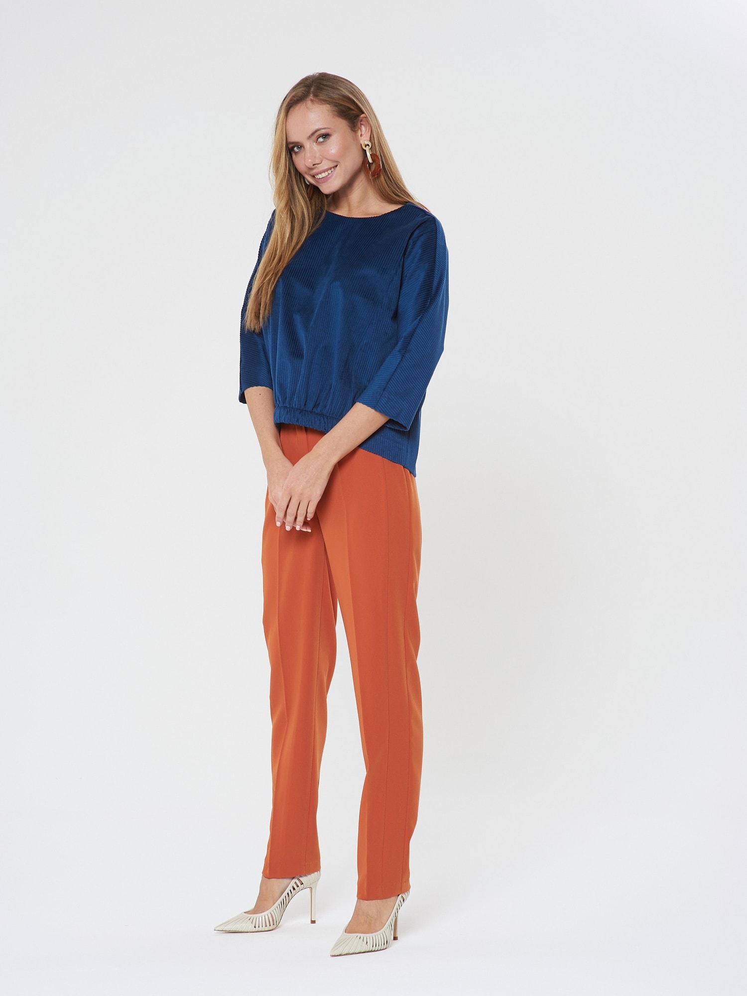 Прямые брюки насыщенного красно-оранжевого цвета. Модель имеет притачной пояс спереди, сзади линия талии собрана на резинку. Карманы расположены по бокам, заутюженные стрелки. Дополните брюки блузкой Д-912 Ш(В20)