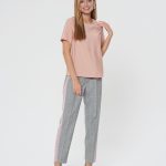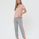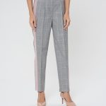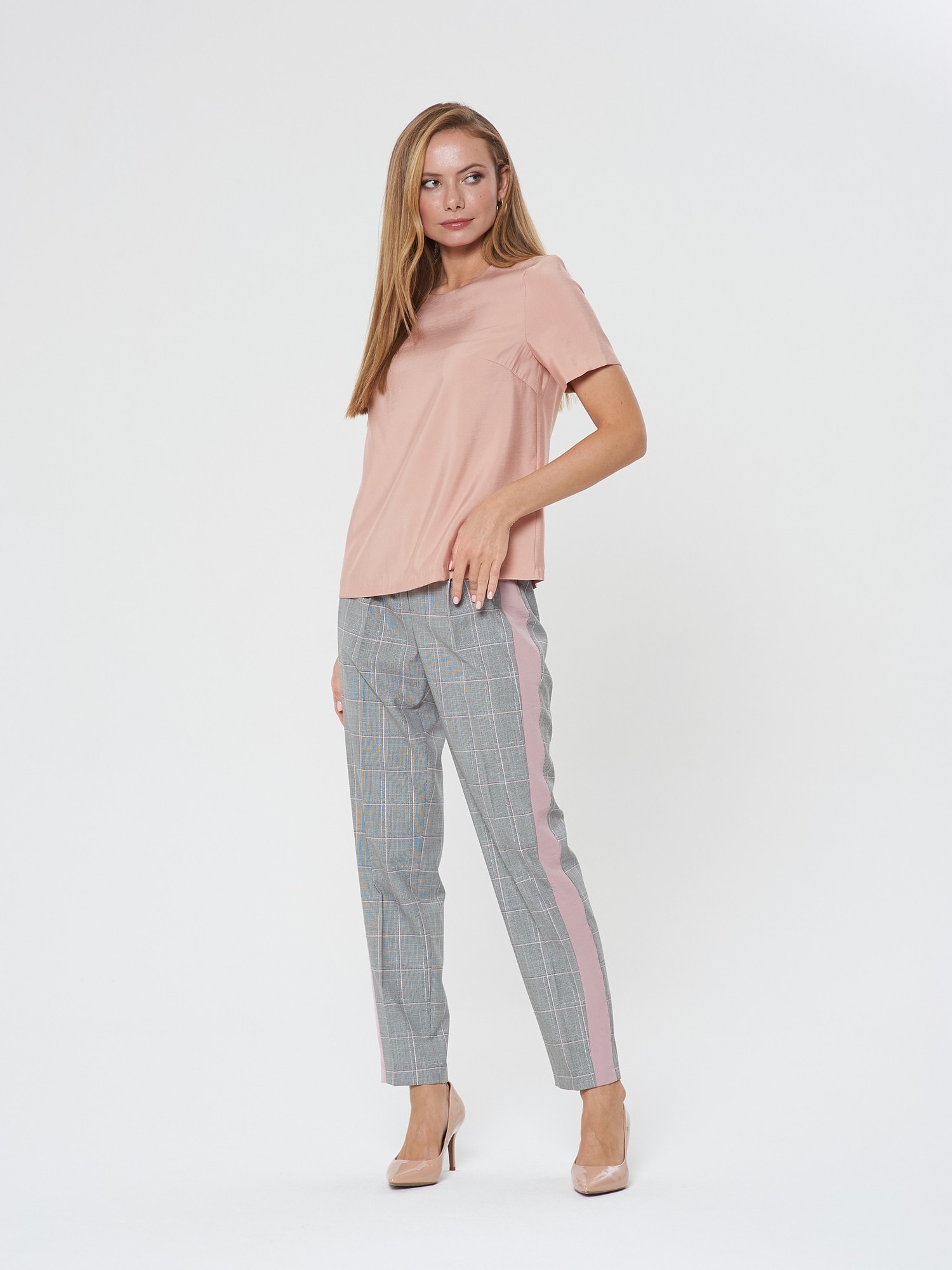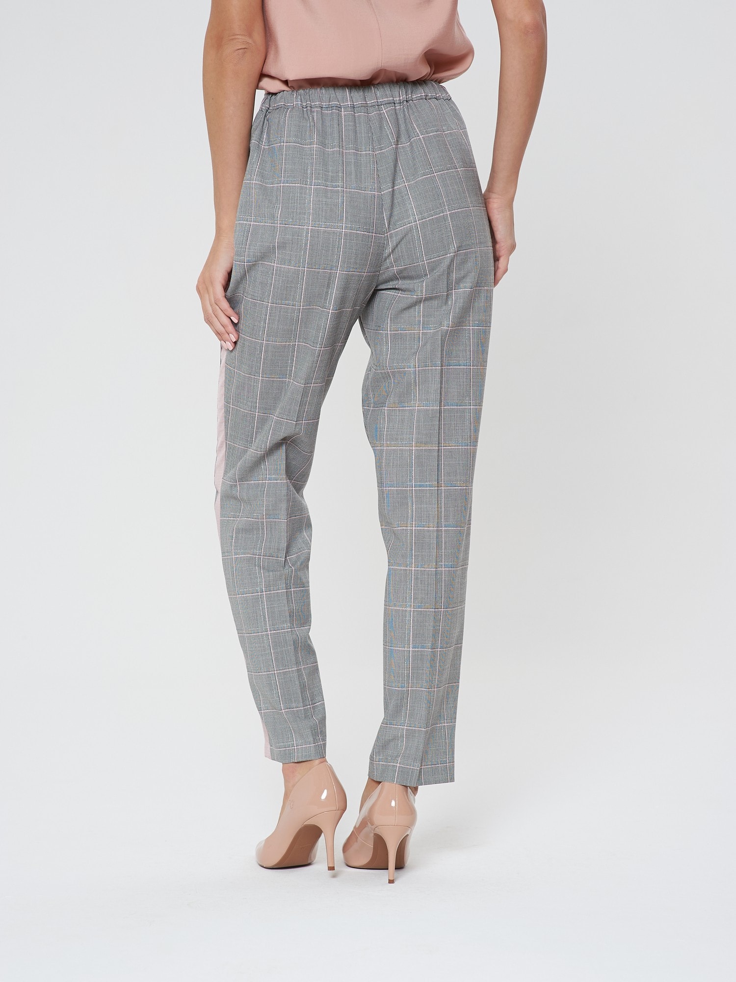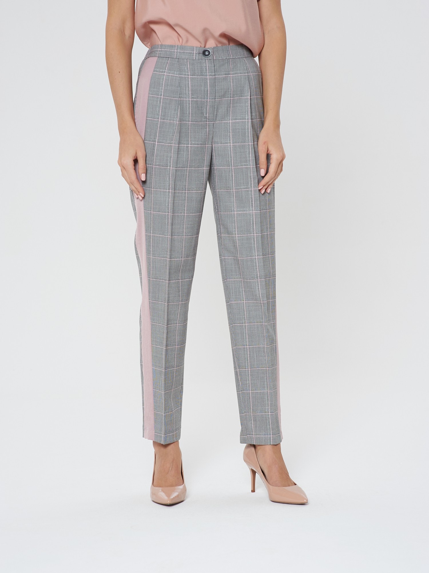 Брюки полуприлегающего силуэта из костюмной ткани в клетку серого цвета с розовыми лампасами и резинкой на талии по спинке. Дополните блузкой Д-810 ТВК3(В20)