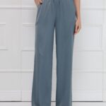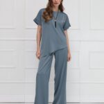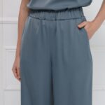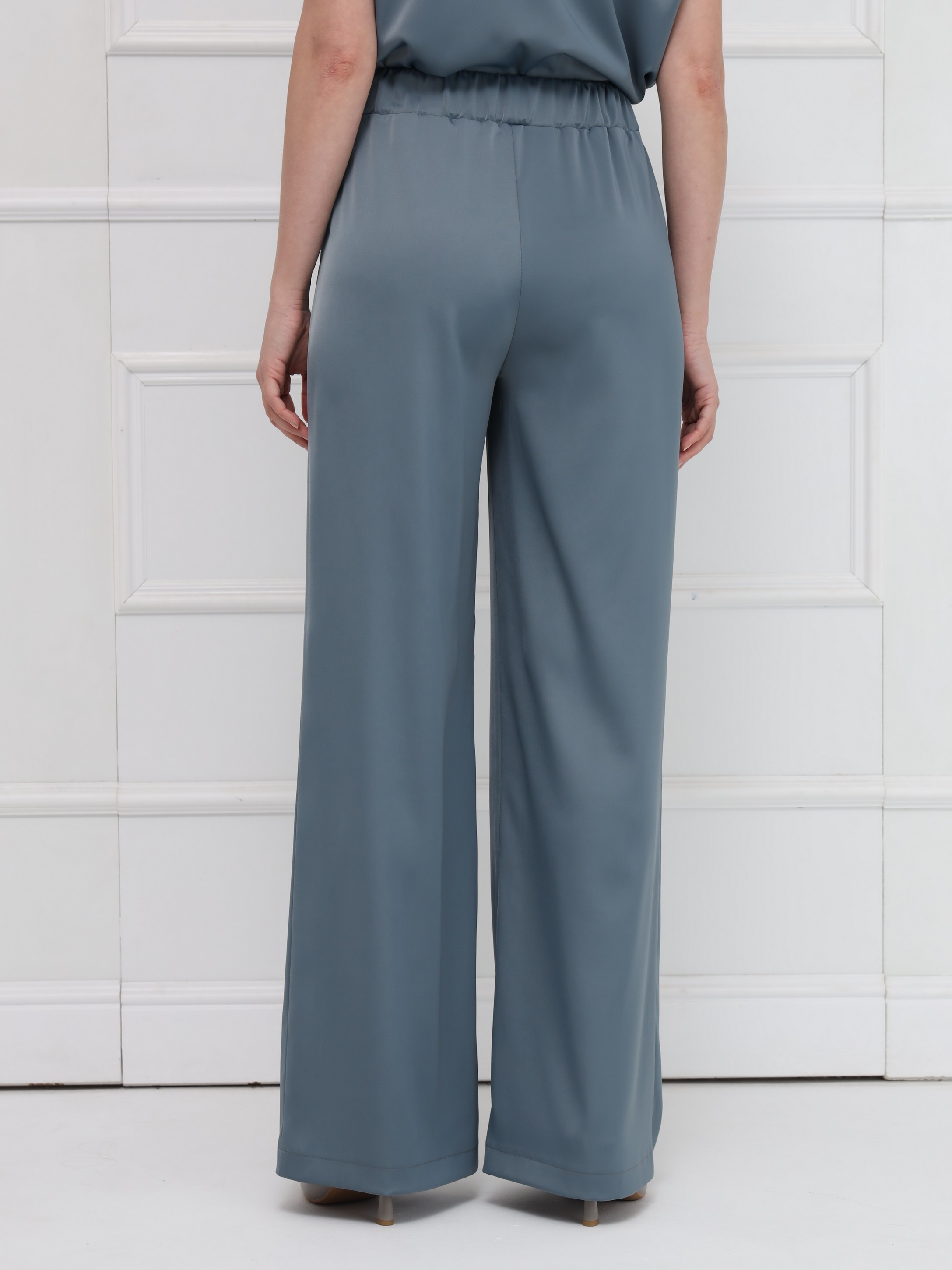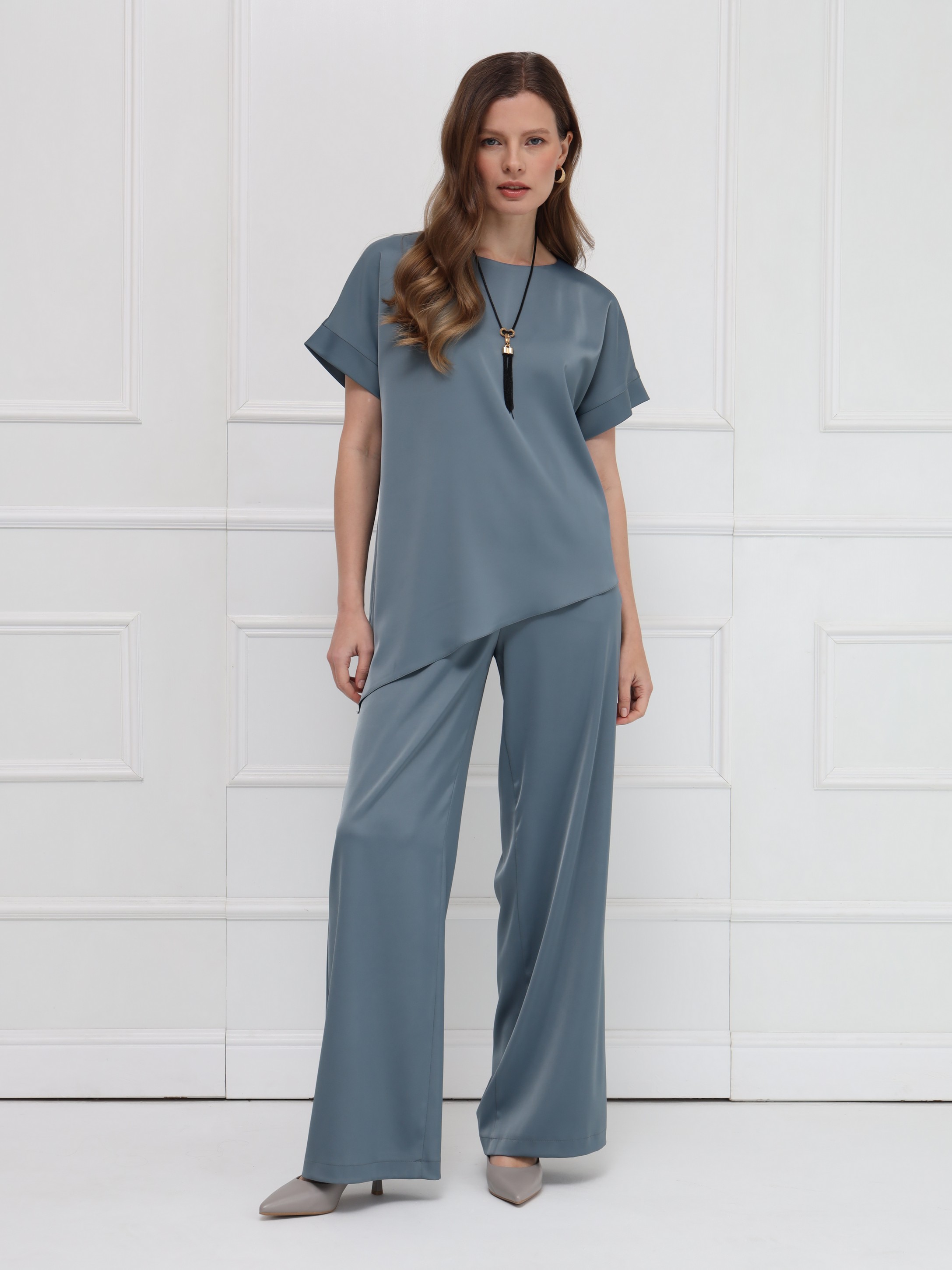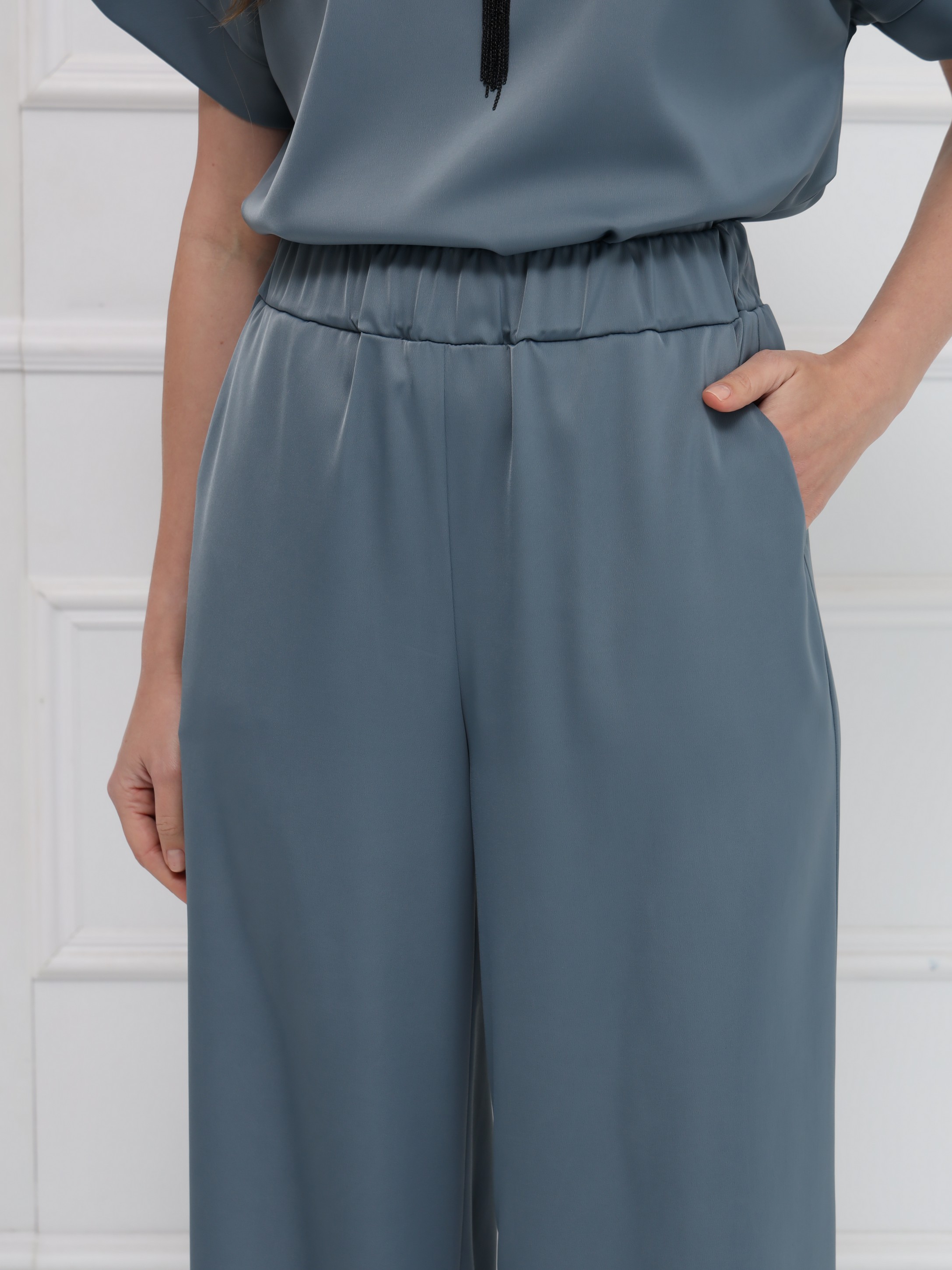 Брюки из атласа широкого кроя создают лёгкий, плавный силуэт и комфорт при движении. Широкий эластичный пояс обеспечивает удобную посадку, а боковые карманы добавляют практичность без потери элегантности. Модель идеально сочетается с блузкой из того же материала или выступает самостоятельным акцентом в продуманном образе. На фото брюки представлены с блузкой Д-2007 ЛНА(В6).