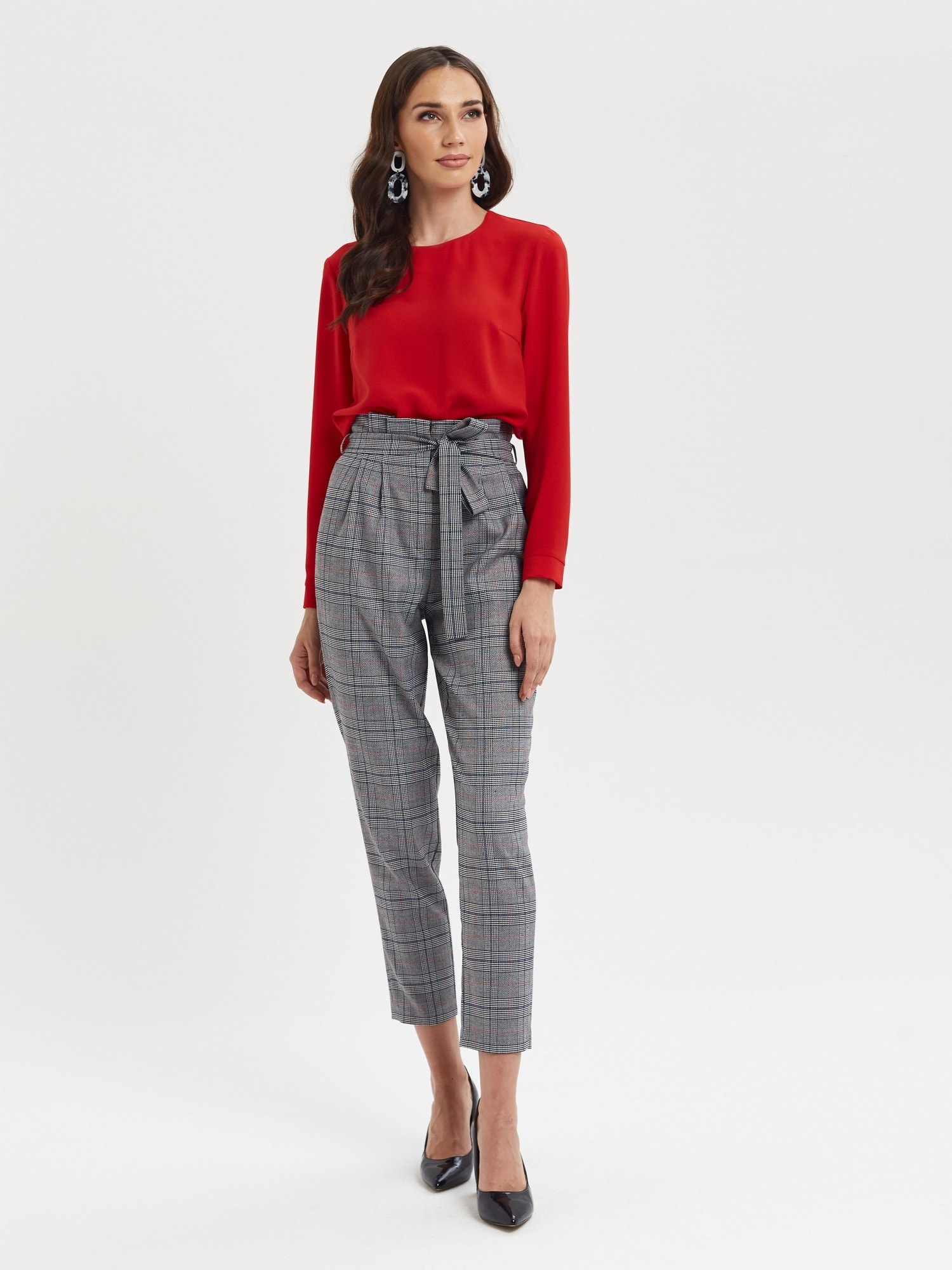 48% вискоза, 48% полиэстер, 4% эластан Размеры 42-52 Рост модели 178 см Брюки в неоклассическом стиле. Модель выполнена из серой клетки "Экстерхази" с цельнокроенным складчатым поясом. На линии талии расположены шлевки для прилагающегося пояса. Такой фасон брюк разнообразит и украсит ваш гардероб новыми формами. Сочетайте с блузкой Д-909 СНГ(О9) и пальто Н-813 Б(О9)