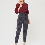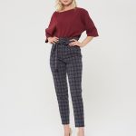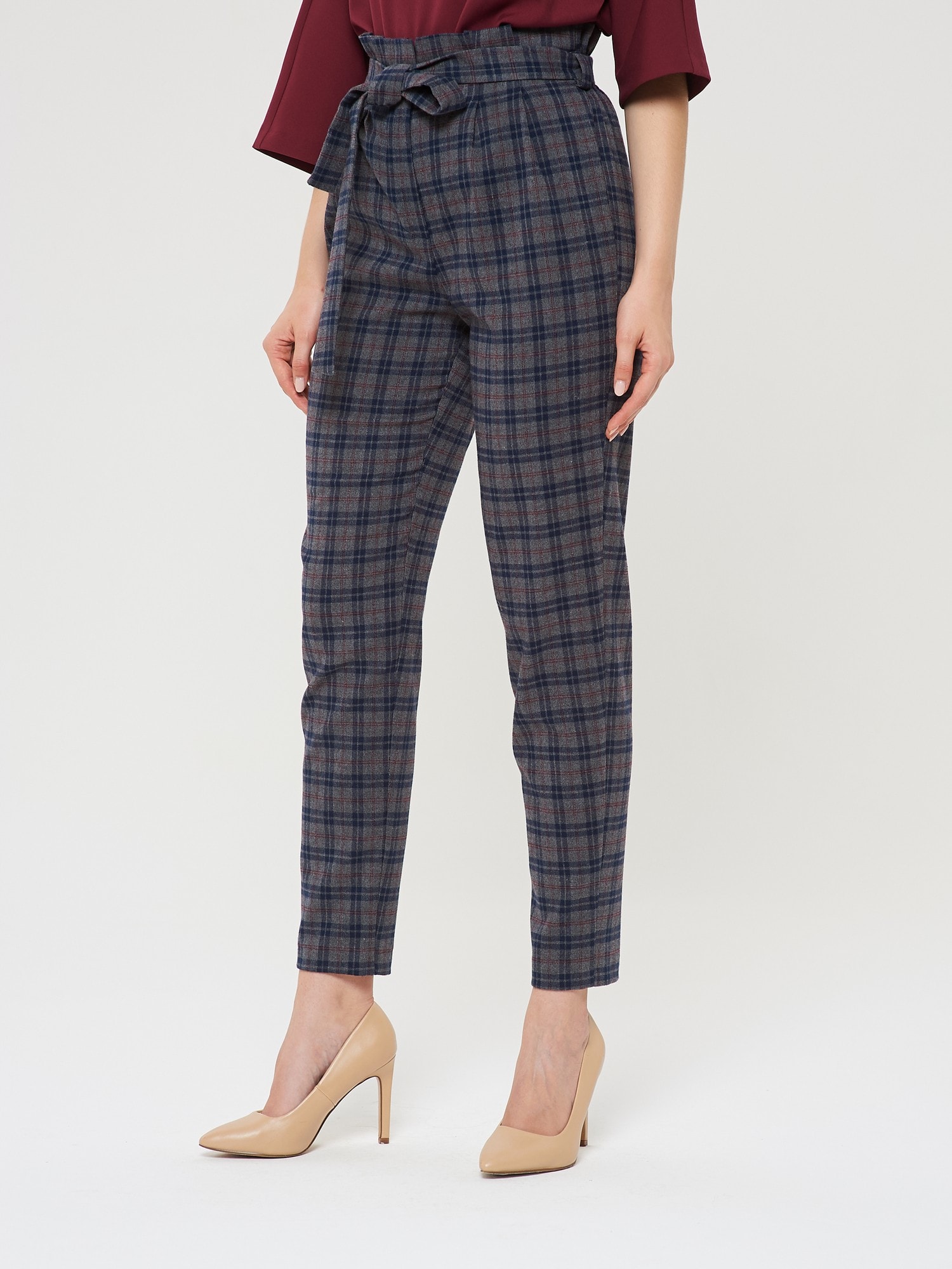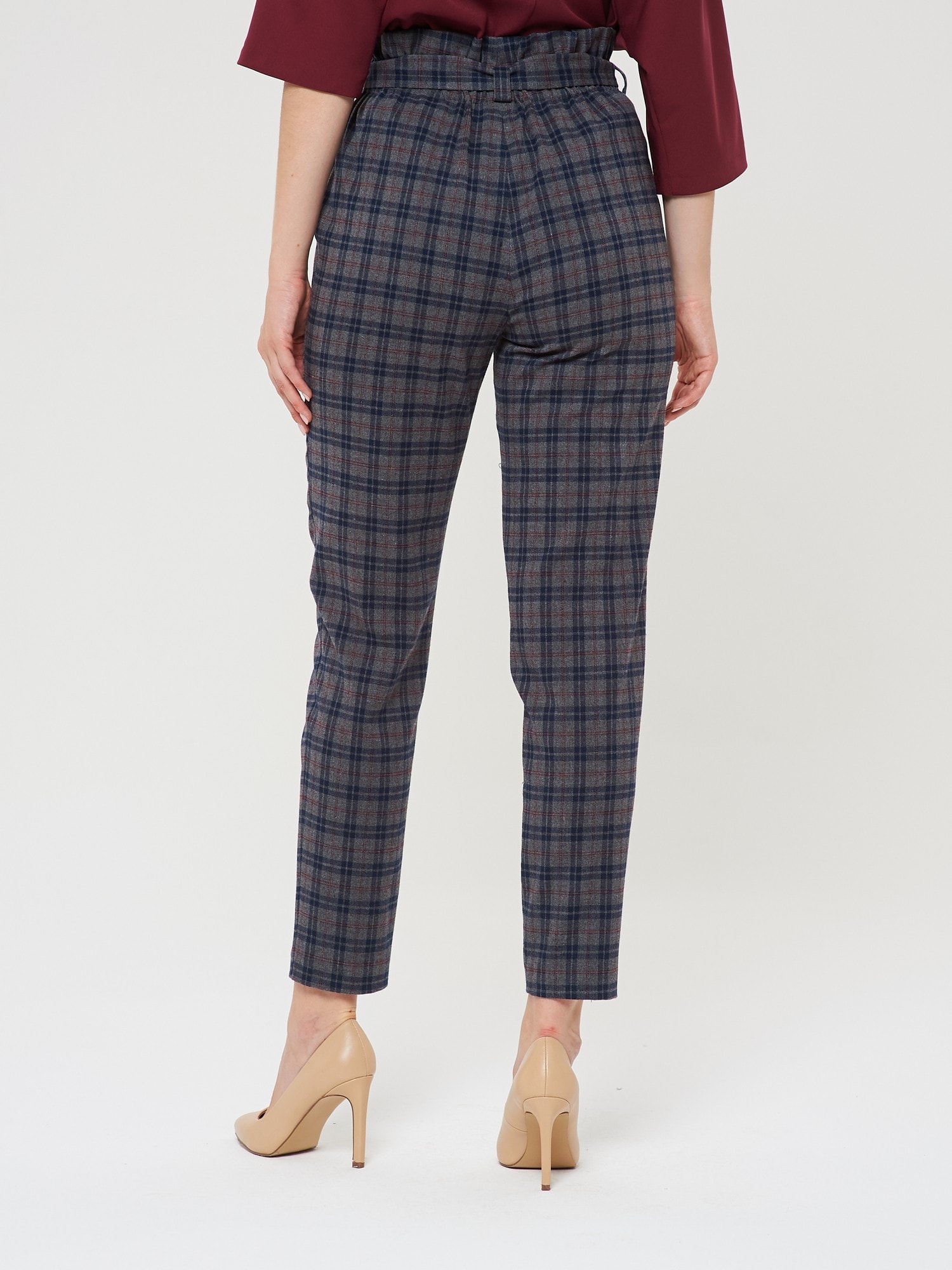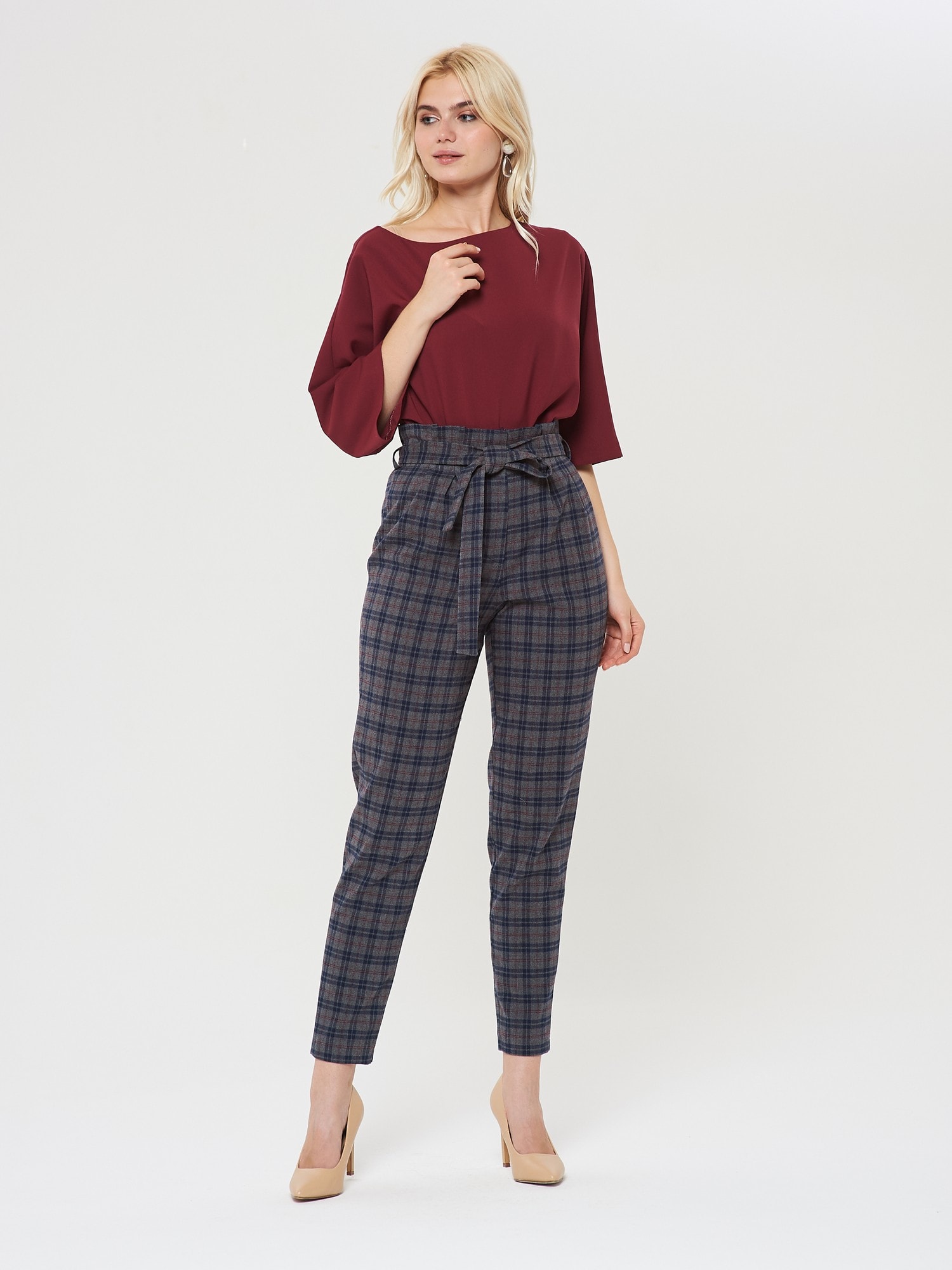 Брюки paper bag садятся идеально на любой тип фигуры и размер. Выполнены из мягкой теплой ткани в сине-бордовую клеточку. Сочетайте с блузкой Д-801 ТБ(О9)