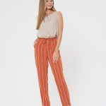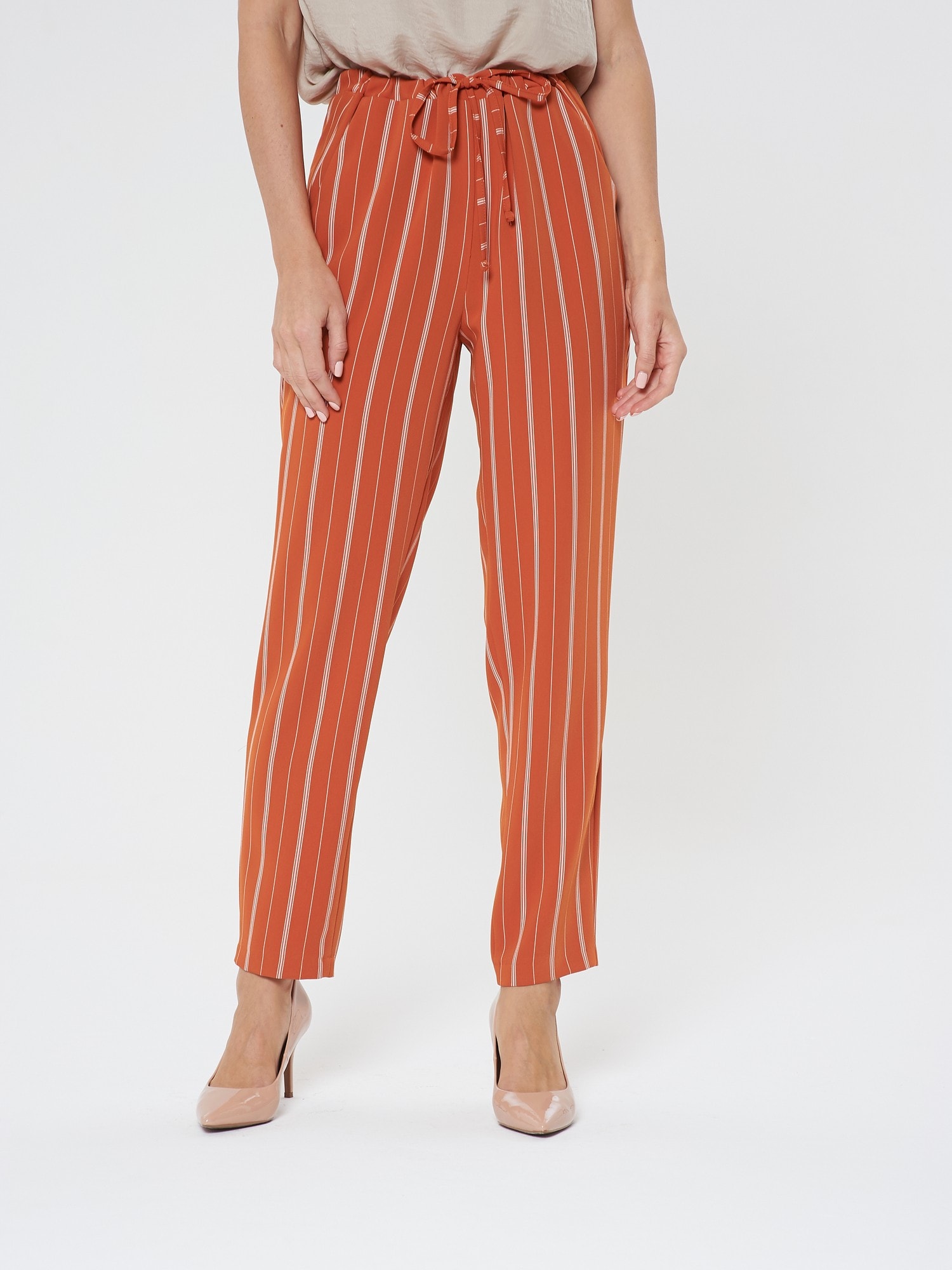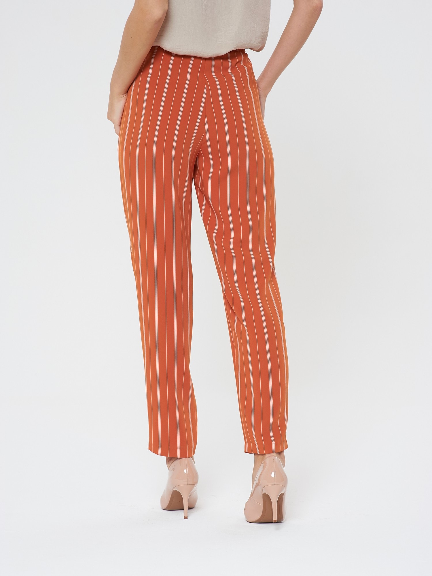 Состав ткани : Вискоза 60%, ПЭ 38%, эластан 2% Рост фотомоделей: 178 см Яркие брюки насыщенного апельсинового цвета в тонкую белую полоску. Пояс с кулиской со шнуровкой, карманы в боковых швах. Такая модель благодаря моделирующемуся поясу не стесняет движения и гарантирует оптимальную посадку. Сочетайте с жакетом В-905 ПКМ(В20) и блузкой Д-931 КР(В20)