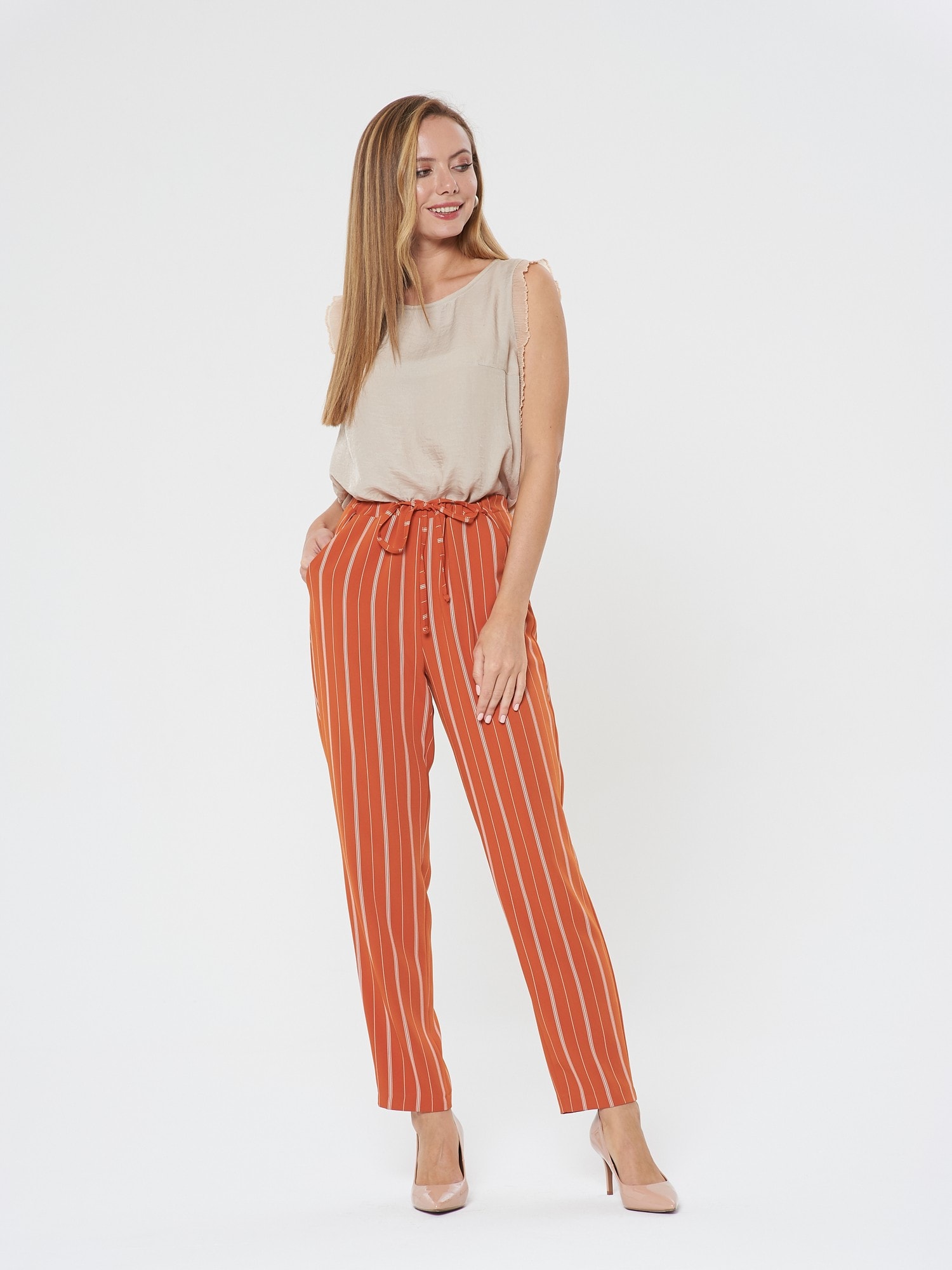Состав ткани : Вискоза 60%, ПЭ 38%, эластан 2% Рост фотомоделей: 178 см Яркие брюки насыщенного апельсинового цвета в тонкую белую полоску. Пояс с кулиской со шнуровкой, карманы в боковых швах. Такая модель благодаря моделирующемуся поясу не стесняет движения и гарантирует оптимальную посадку. Сочетайте с жакетом В-905 ПКМ(В20) и блузкой Д-931 КР(В20)