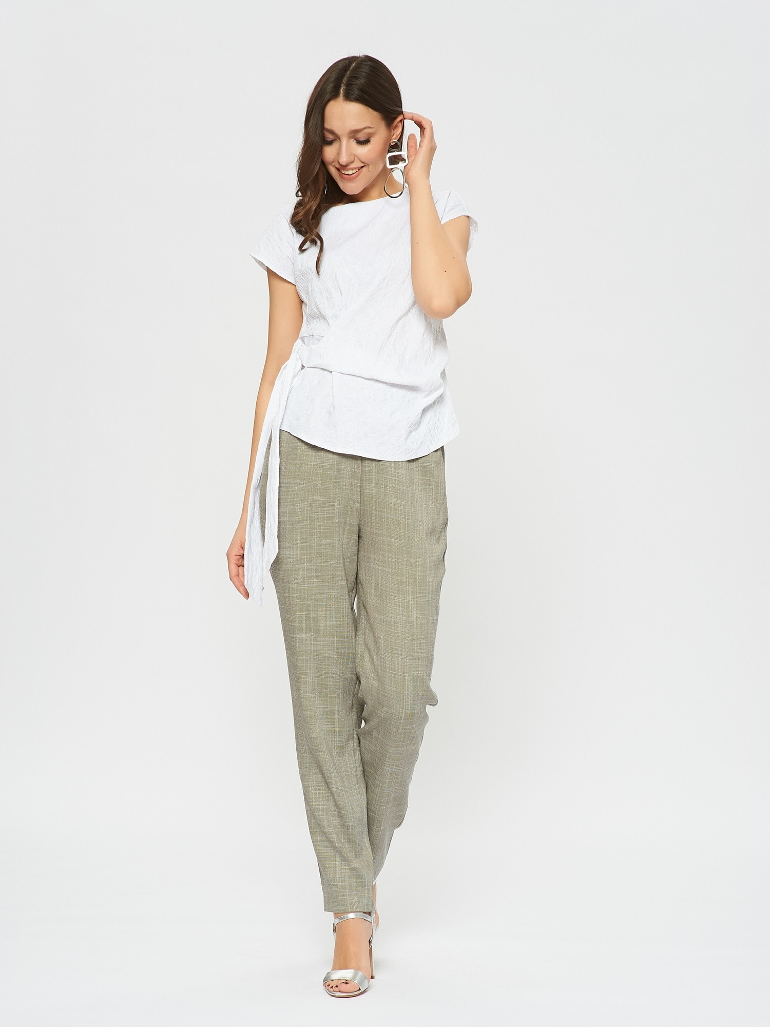 Прямые брюки серого оттенка из фактурной ткани. Пояс на резинке, без гульфика. Дополните образ жакетом В-909 ГРИ(В20) и блузкой Д-927 МУН(В20)