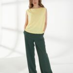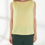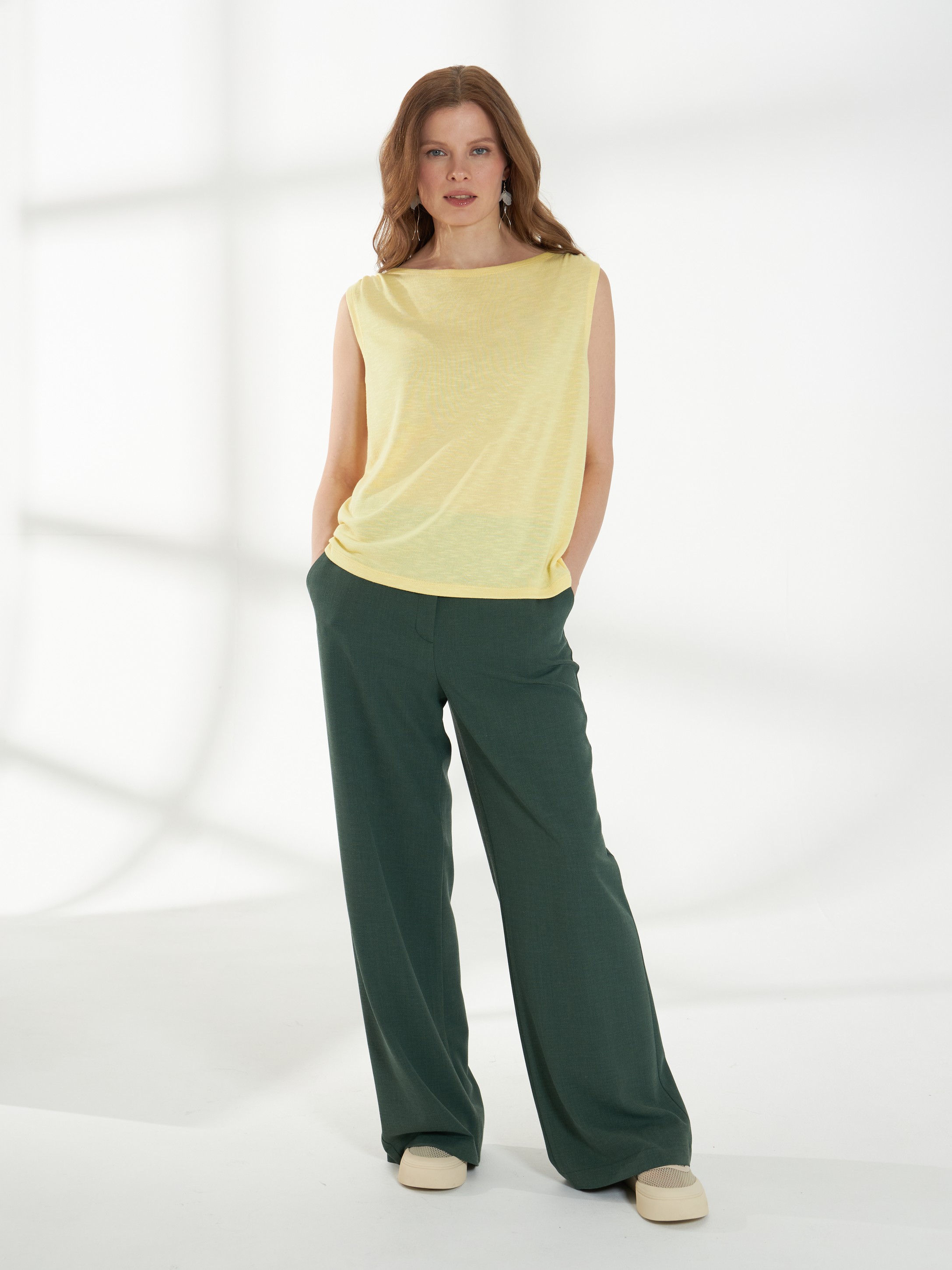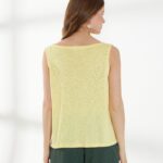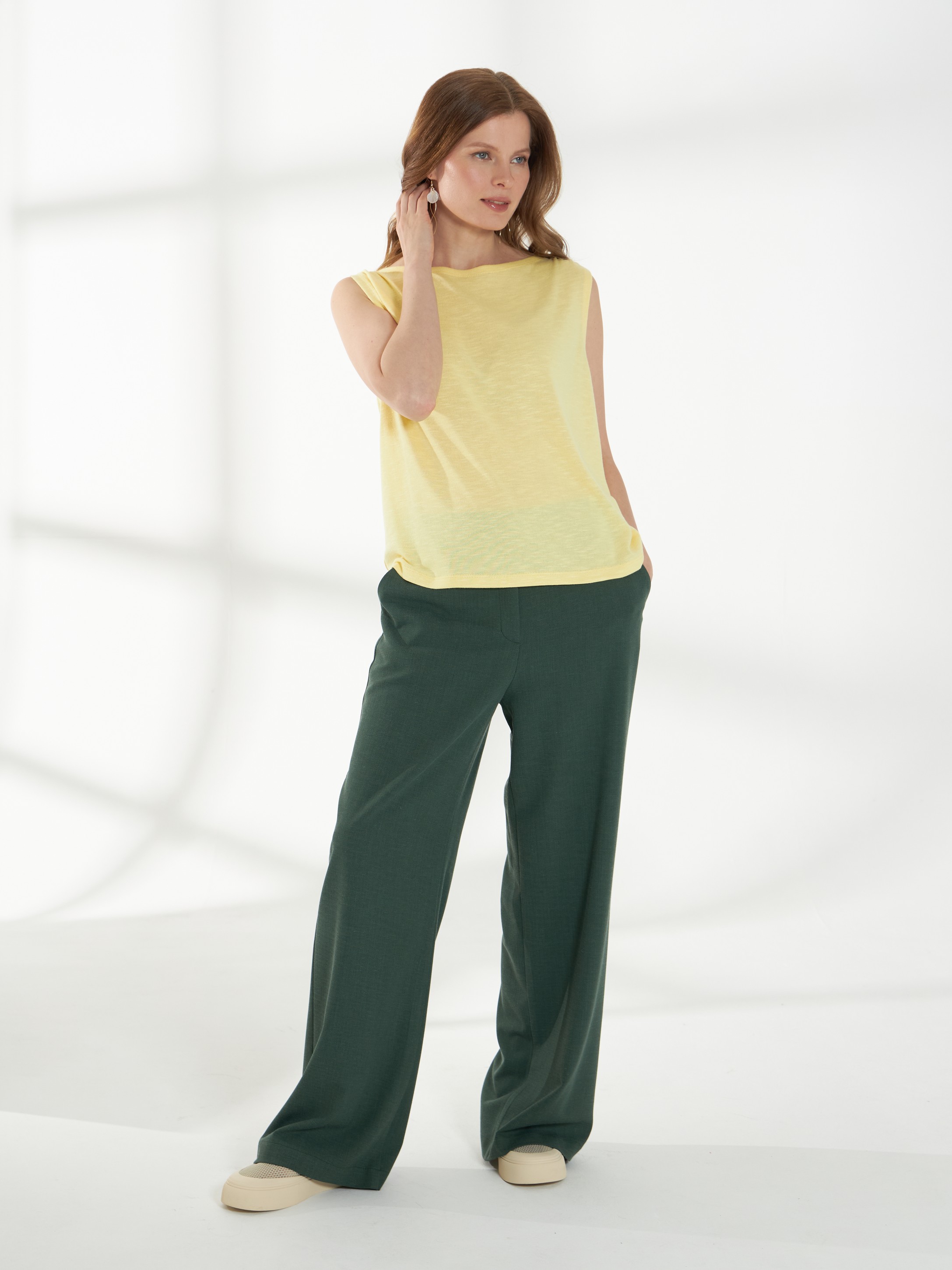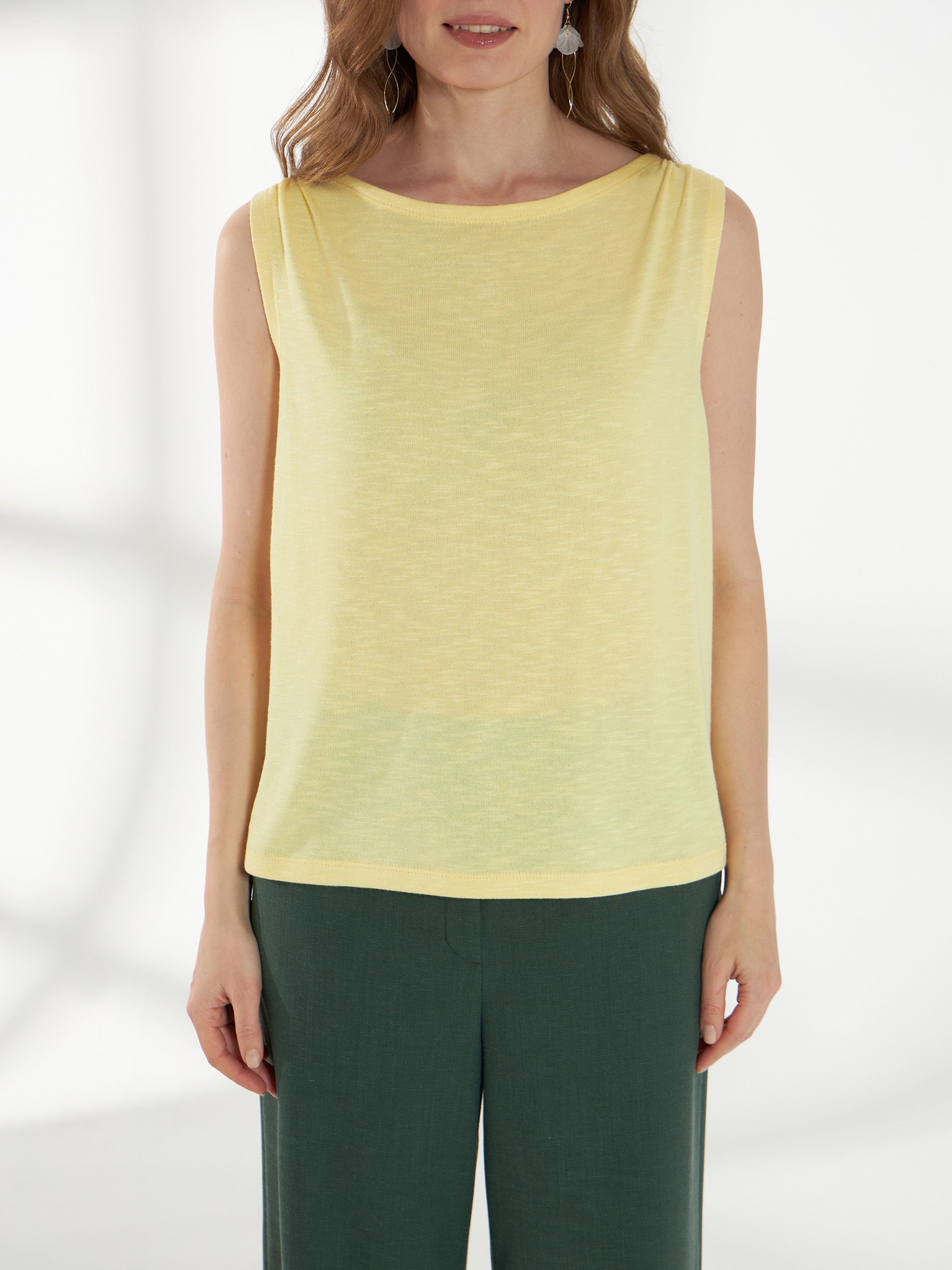 Легкий джемпер -майка, свободного кроя, без рукавов выполнен из тонкого трикотажа сочного желтого оттенка. Спереди по плечам выполнена аккуратная сборка, которая добавляет мягкую фактурную деталь. Модель идеально подходит для создания легких и воздушных образов. На фото джемпер представлен с блузкой Д-263 ФЛО(В6) и брюками Б-2047 ФЛО(В6).