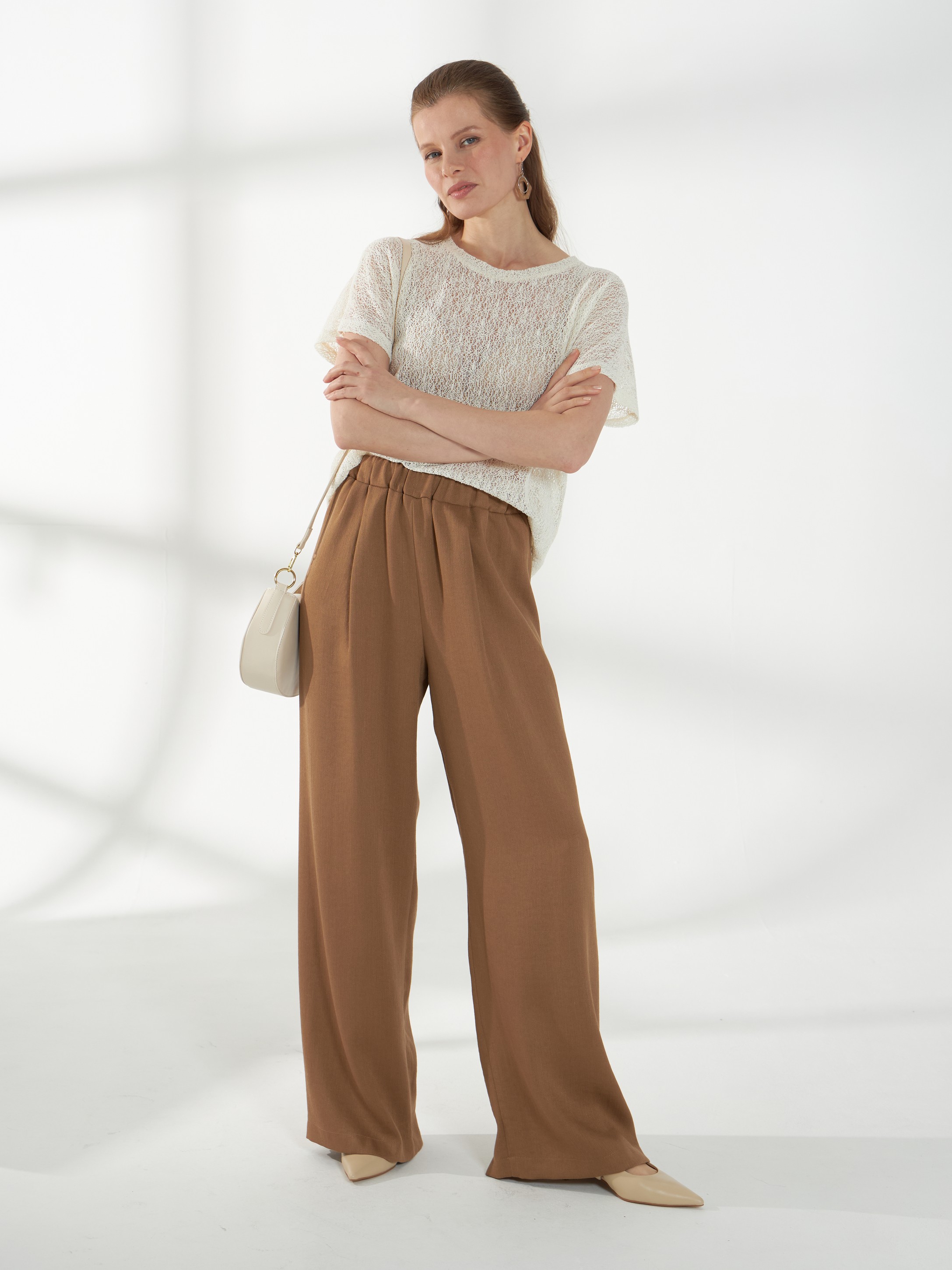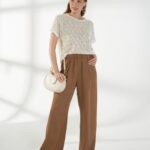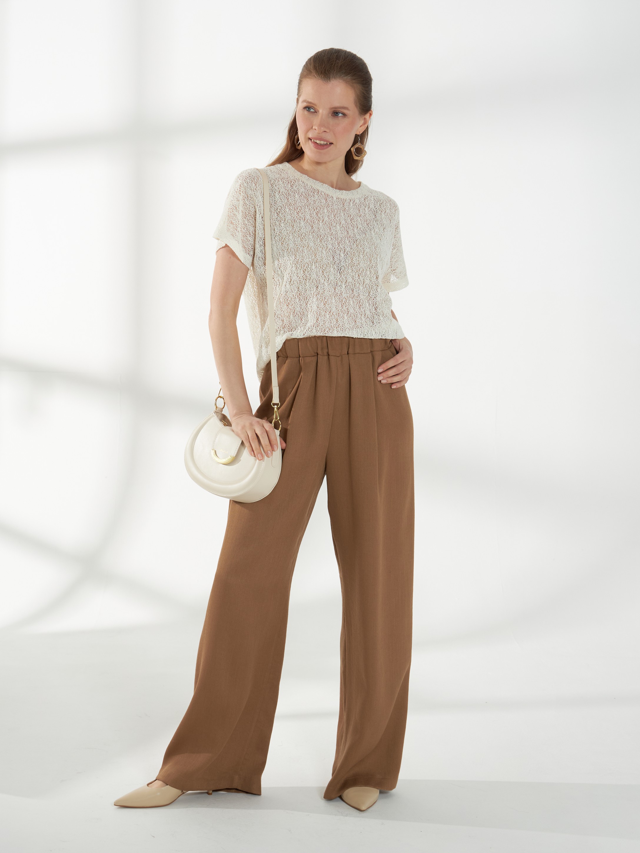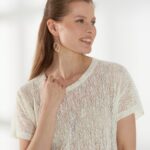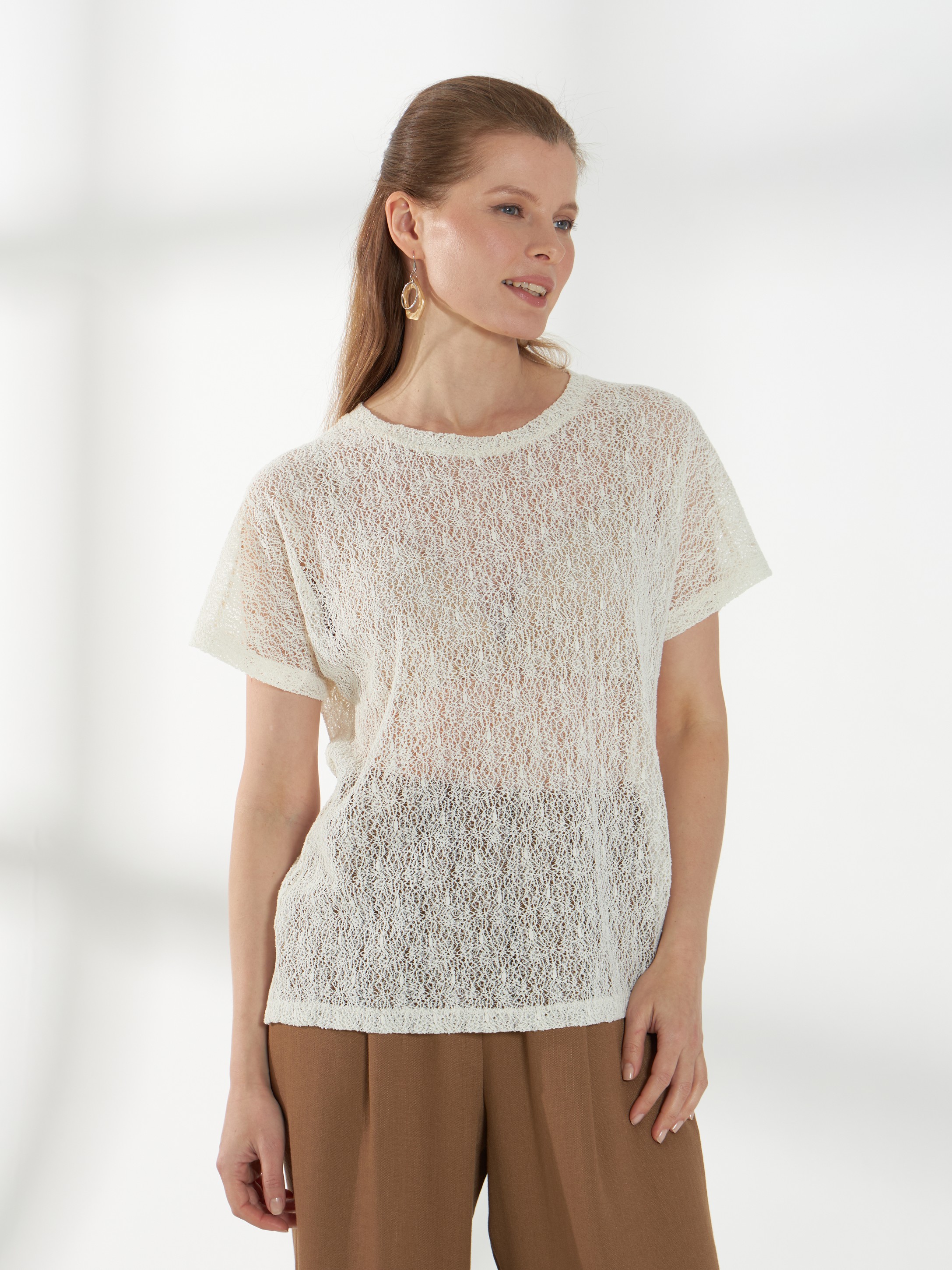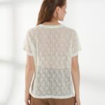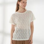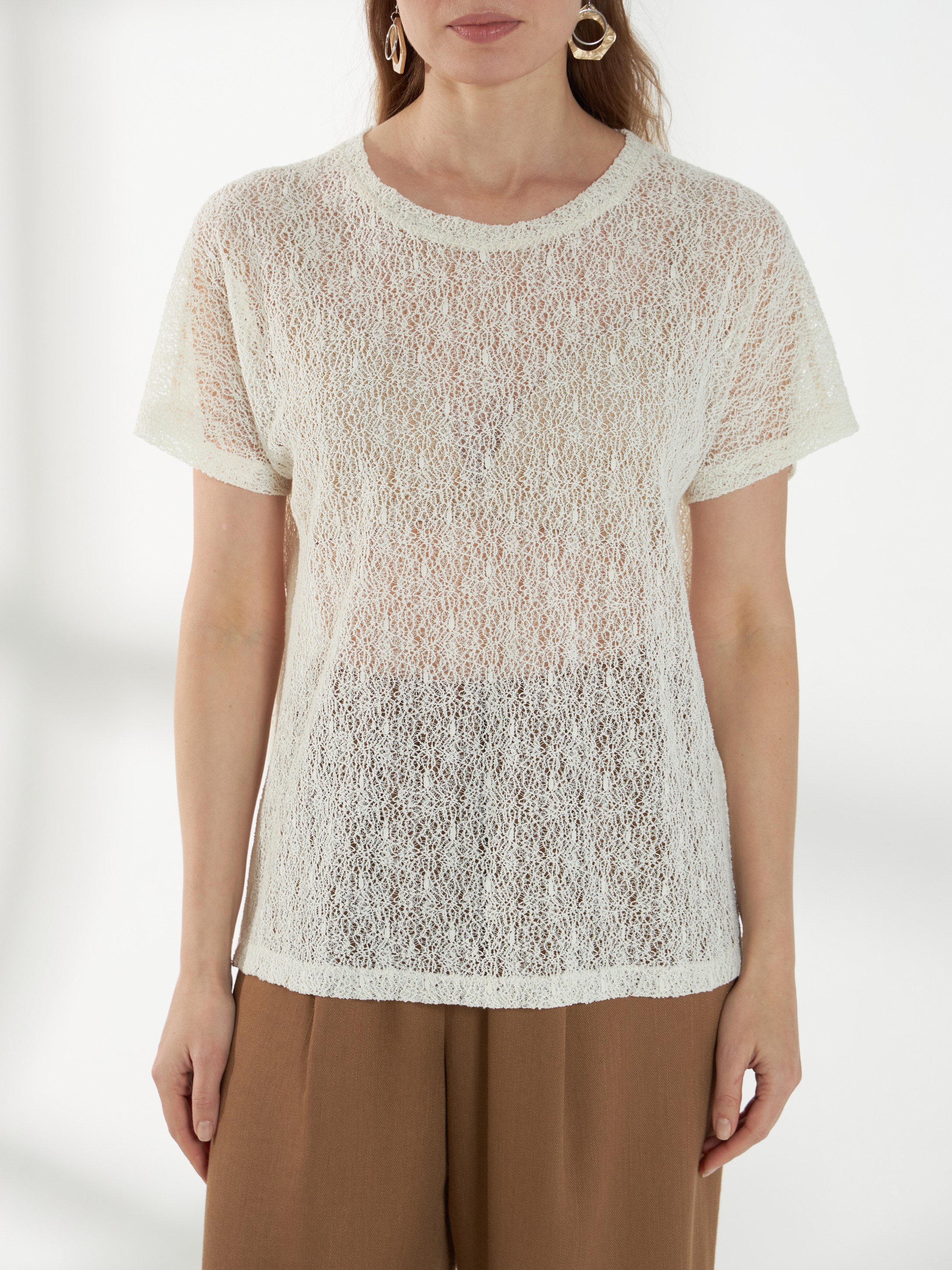 Нежный джемпер с короткими цельнокроеными рукавами и круглой горловиной, выполненный из молочного кружевного трикотажа. Полупрозрачная и лёгкая фактура делает модель комфортной и универсальной базой для летних образов.