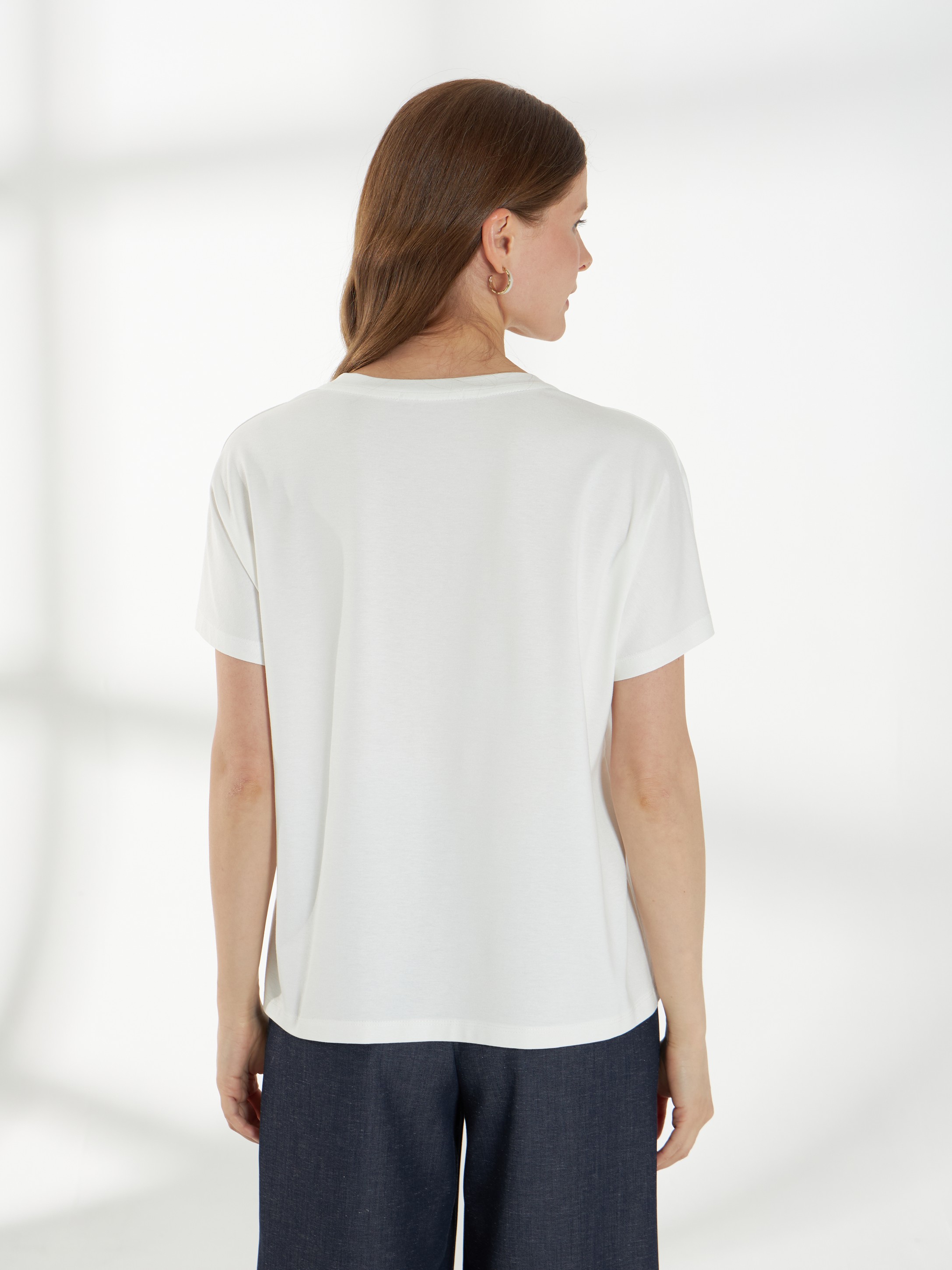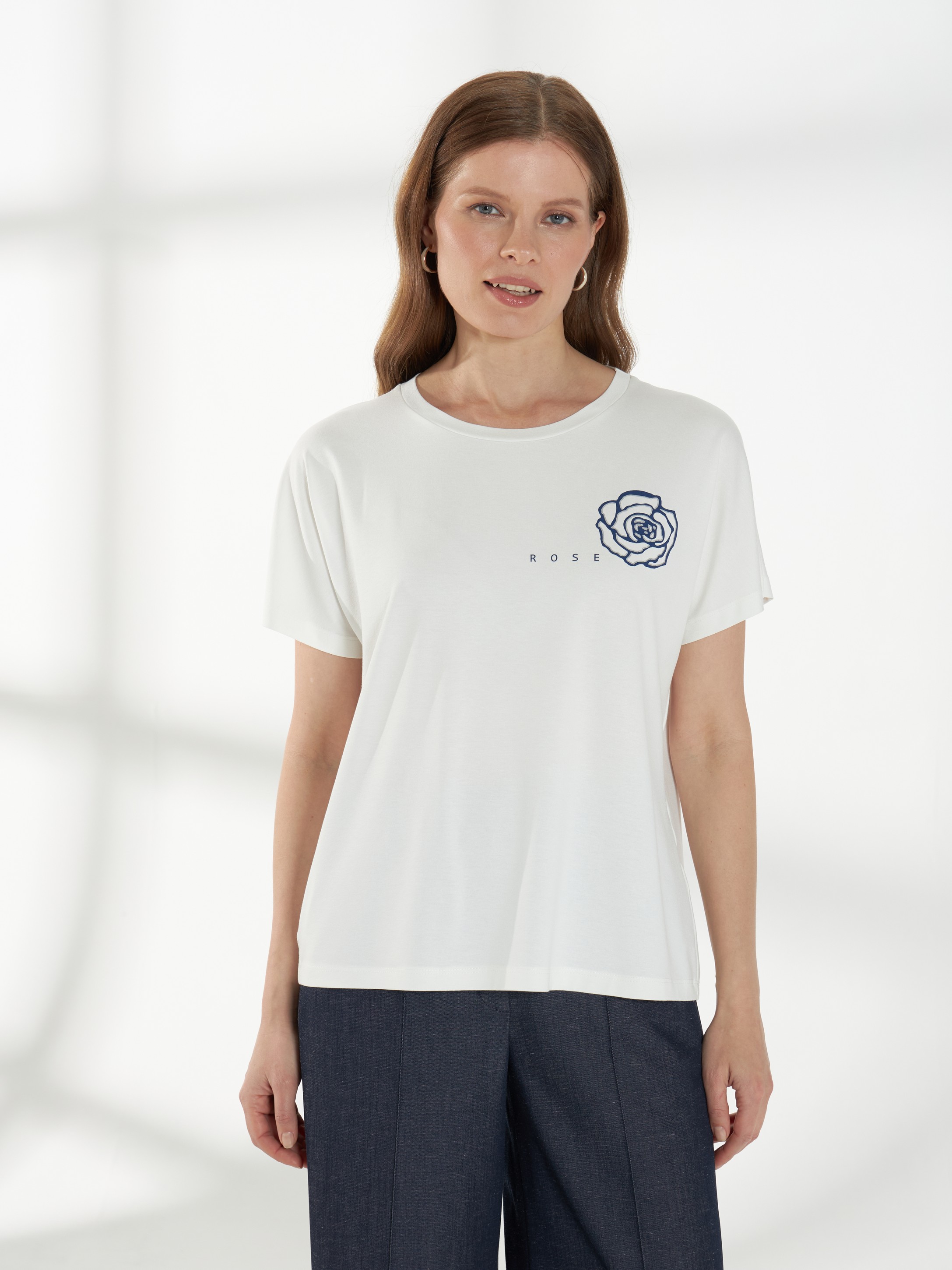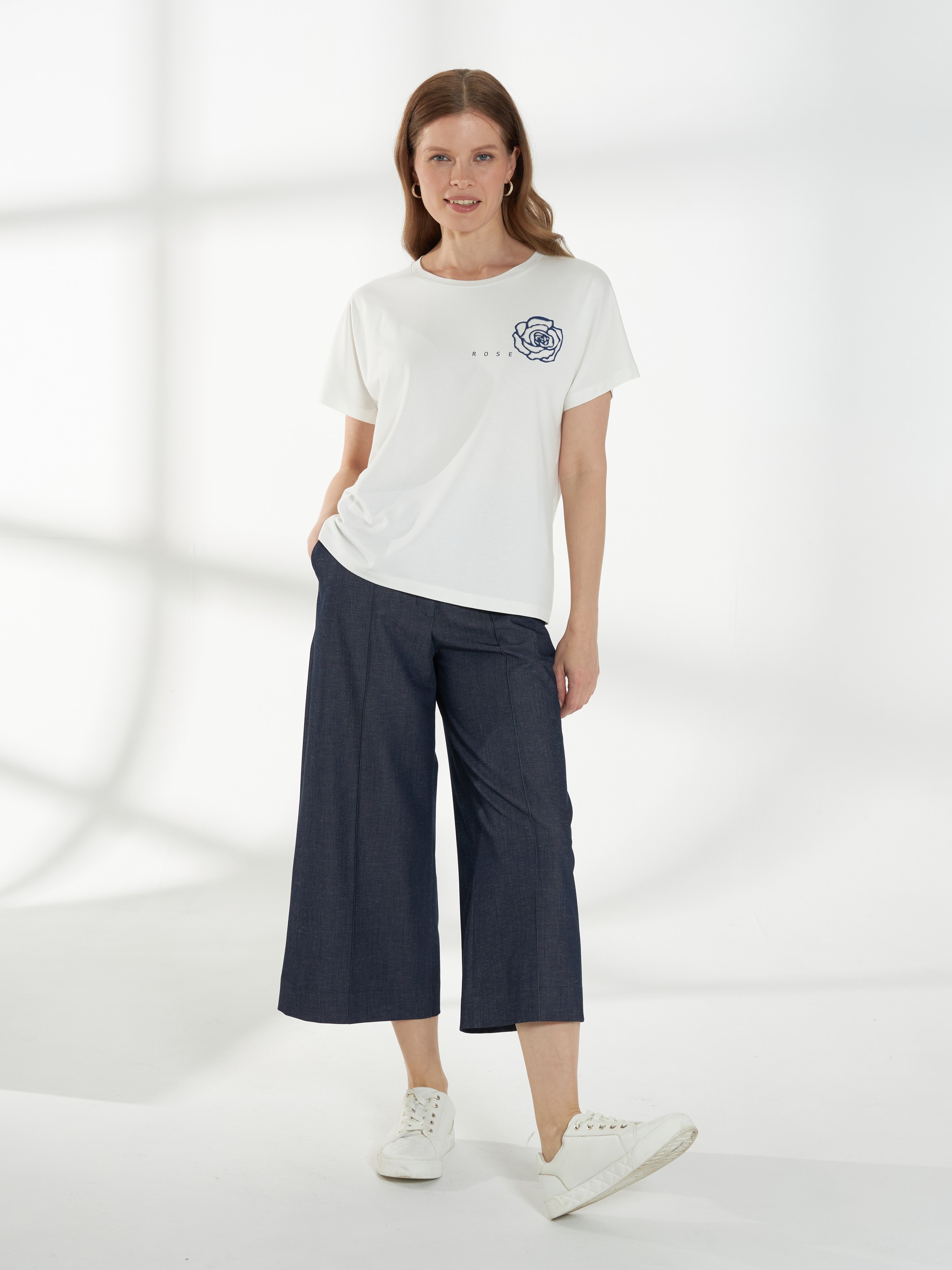 Лаконичный джемпер из мягкого вискозного трикотажа, приятного к телу и комфортного в носке. Свободная посадка и цельнокроеный рукав создают мягкий, плавный силуэт. Овальная горловина аккуратно оформляет линию шеи. Слева расположен деликатный принт «Роза», который добавляет образу женственности и ненавязчивого акцента. На фото джемпер представлен с А-2029 ДКС(В6) и брюками Б-2054 ДКС(В6).