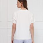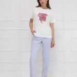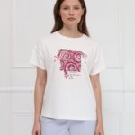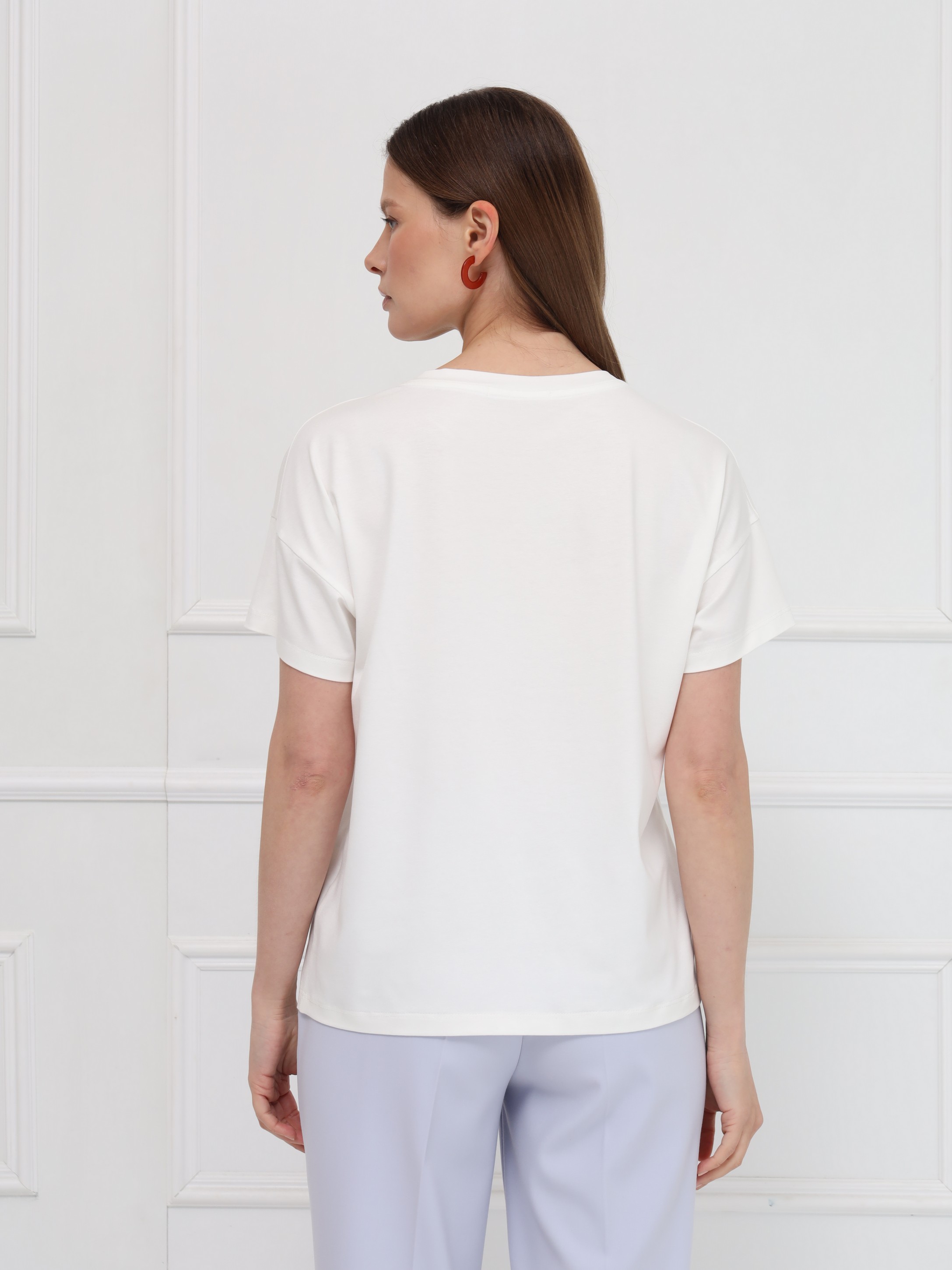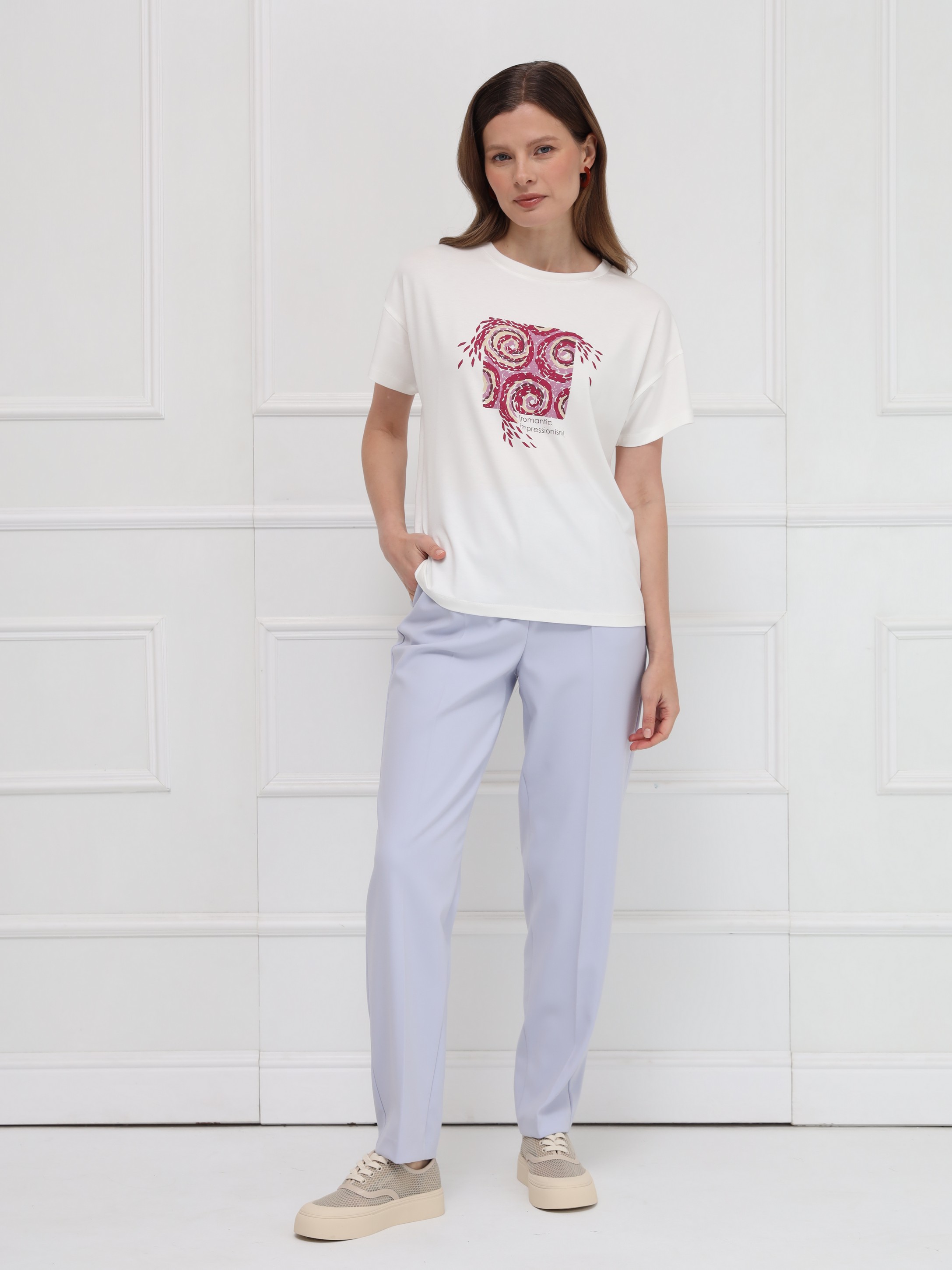 Джемпер с короткими рукавами и круглой горловиной, украшен дизайнерским принтом, вдохновлённым работами импрессионистов. Вихрь тонких, живописных мазков оживляет тонкий вискозный трикотаж. Модель прекрасно дополняет костюмы в светлых оттенках, придавая образу утончённость, художественную глубину и сияющее настроение. На фото джемпер представлен с брюками Б-802 ЛАС(В6).