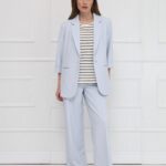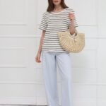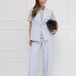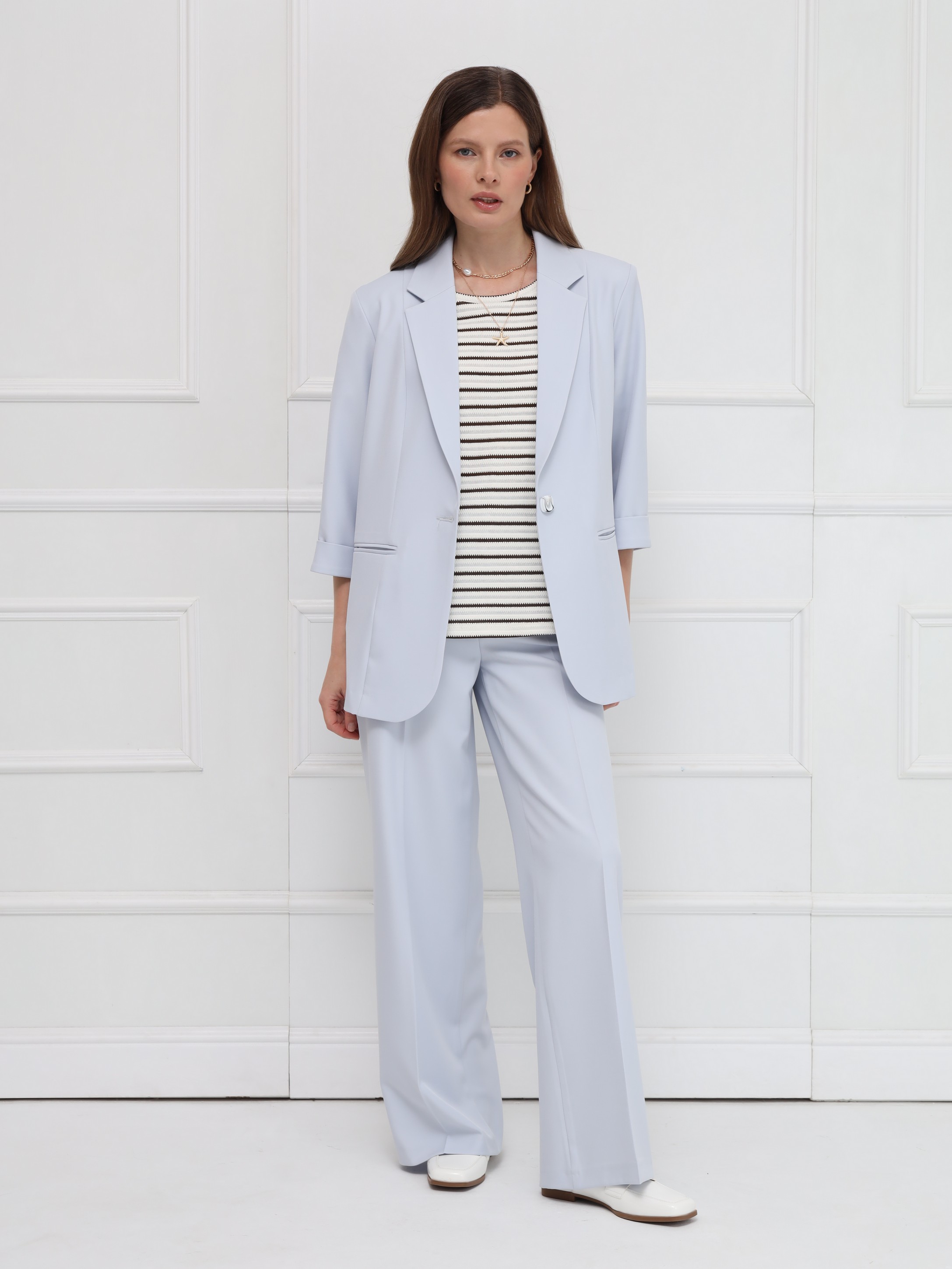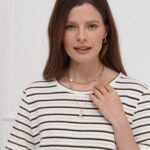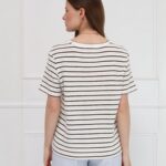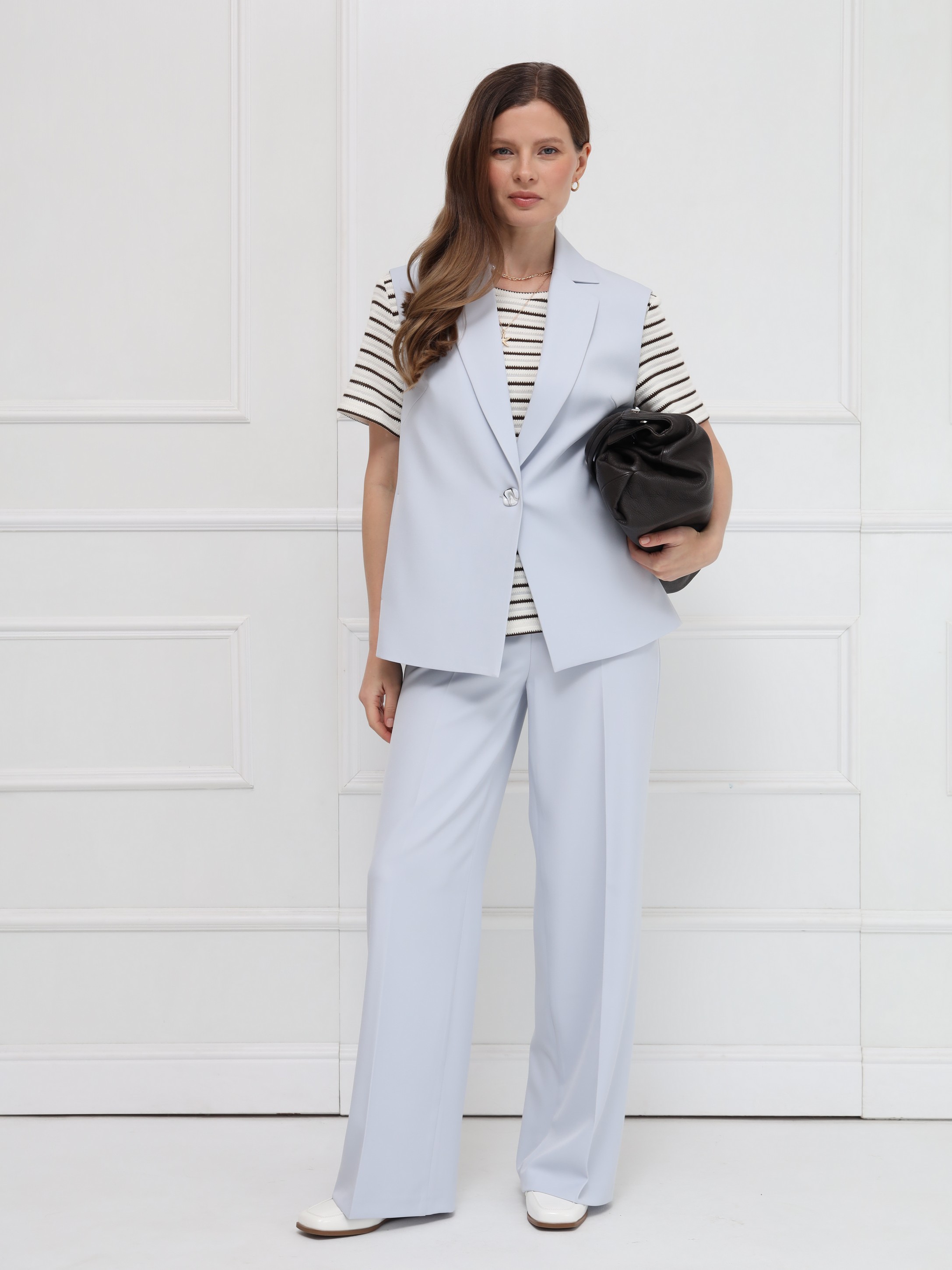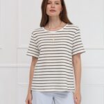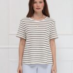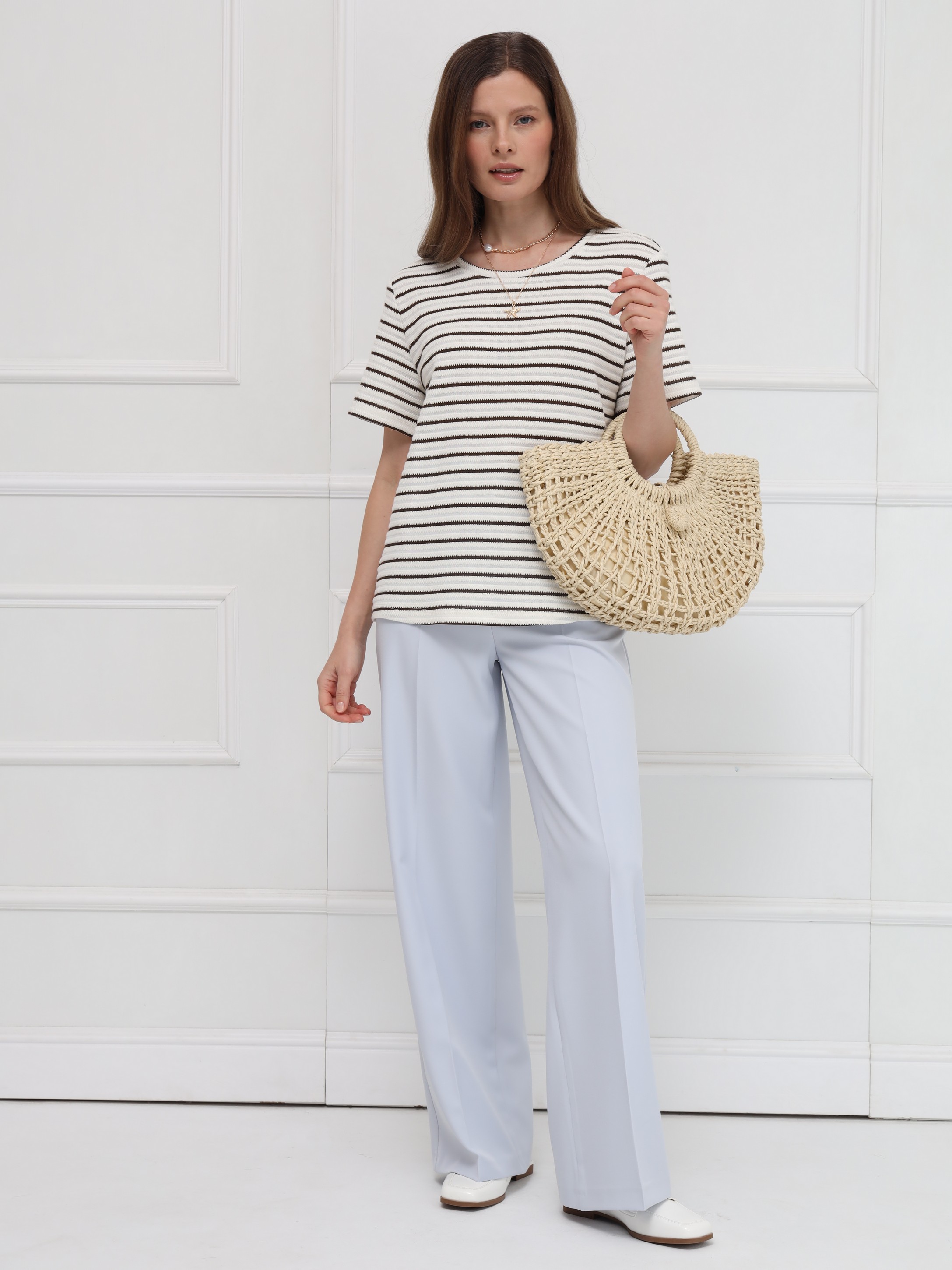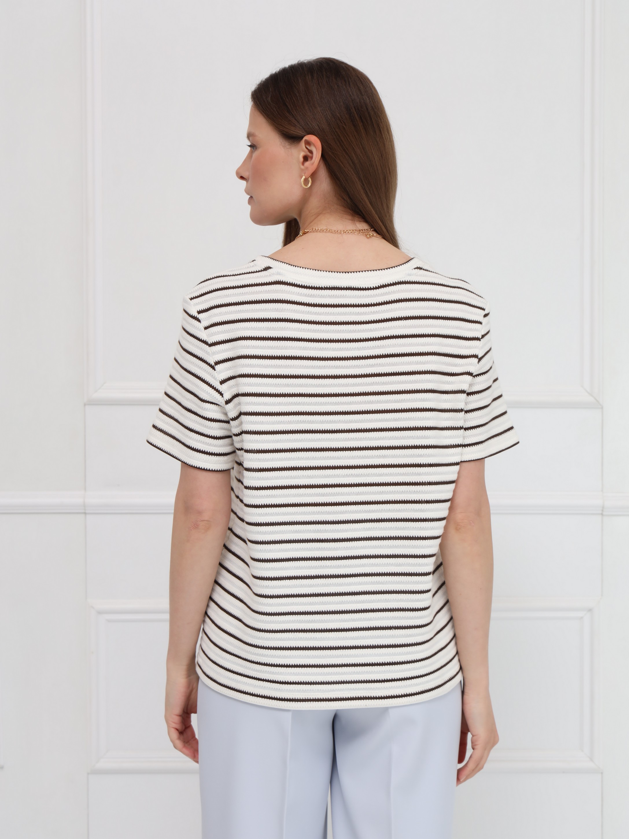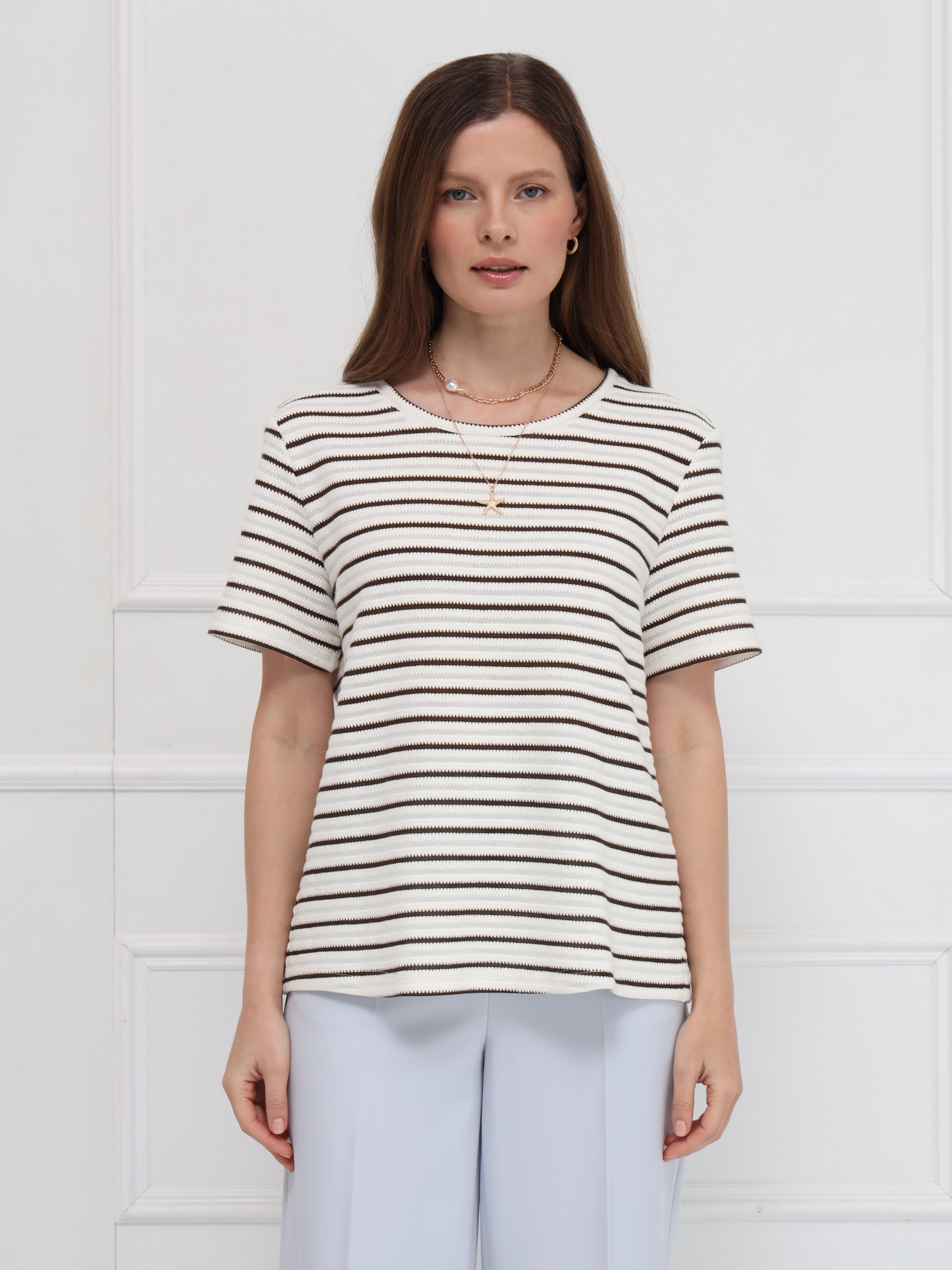 Лёгкий трикотажный джемпер из хлопка, с необычной фактурой, где почти прозрачные нити переплетаются с тёплыми коричневыми и молочными полосками, создавая интересный и мягкий визуальный эффект. Модель с короткими рукавами, овальной горловиной и прямым силуэтом дарит комфорт и свободу движений, легко сочетаясь с любым повседневным гардеробом. На фото джемпер представлен с жилетом В-99 ПДВ(В6) и брюками Б-2047 ПДВ(В6).