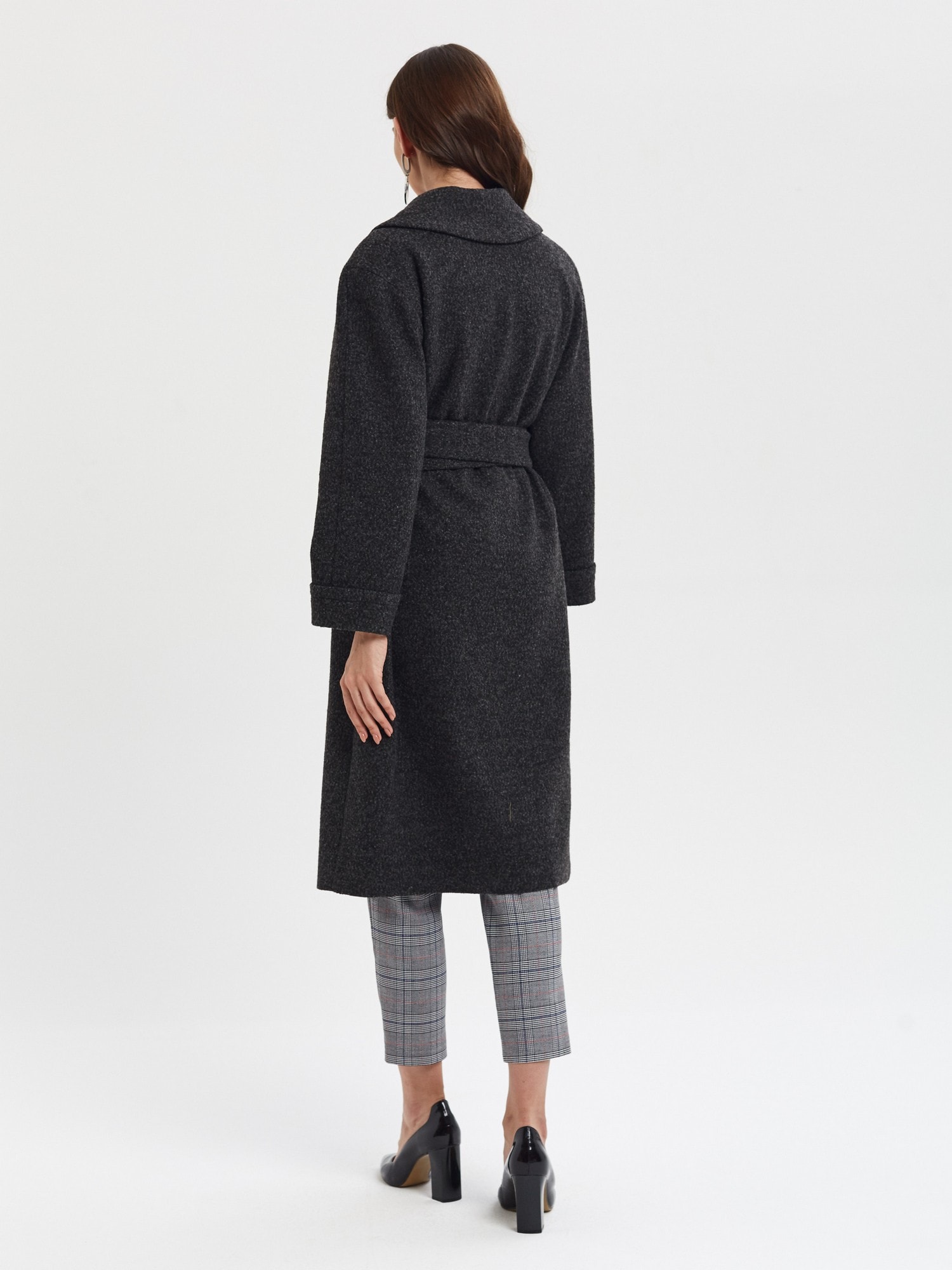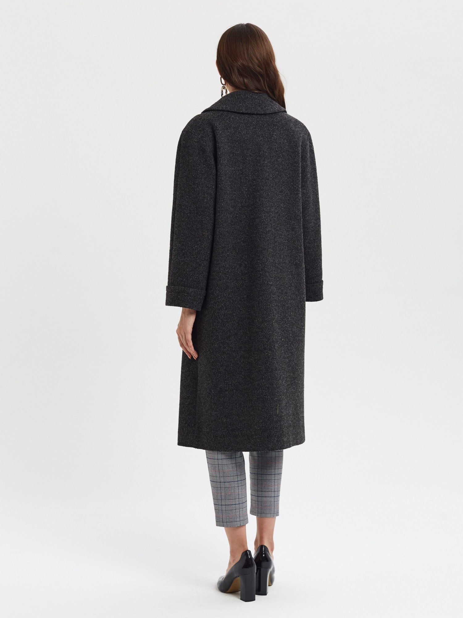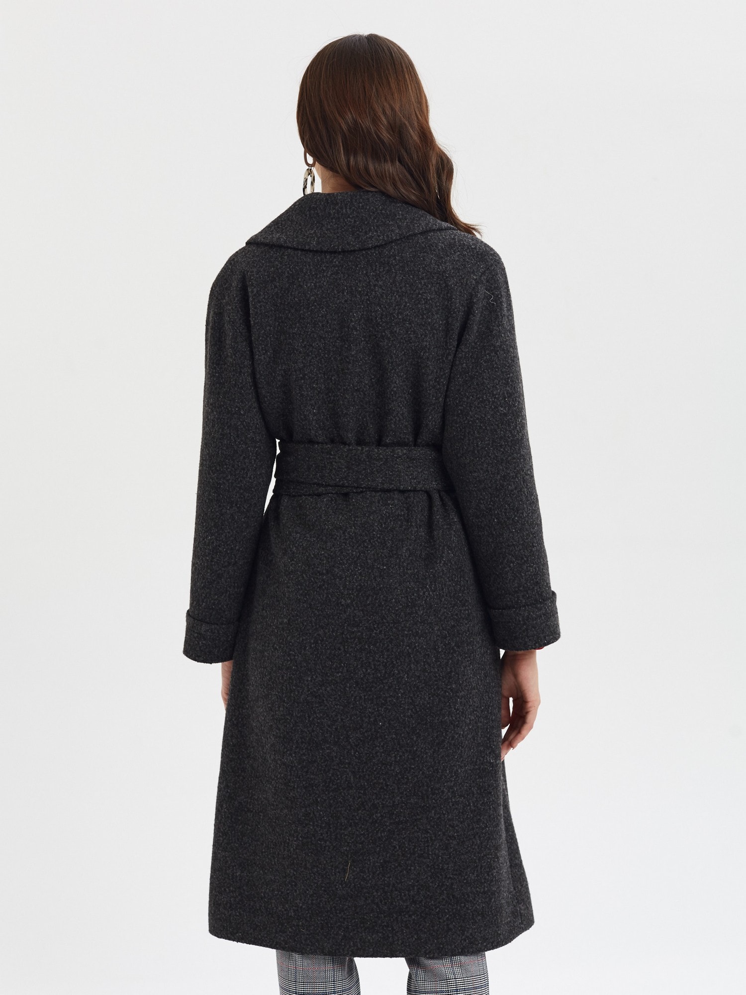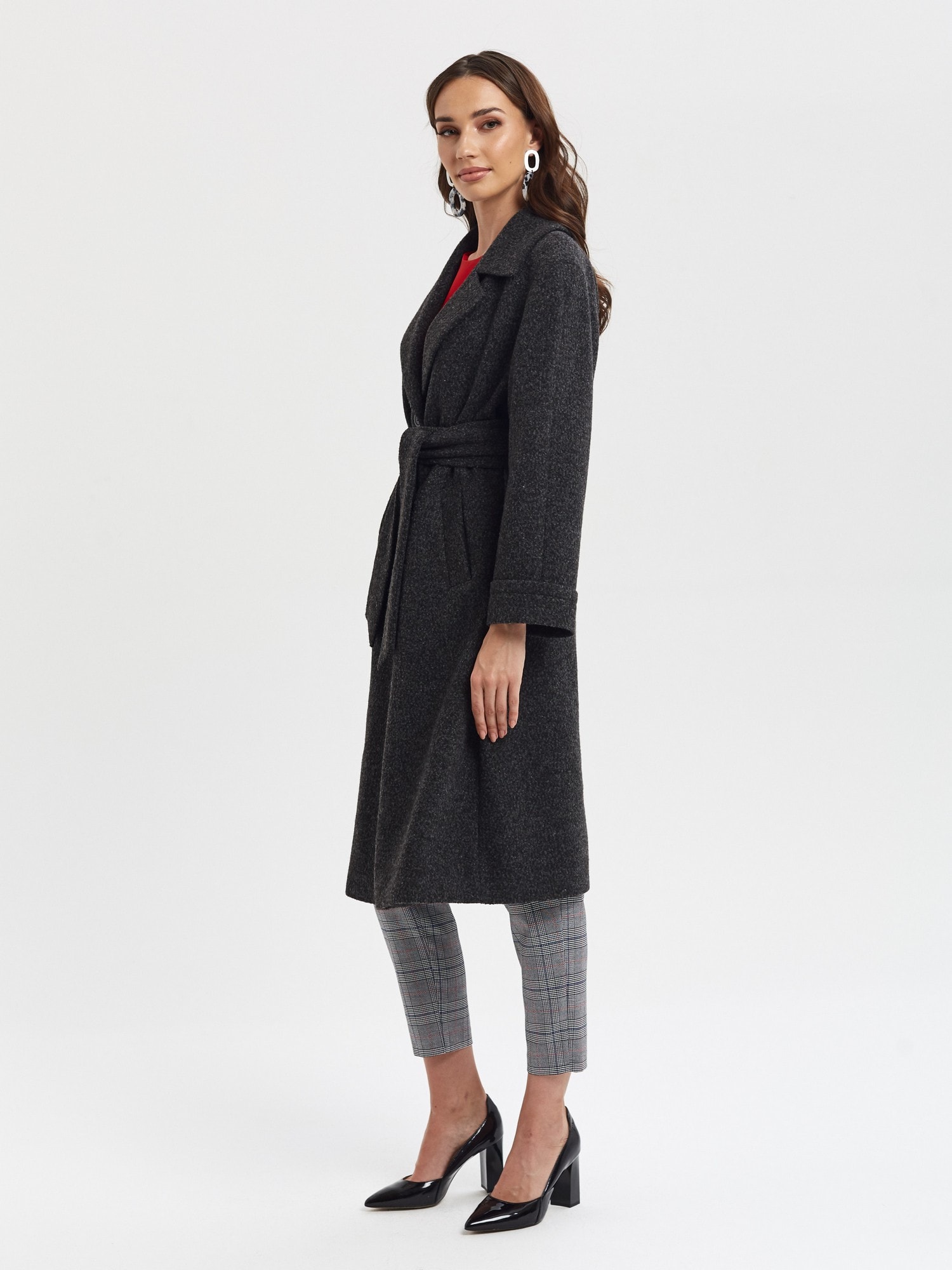 50% вискоза, 30% шерсть, 20% полиэстер. Подкладка 100% полиэстер. Размеры 42-50 Рост модели 178 см Длинное пальто из ткани "букле" Модель свободного кроя имеет английский воротник с широкими лацканами, рукава реглан с манжетами. Застегивается спереди на три крупные пуговицы, имеются карманы и пояс. Стильное дополнение весенне-осеннего гардероба. Образ на фото дополнен брюками Б-901 ММ5(О9) и блузкой Д-909 СНГ(О9)