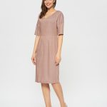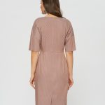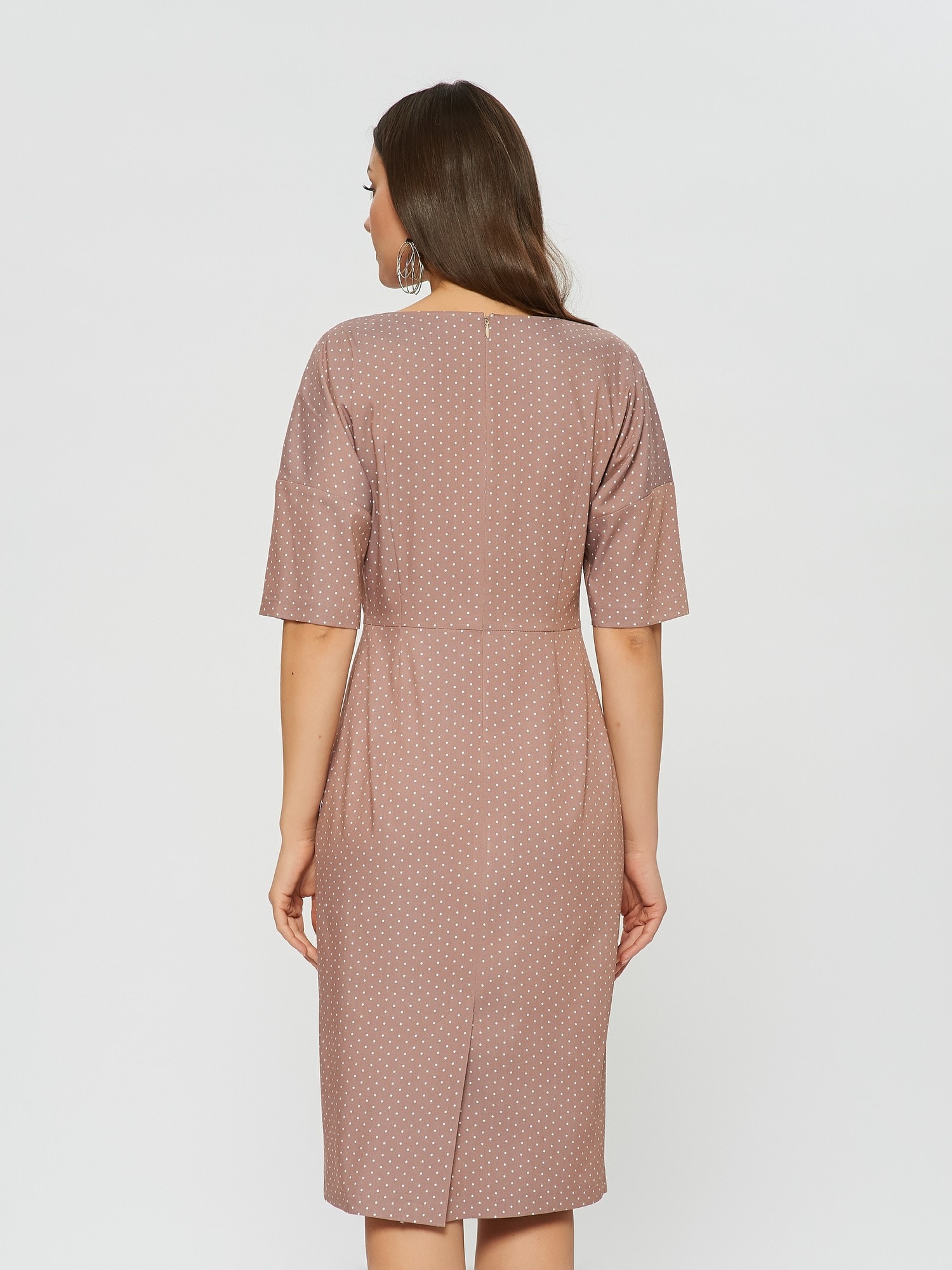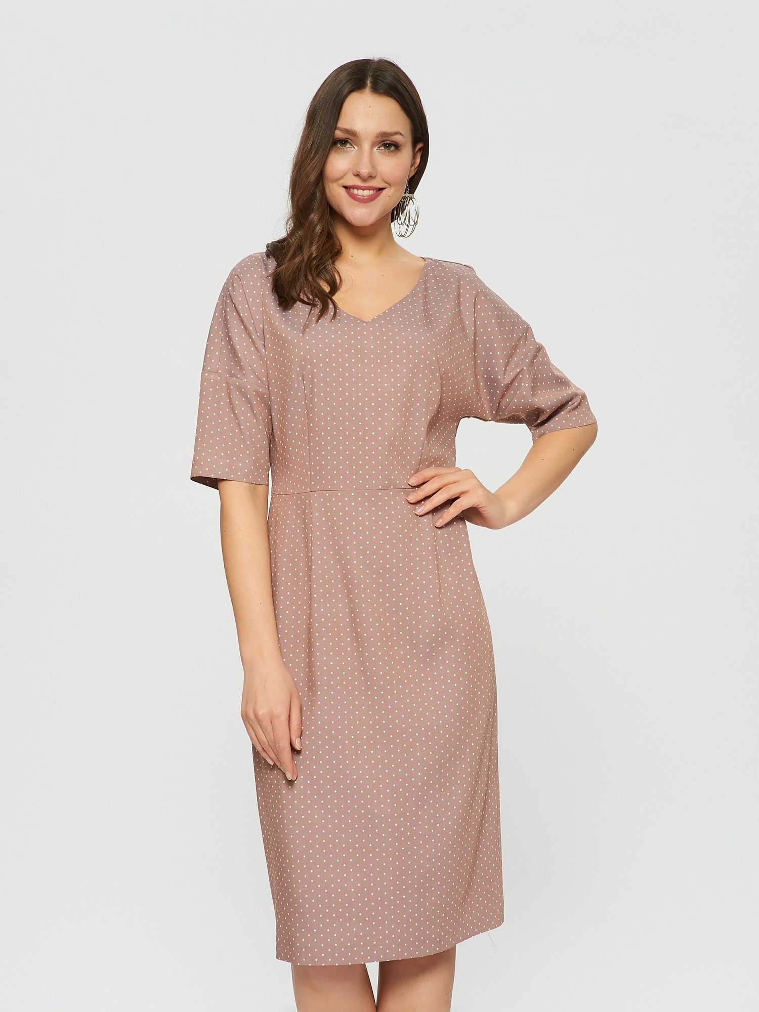 Платье, которое оценила бы сама Меган Маркл. Элегантный футляр с вырезом "на мысик", рукав со спущенной линией плеча. Сдержанный розовый оттенок с нежным горошкоми выглядит ещё благороднее в классическом силуэте.