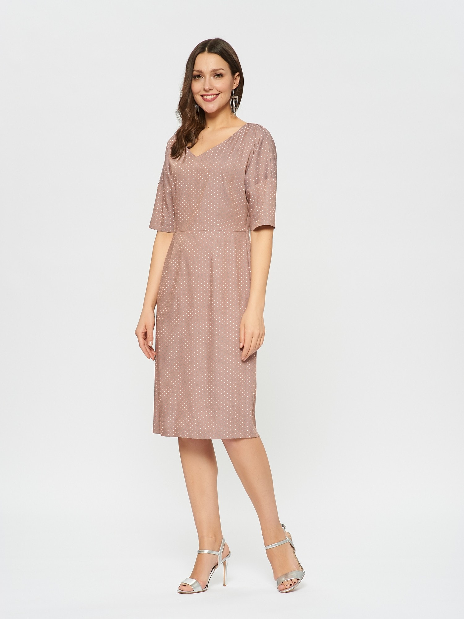 Платье, которое оценила бы сама Меган Маркл. Элегантный футляр с вырезом "на мысик", рукав со спущенной линией плеча. Сдержанный розовый оттенок с нежным горошкоми выглядит ещё благороднее в классическом силуэте.