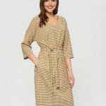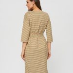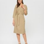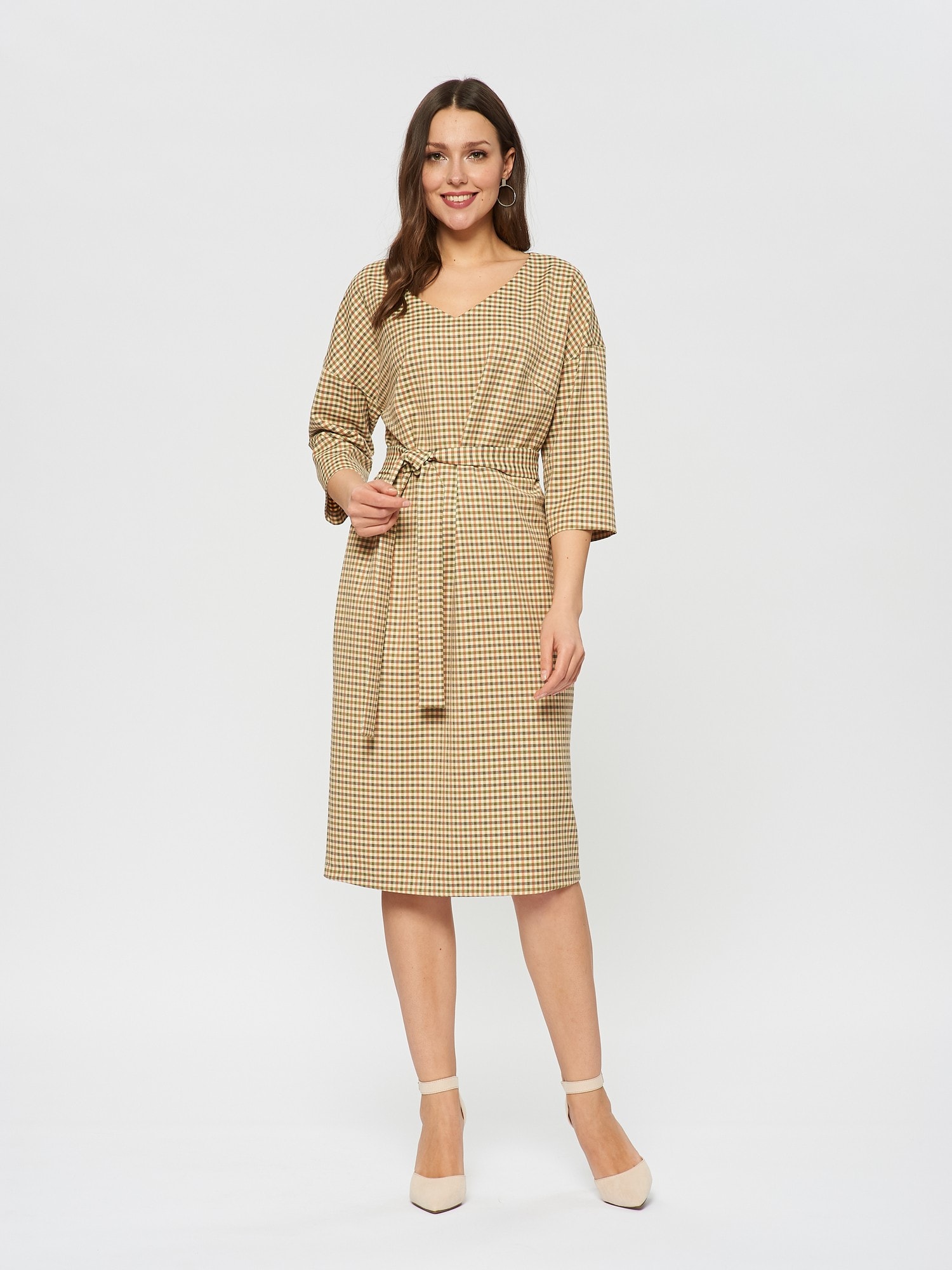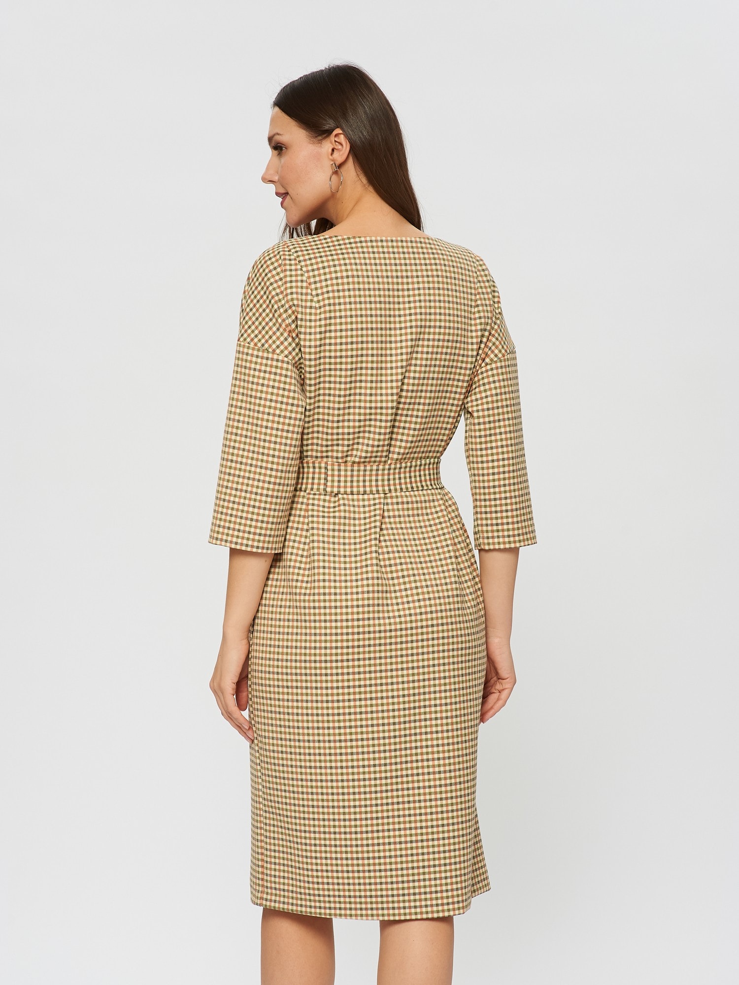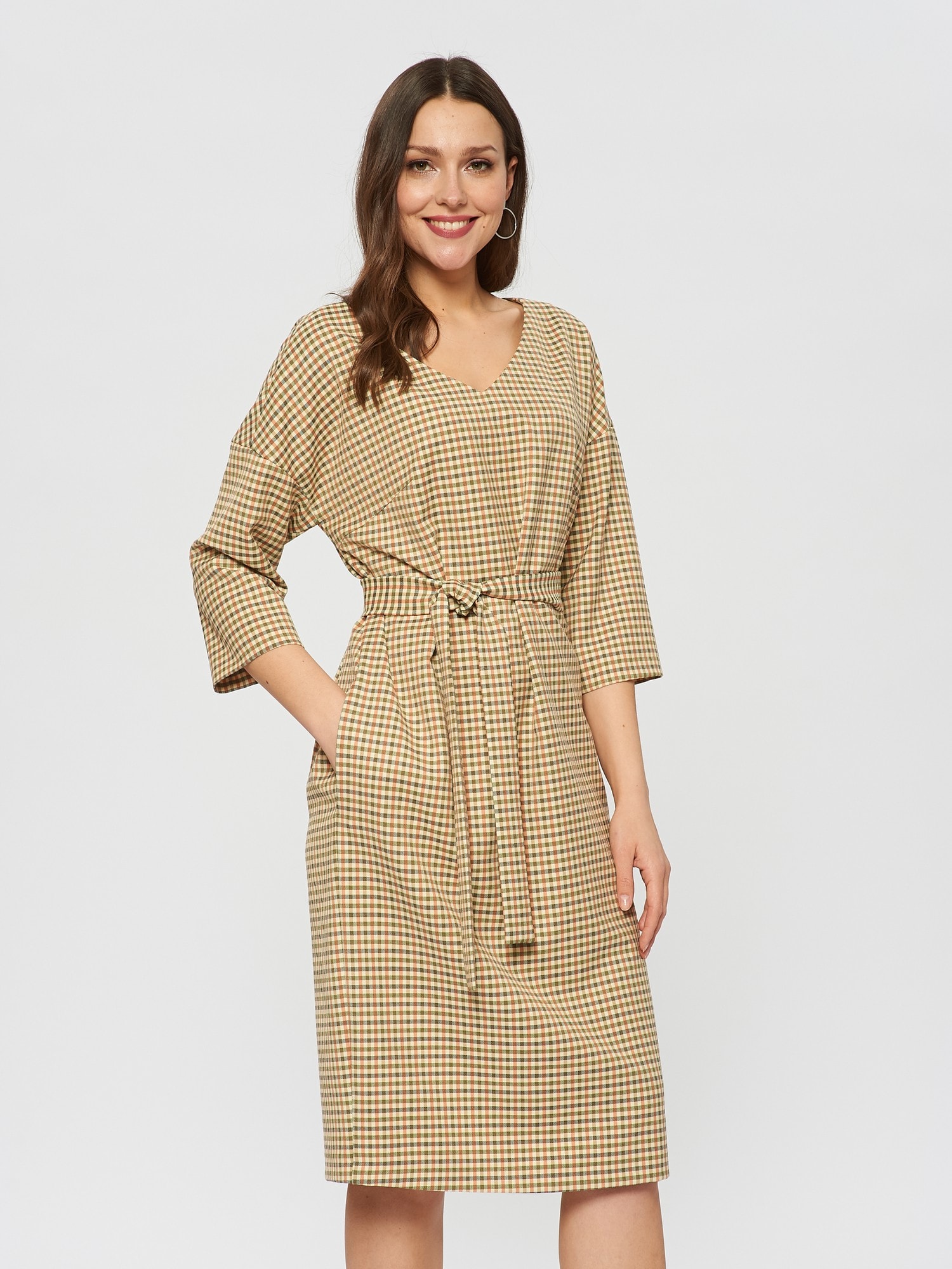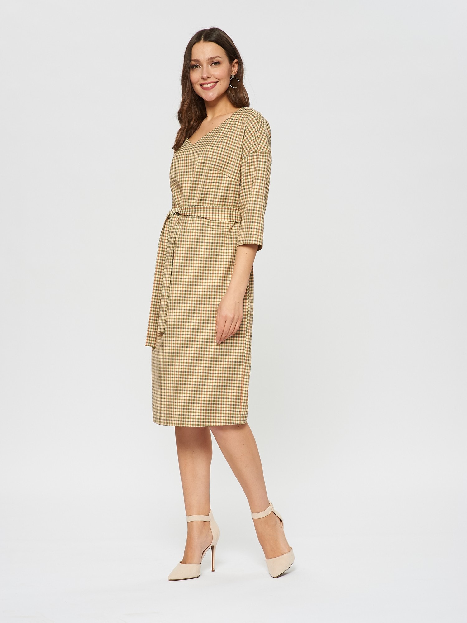Платье прямого силуэта из ткани с принтом клетки гленчек в горчично-терракотовых оттенках, пояс для подчеркивании талии. V-образный вырез горловины.