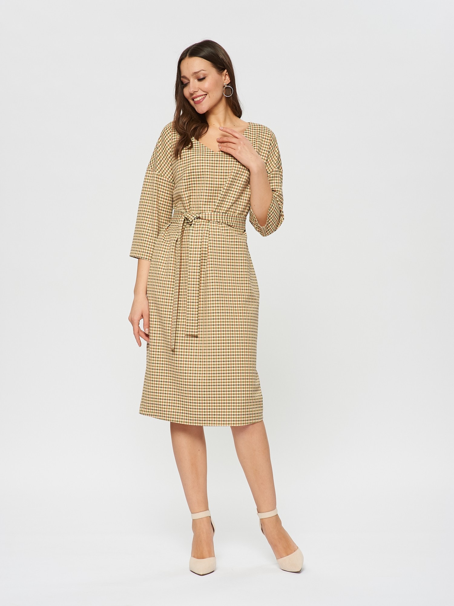 Платье прямого силуэта из ткани с принтом клетки гленчек в горчично-терракотовых оттенках, пояс для подчеркивании талии. V-образный вырез горловины.