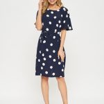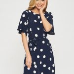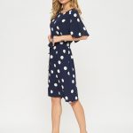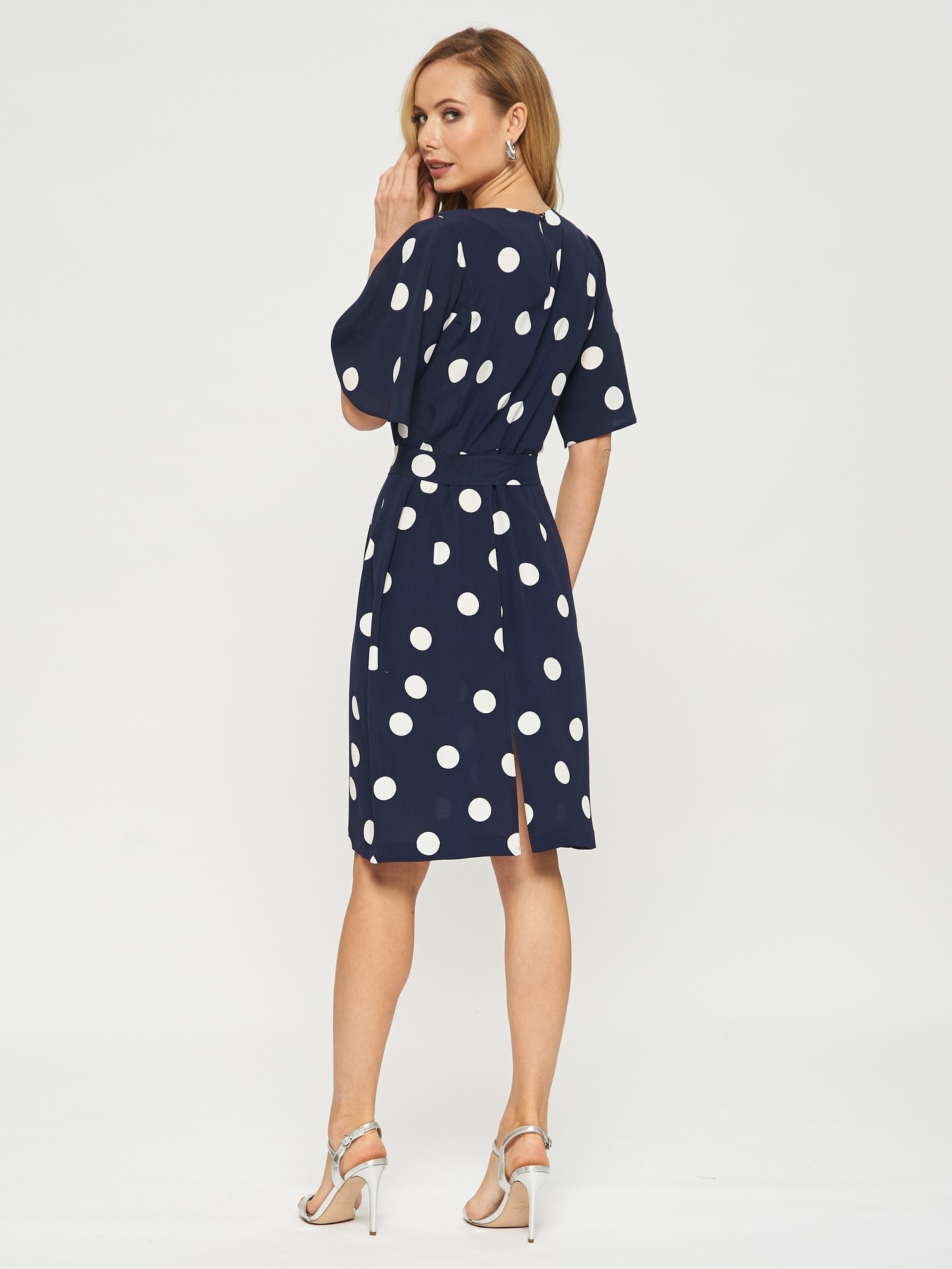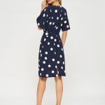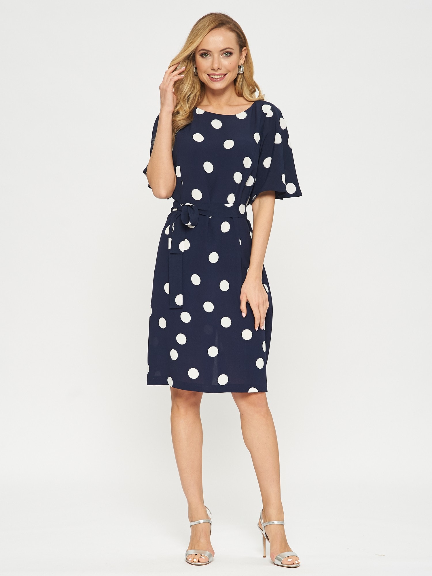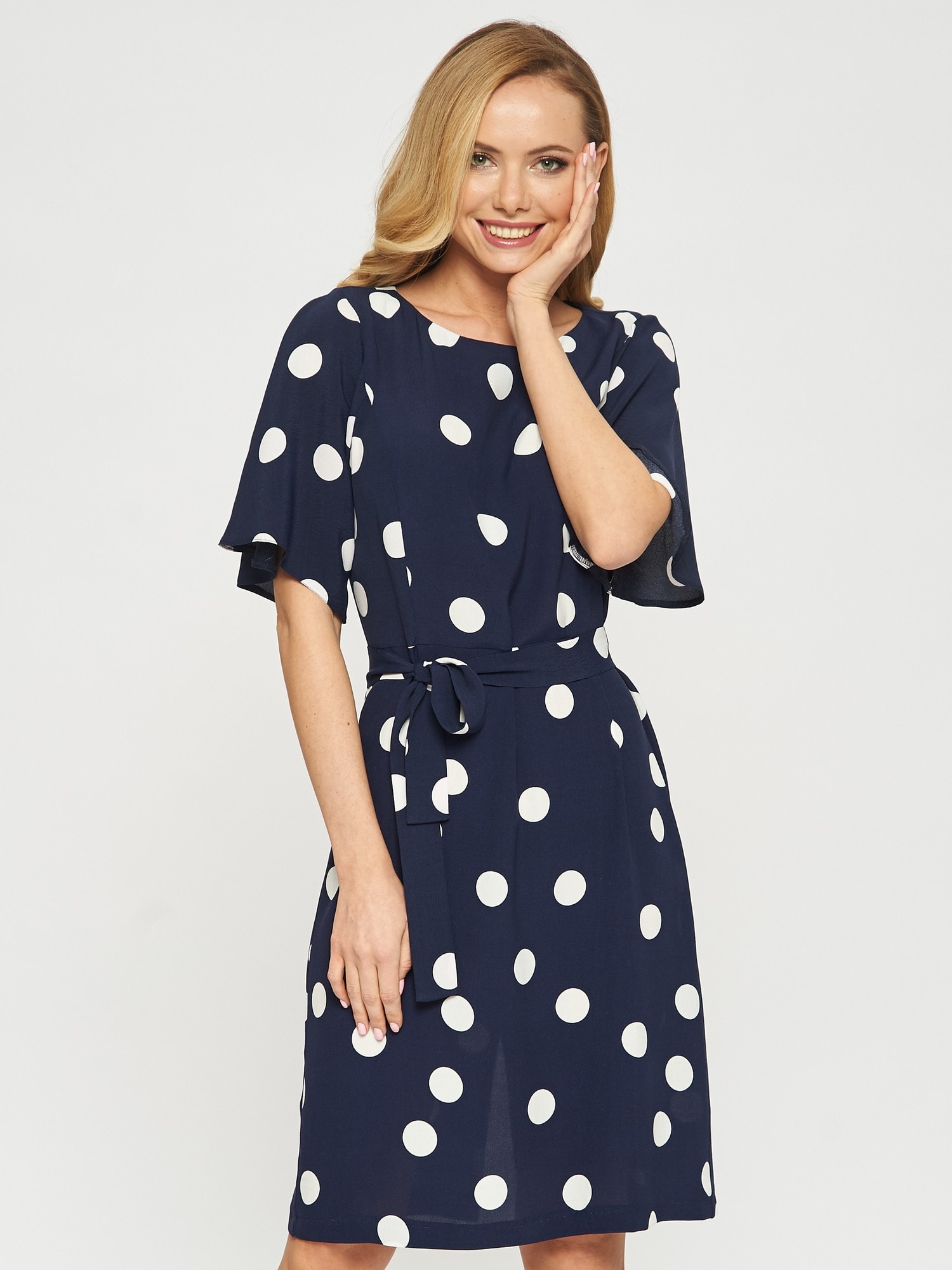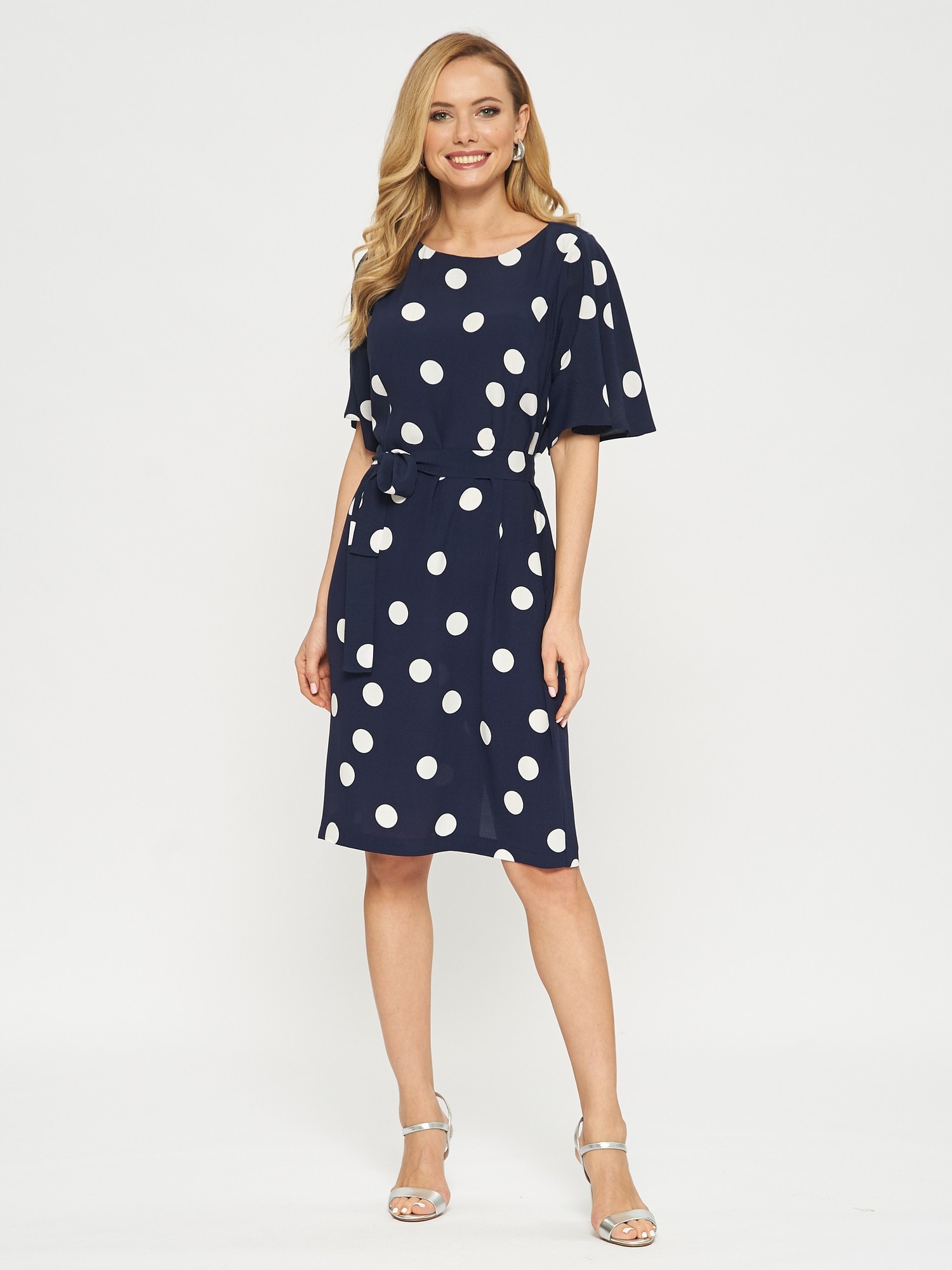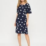 Платье прямого кроя в горошек с поясом. Рукава тюльпаны придают романтичности образу. Платье застегивается на пуговицу на спинке.