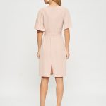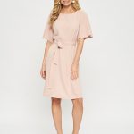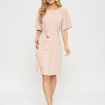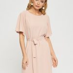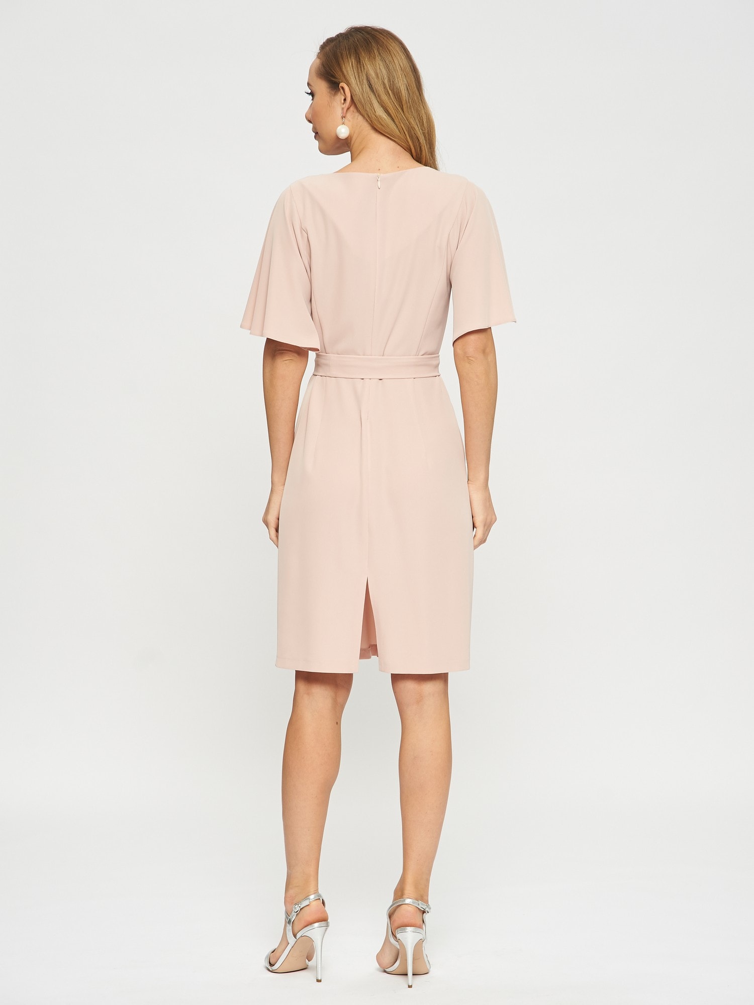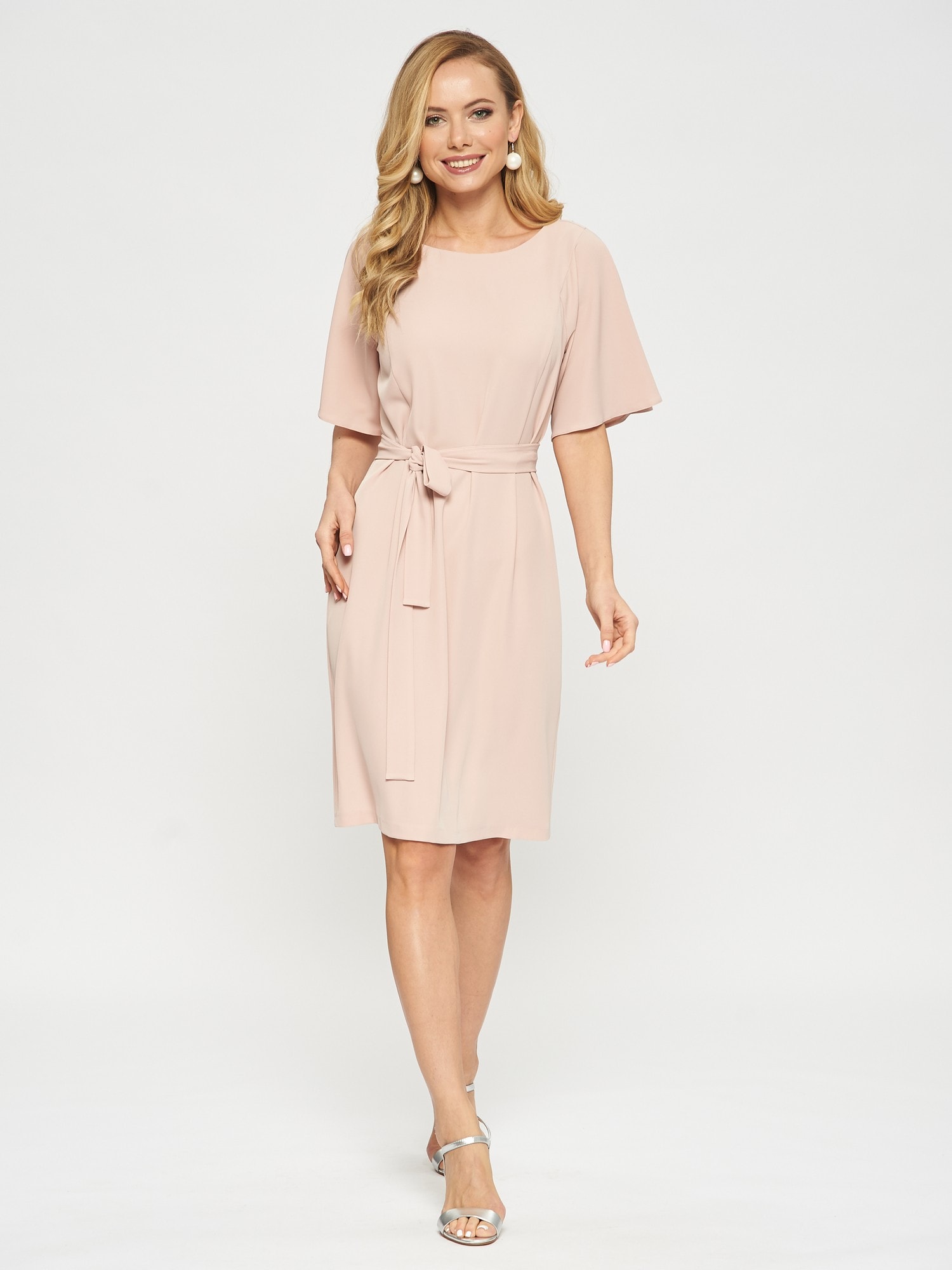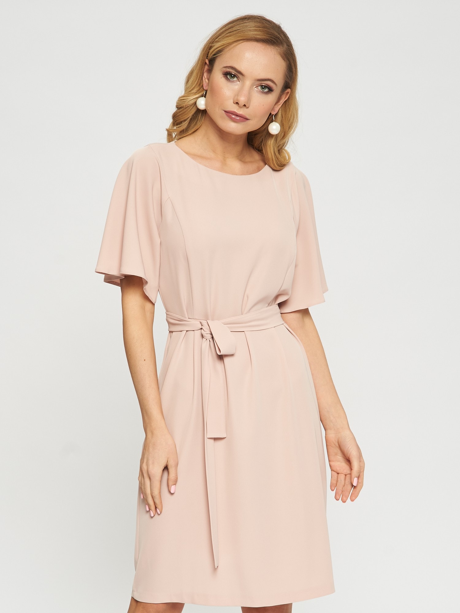 Пудровое платье с рукавами-крылышками. Прямой силуэт обеспечивает идеальную посадку по фигуре, а с поясом легко подчеркнуть талию.