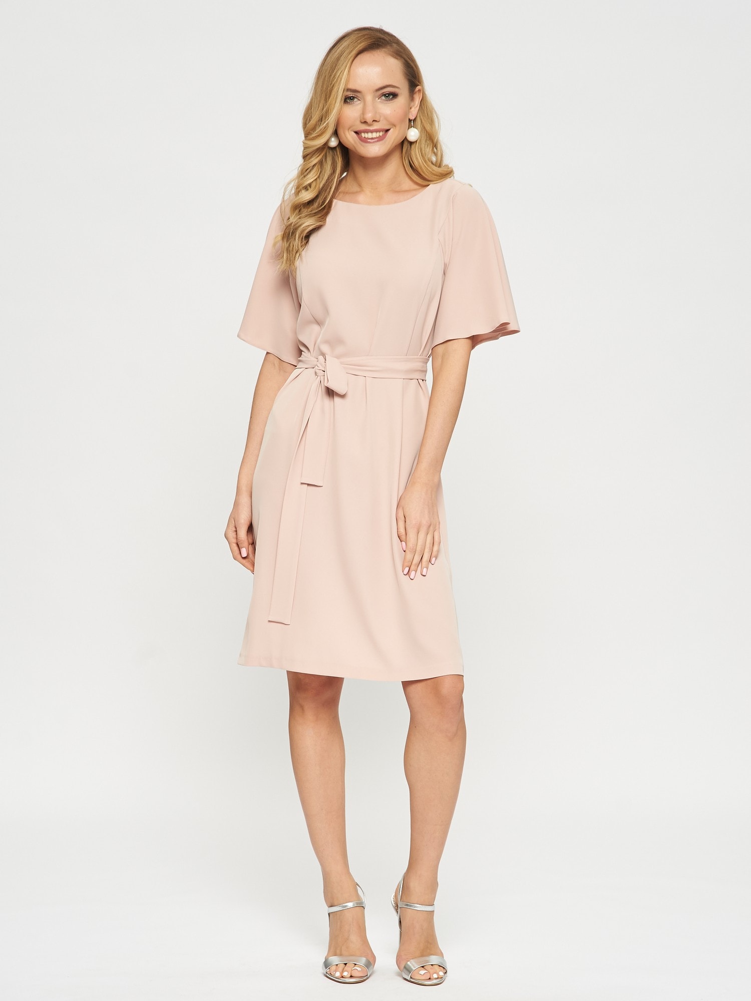 Пудровое платье с рукавами-крылышками. Прямой силуэт обеспечивает идеальную посадку по фигуре, а с поясом легко подчеркнуть талию.