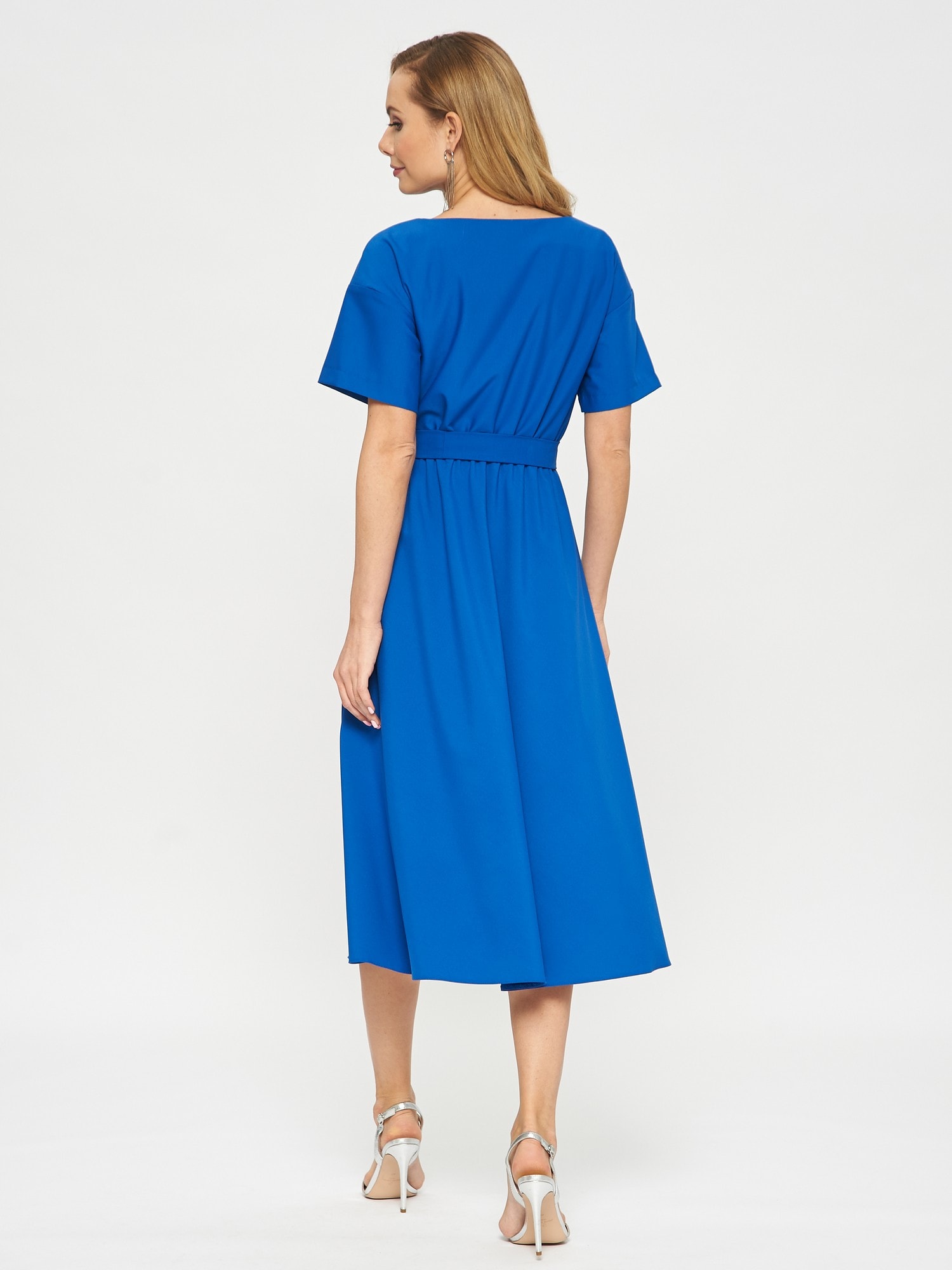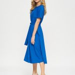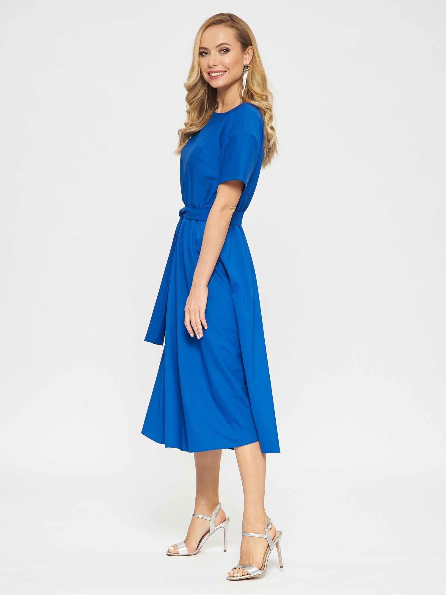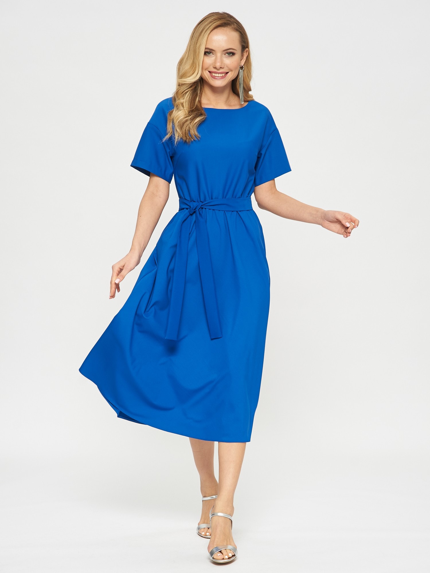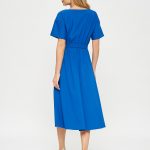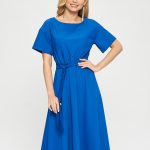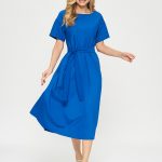 Платье цвета индиго с широким и коротким рукавом. Линия талии на резинке, пояс из аналогичной ткани в комплекте.