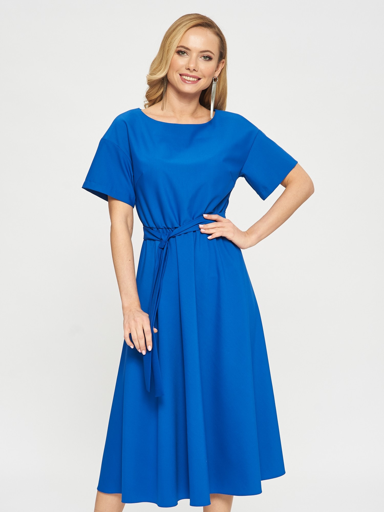 Платье цвета индиго с широким и коротким рукавом. Линия талии на резинке, пояс из аналогичной ткани в комплекте.