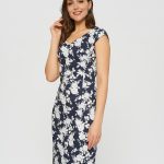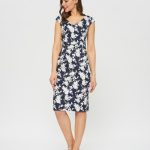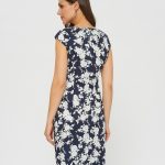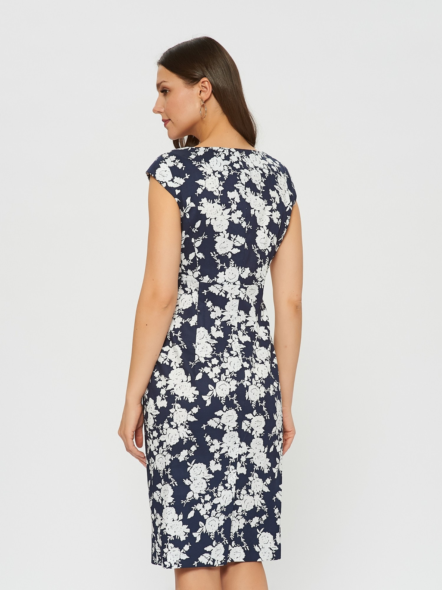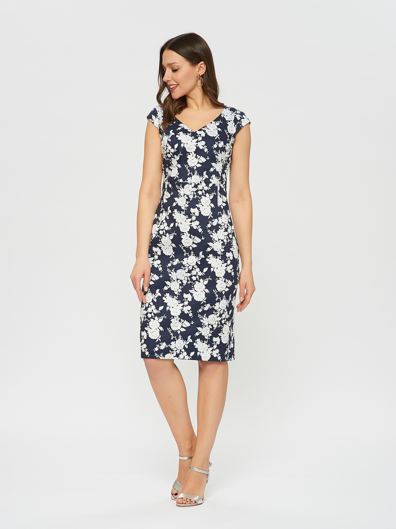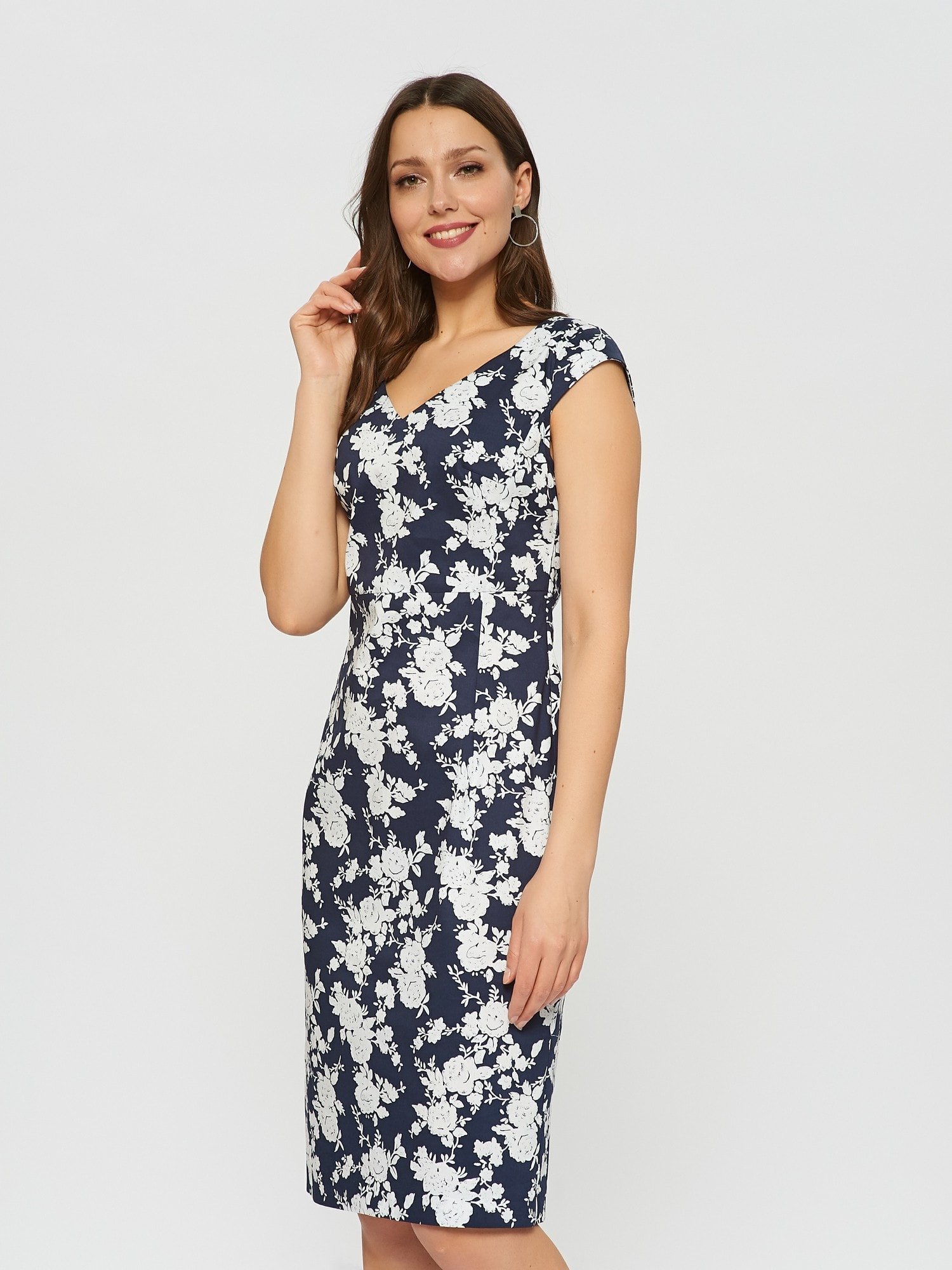 Платье-футляр с вырезом "лодочка". Принт платья отражает эстетику росписи "Гжель". Застежка на потайную молнию с боковом шве.