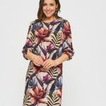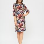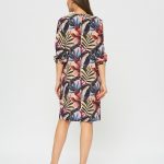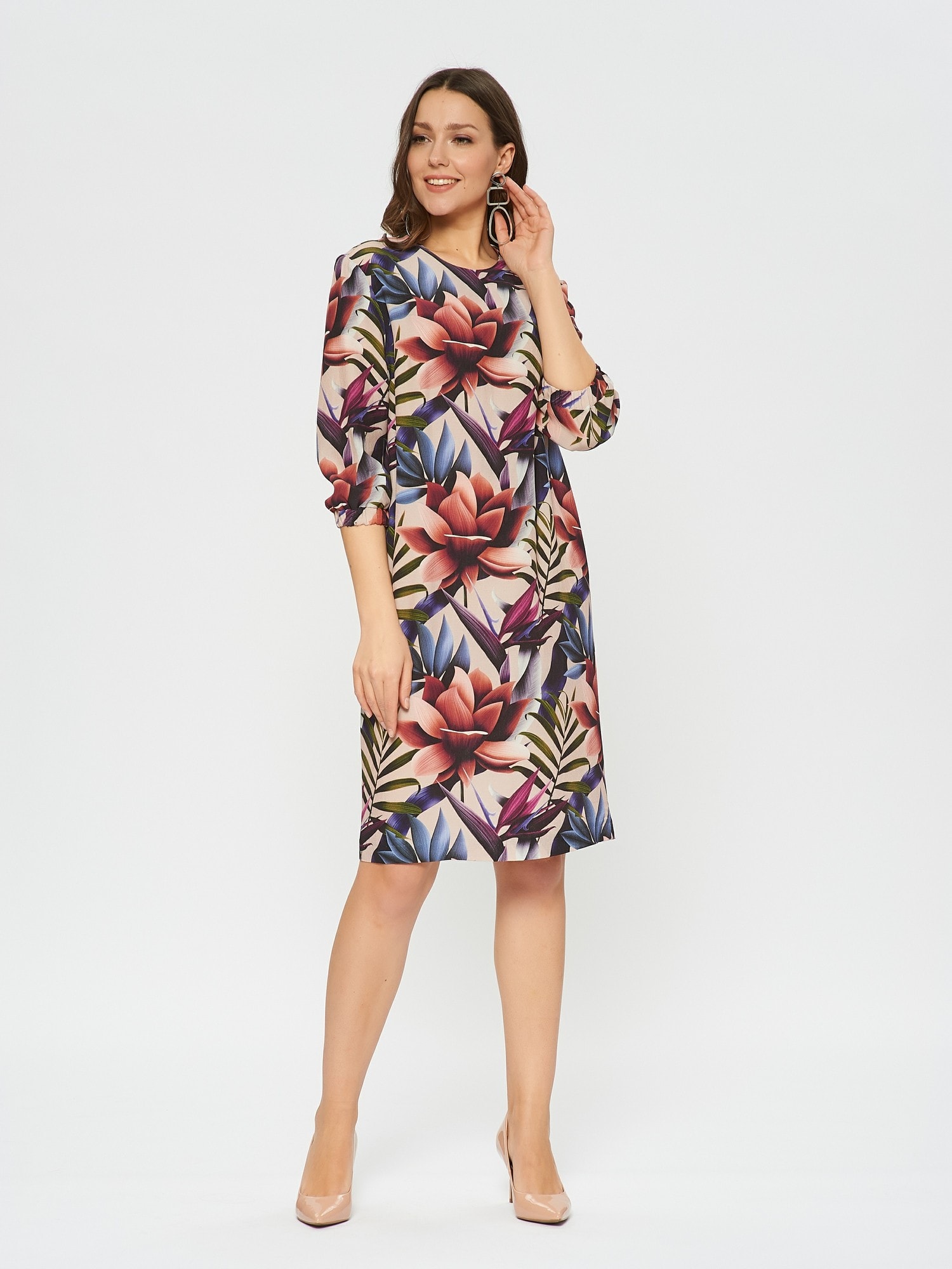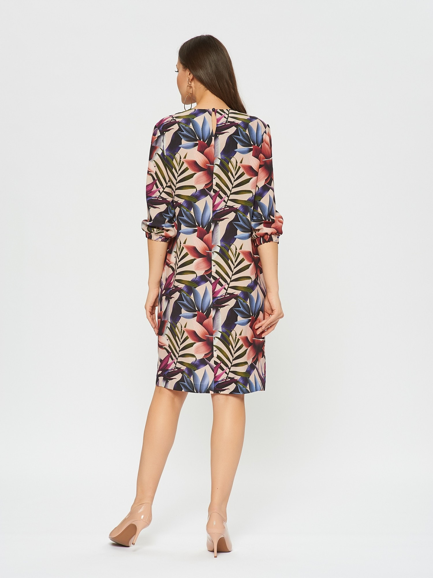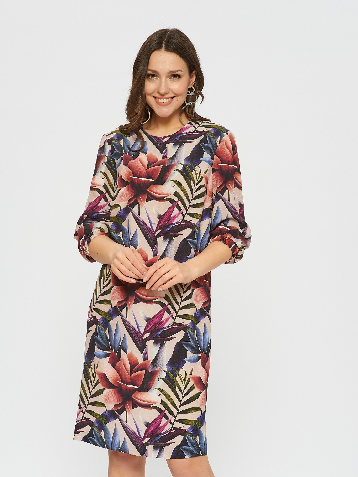 Платье прямого силуэта с флористическим принтом - великолепные тропические мотивы. Романтичная модель с рукавами на манжетах с резинкой, сзади застежка на пуговицу.