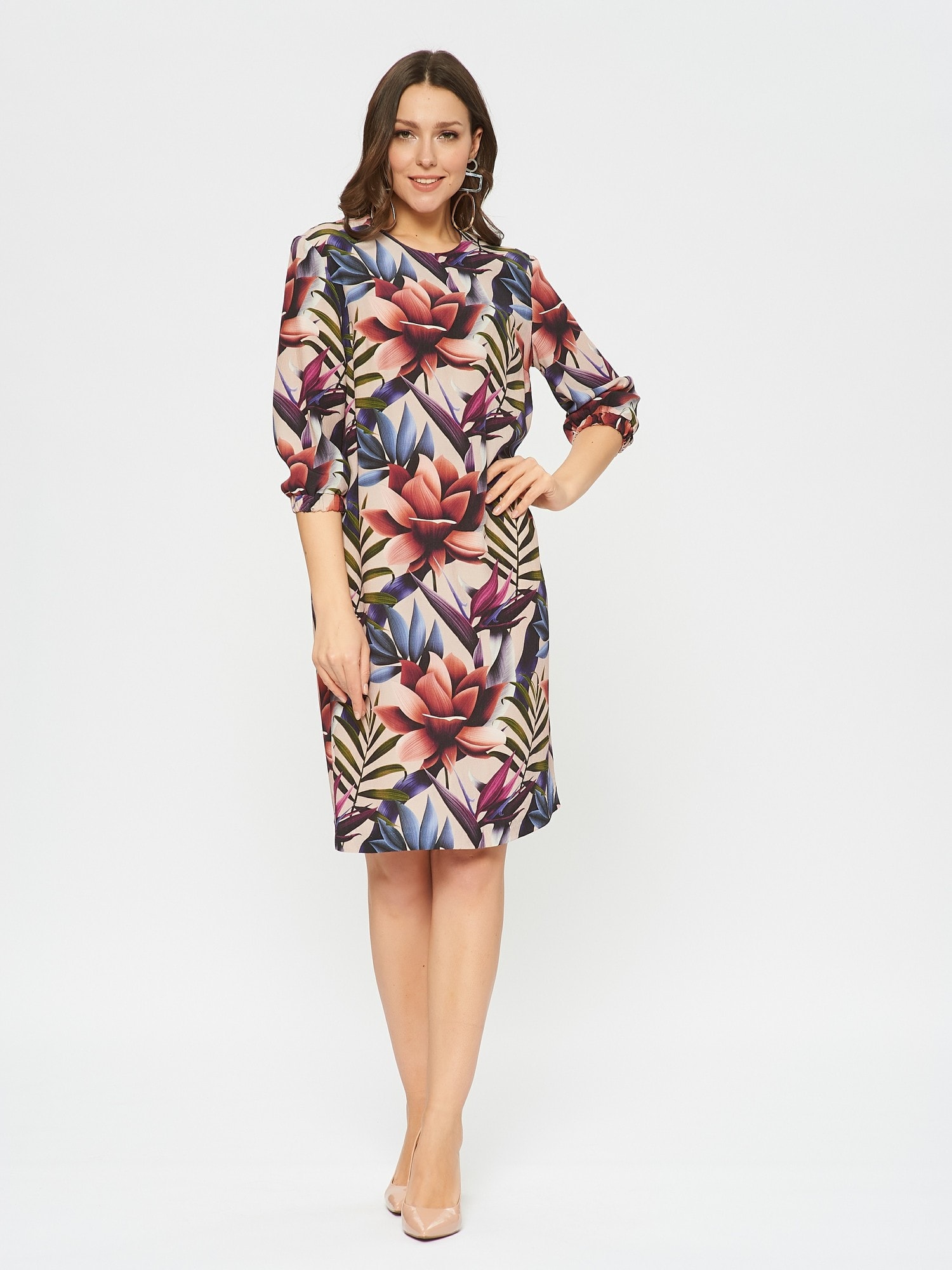 Платье прямого силуэта с флористическим принтом - великолепные тропические мотивы. Романтичная модель с рукавами на манжетах с резинкой, сзади застежка на пуговицу.