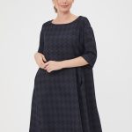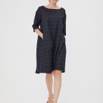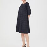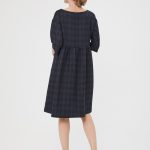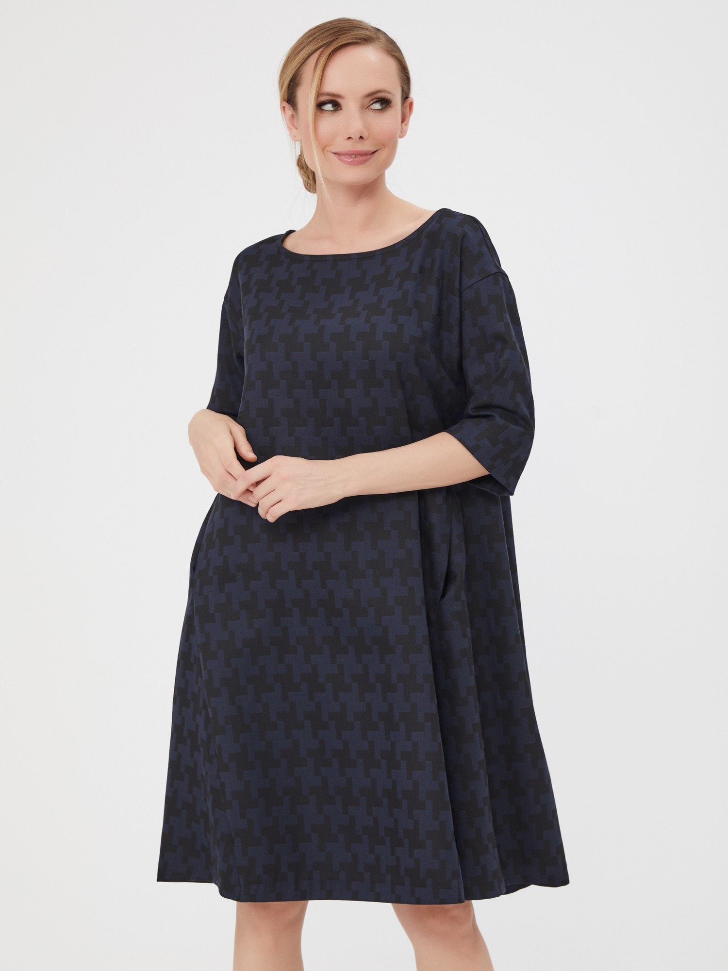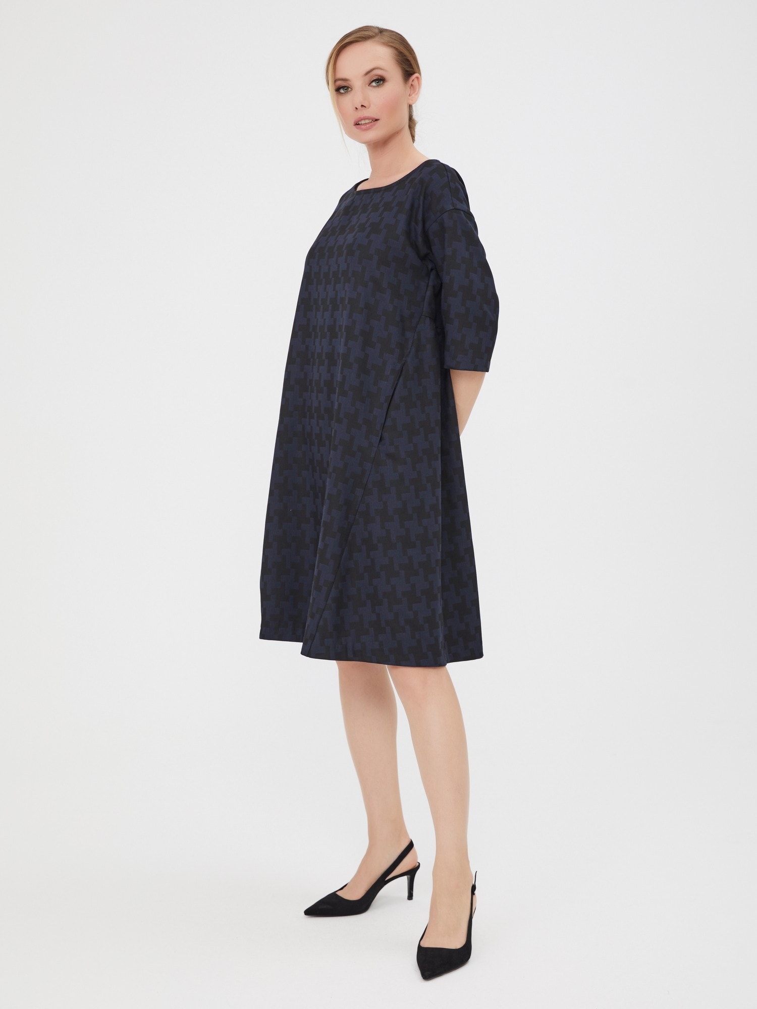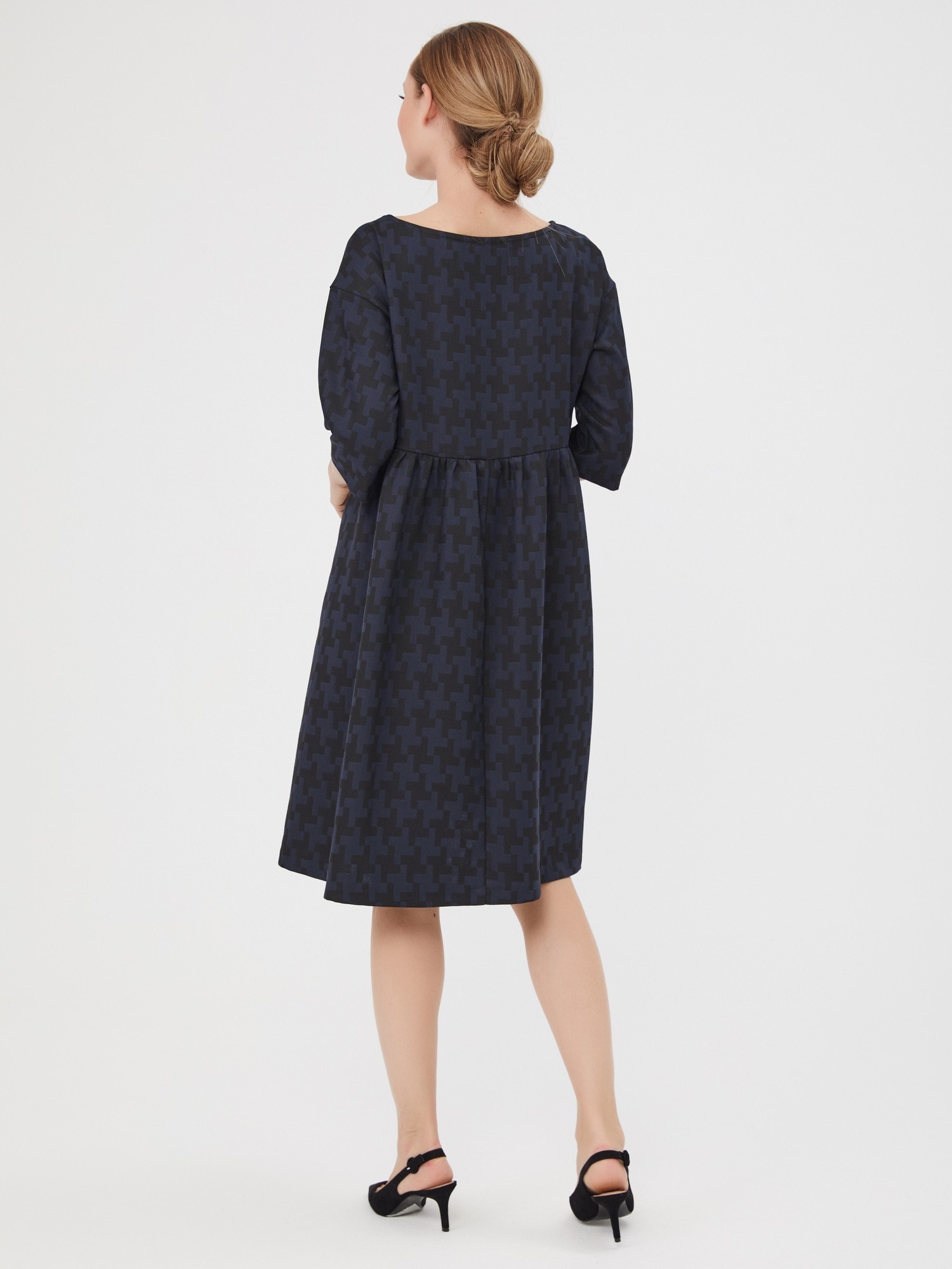 Объемное трикотажное платье с принтом в сине-черную гусиную лапку. Сборка на талии по спинке. Карманы, скрытые в швах рельефов.