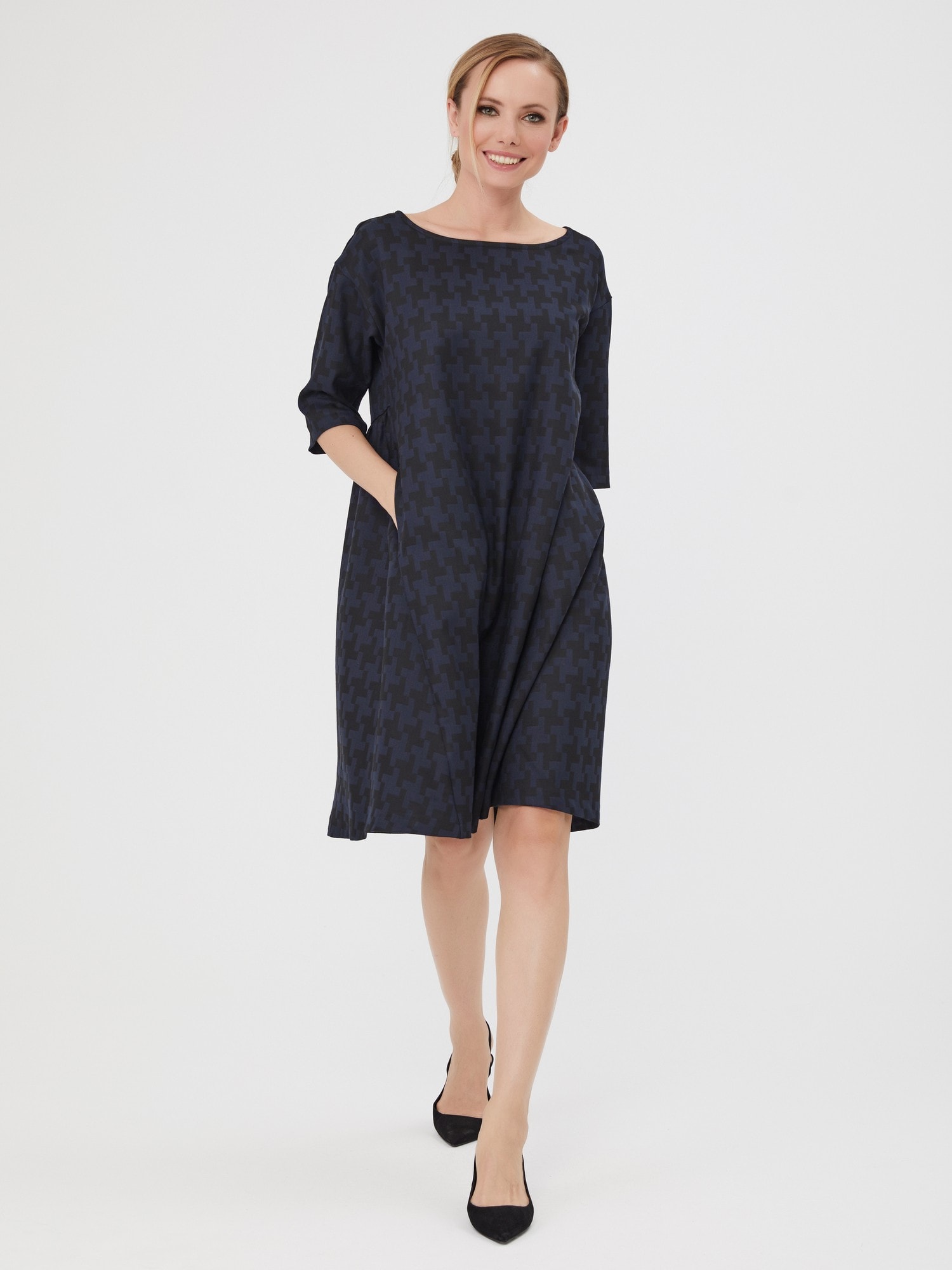Объемное трикотажное платье с принтом в сине-черную гусиную лапку. Сборка на талии по спинке. Карманы, скрытые в швах рельефов.