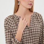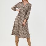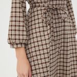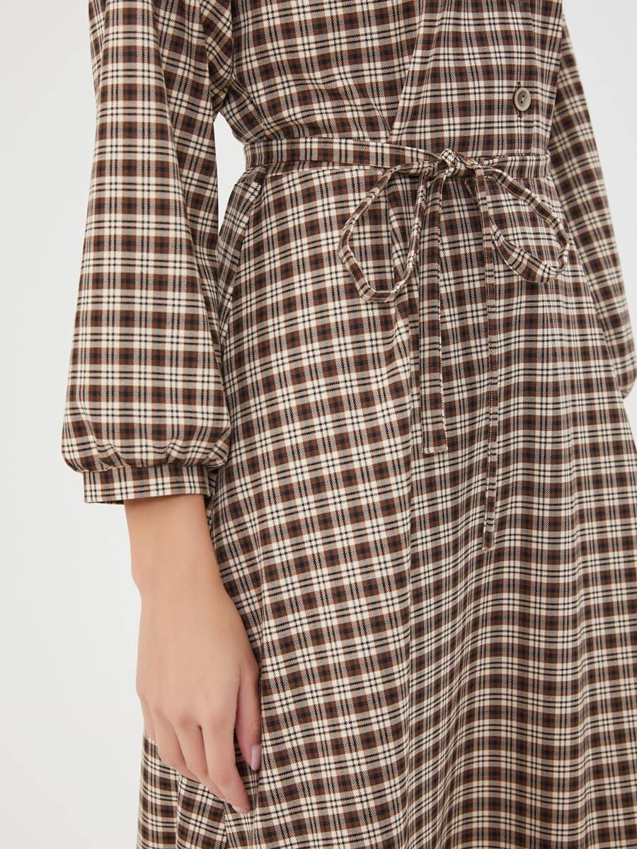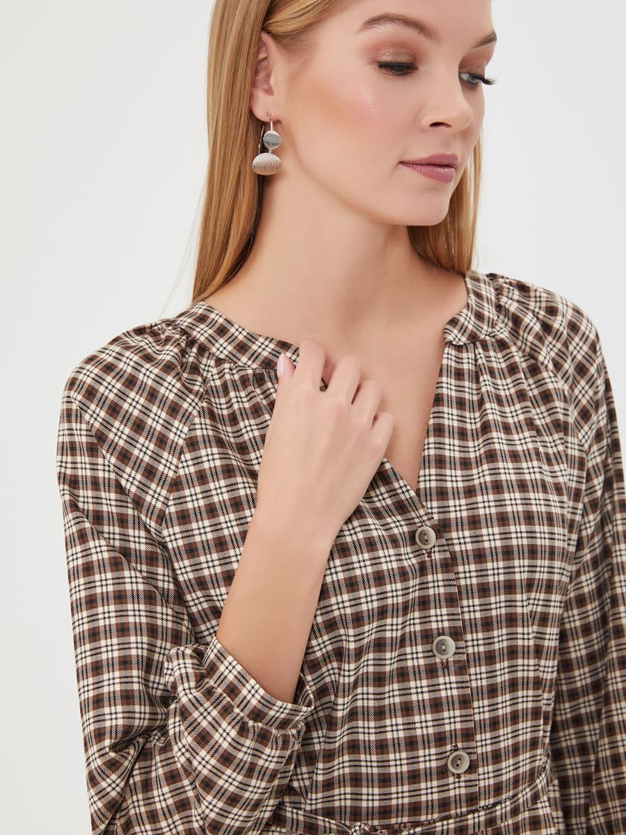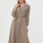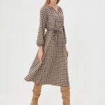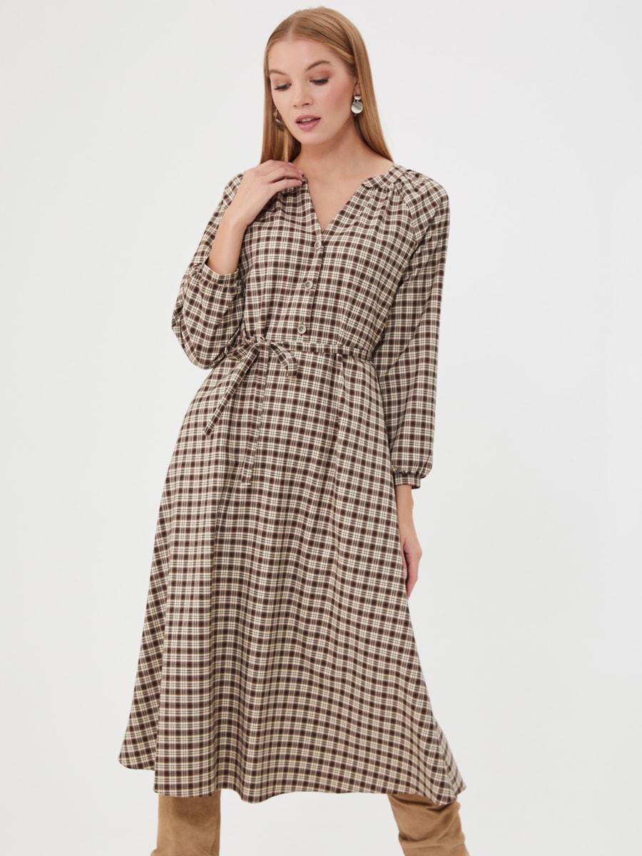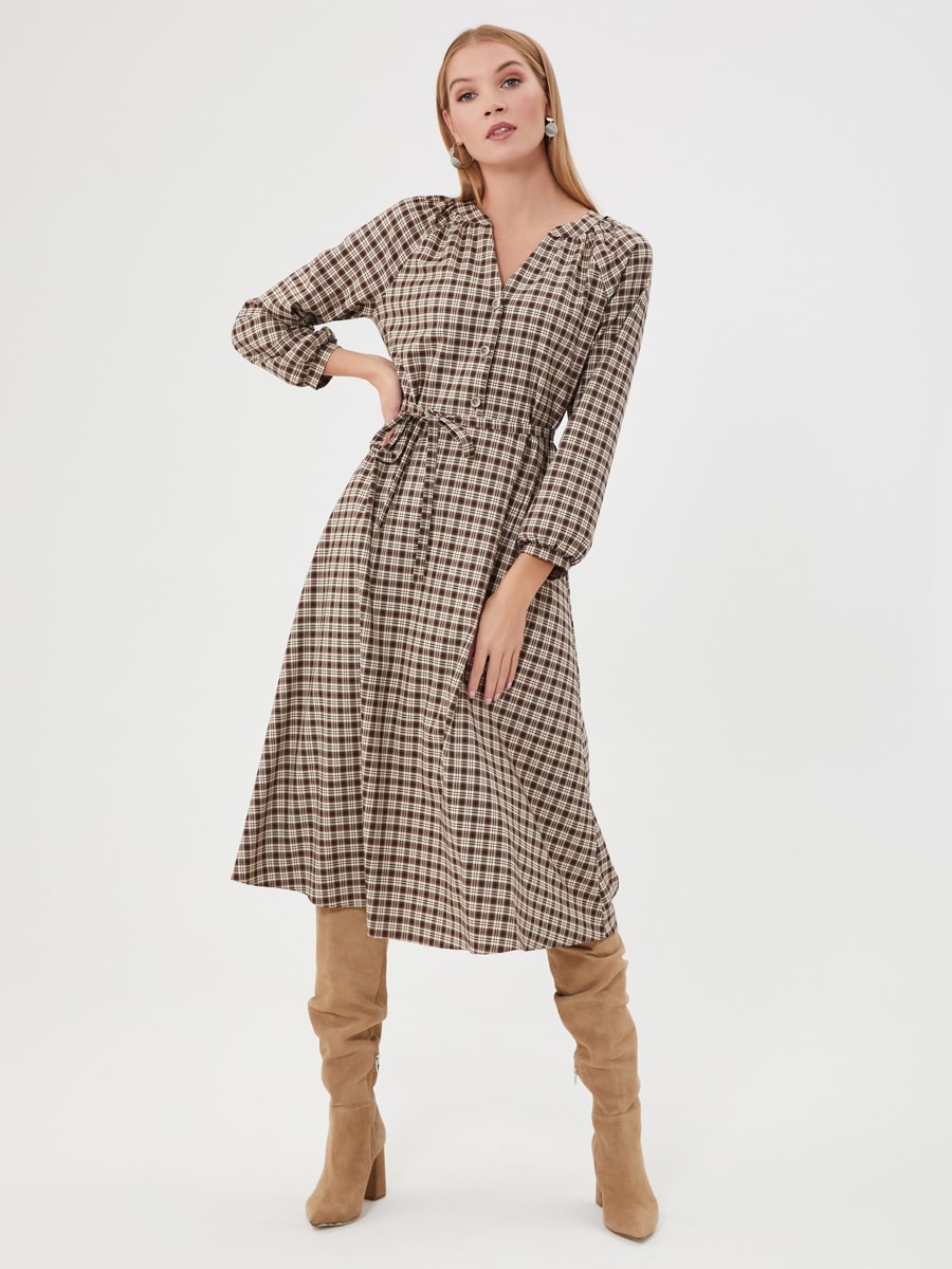 Описание: Платье в мелкую коричнево-бежевую клеточку. Линия плеч и горловины присобраны на сборку. Отрезная юбка. Тонкий пояс в комплекте.