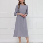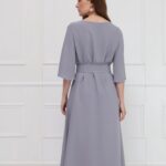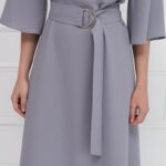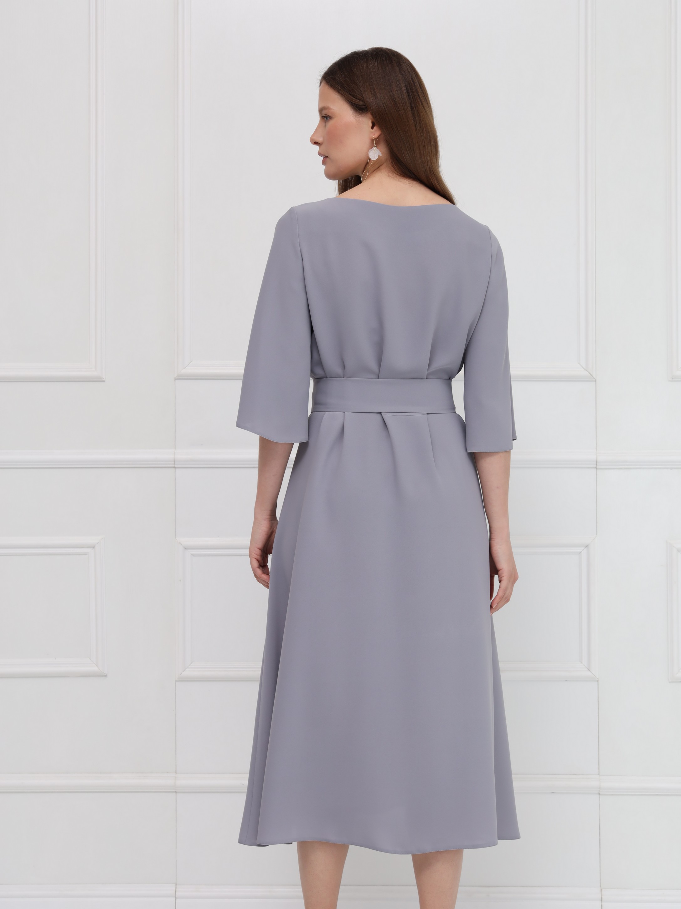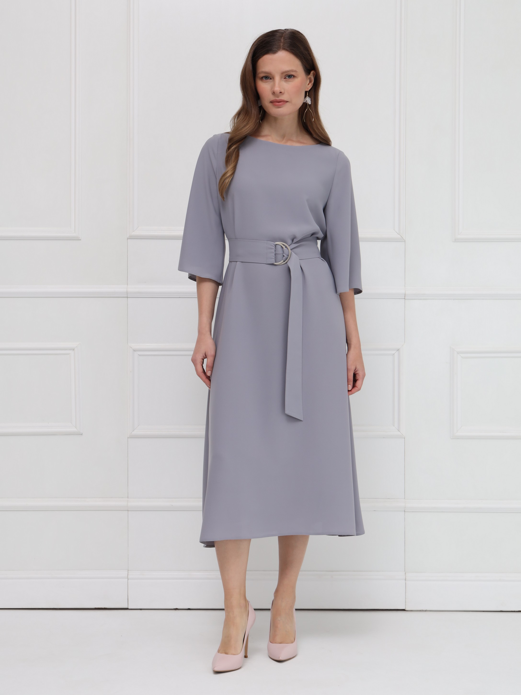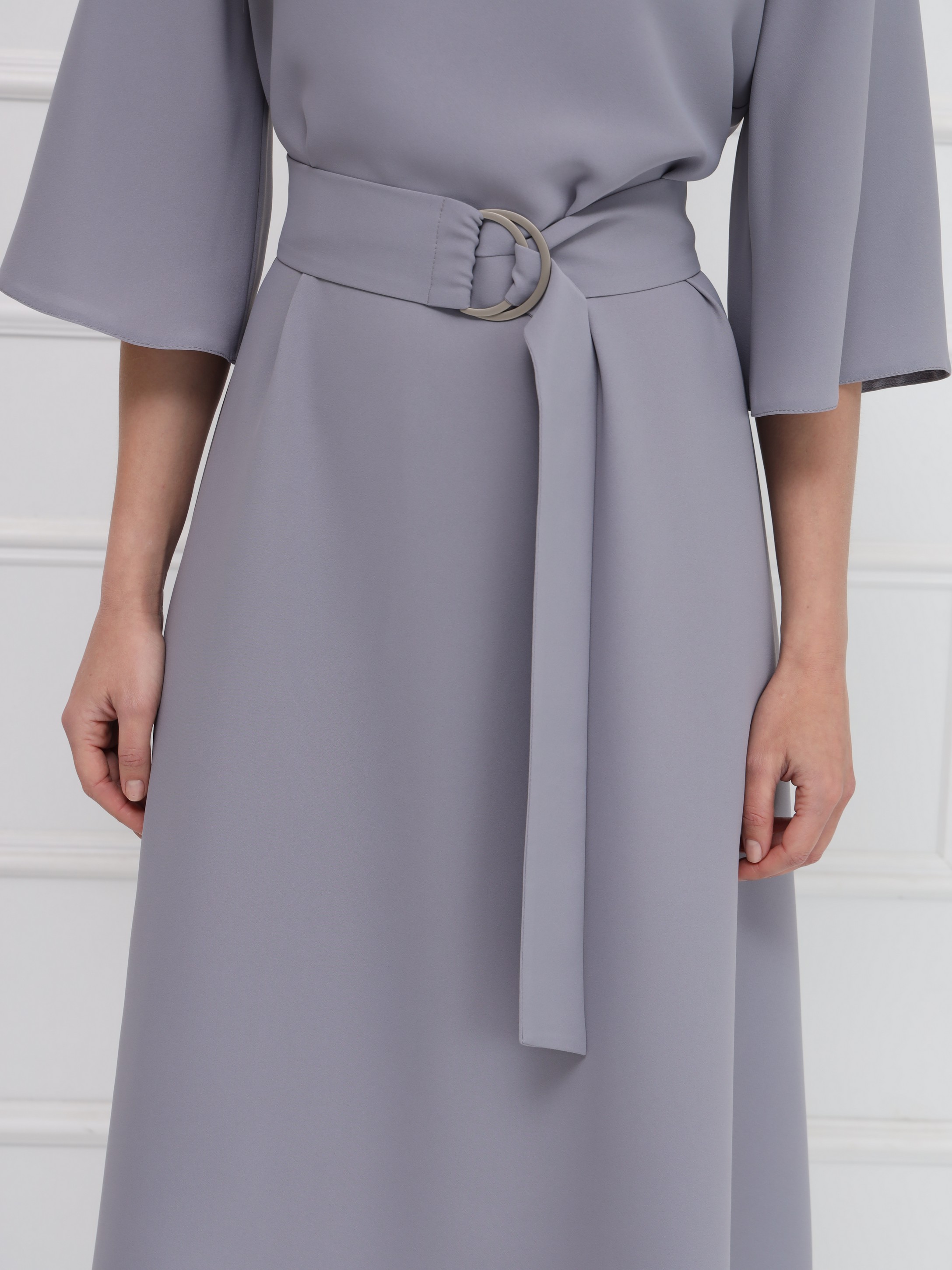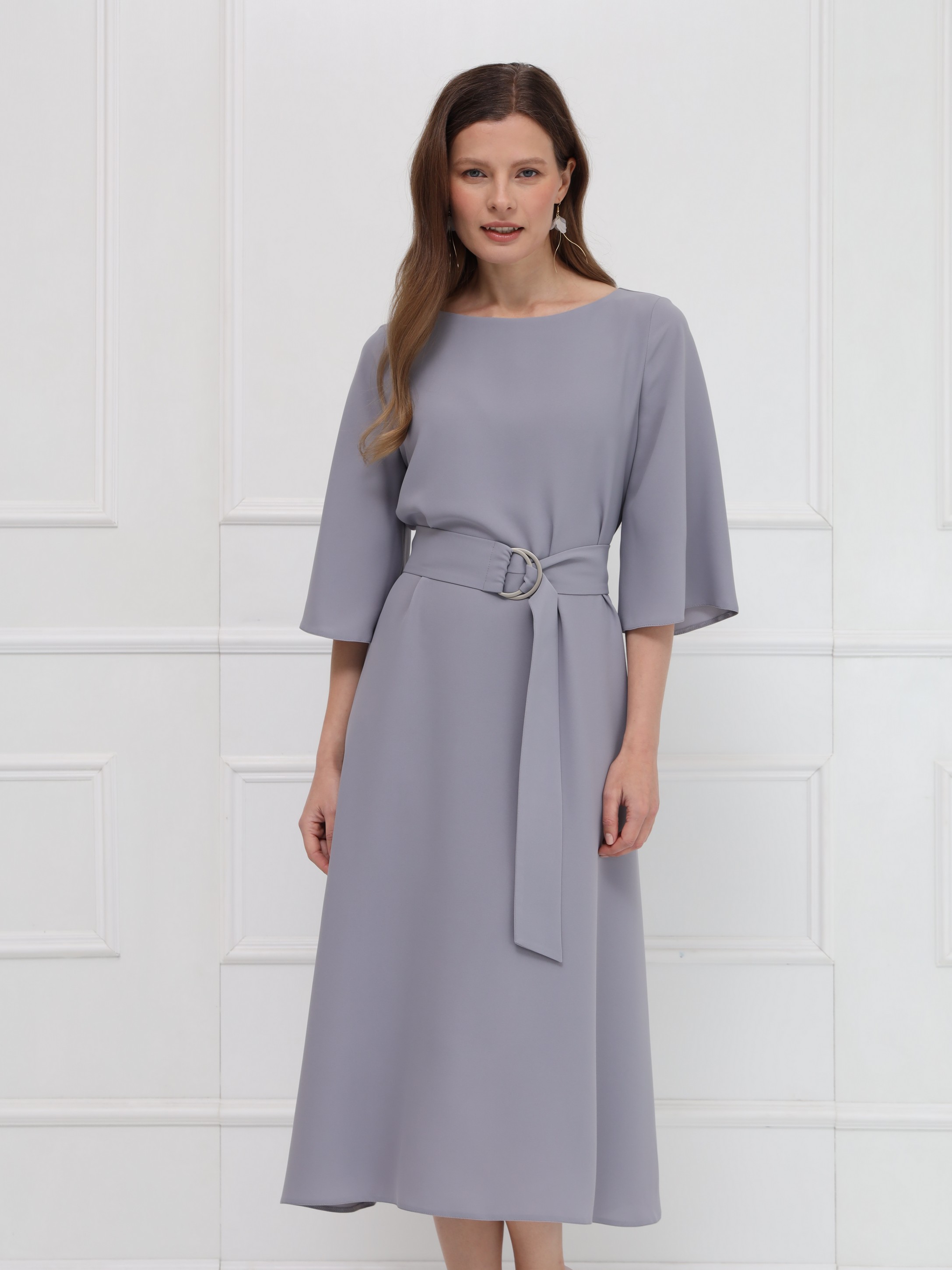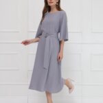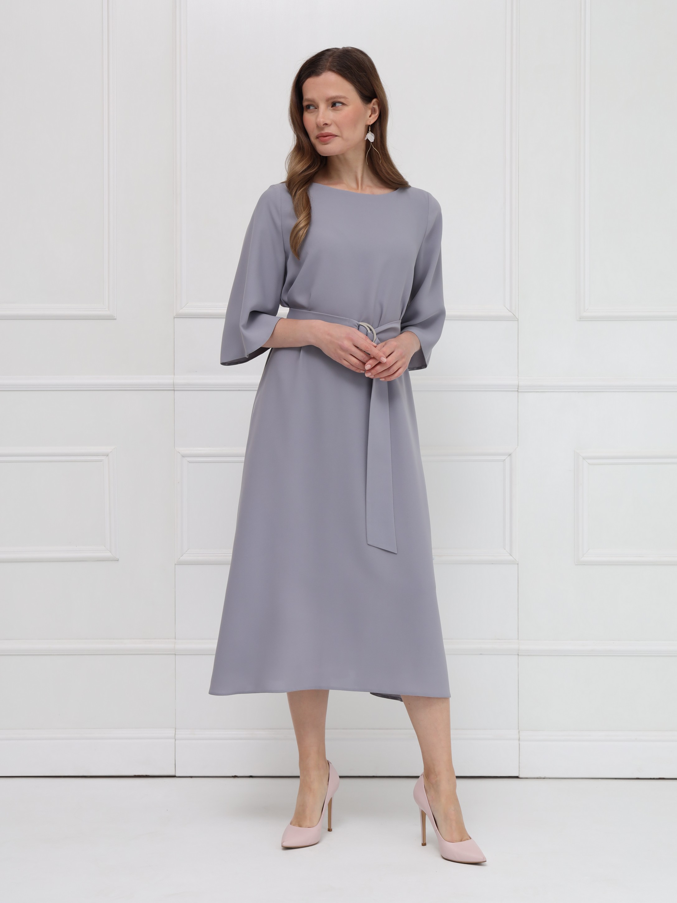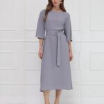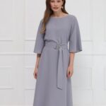 Платье-миди выглядит по-настоящему роскошно и утончённо. Модель отрезная по талии, свободная, с мягко расклешённой юбкой, которая изящно драпируется благодаря широкому поясу, подчёркивающему силуэт. Широкие рукава длиной до локтя создают ощущение лёгкости и добавляют образу деликатную женственность, а аккуратная овальная горловина делает дизайн ещё более гармоничным. Ткань лёгкая, пластичная и практичная - не мнётся и прекрасно держит форму.