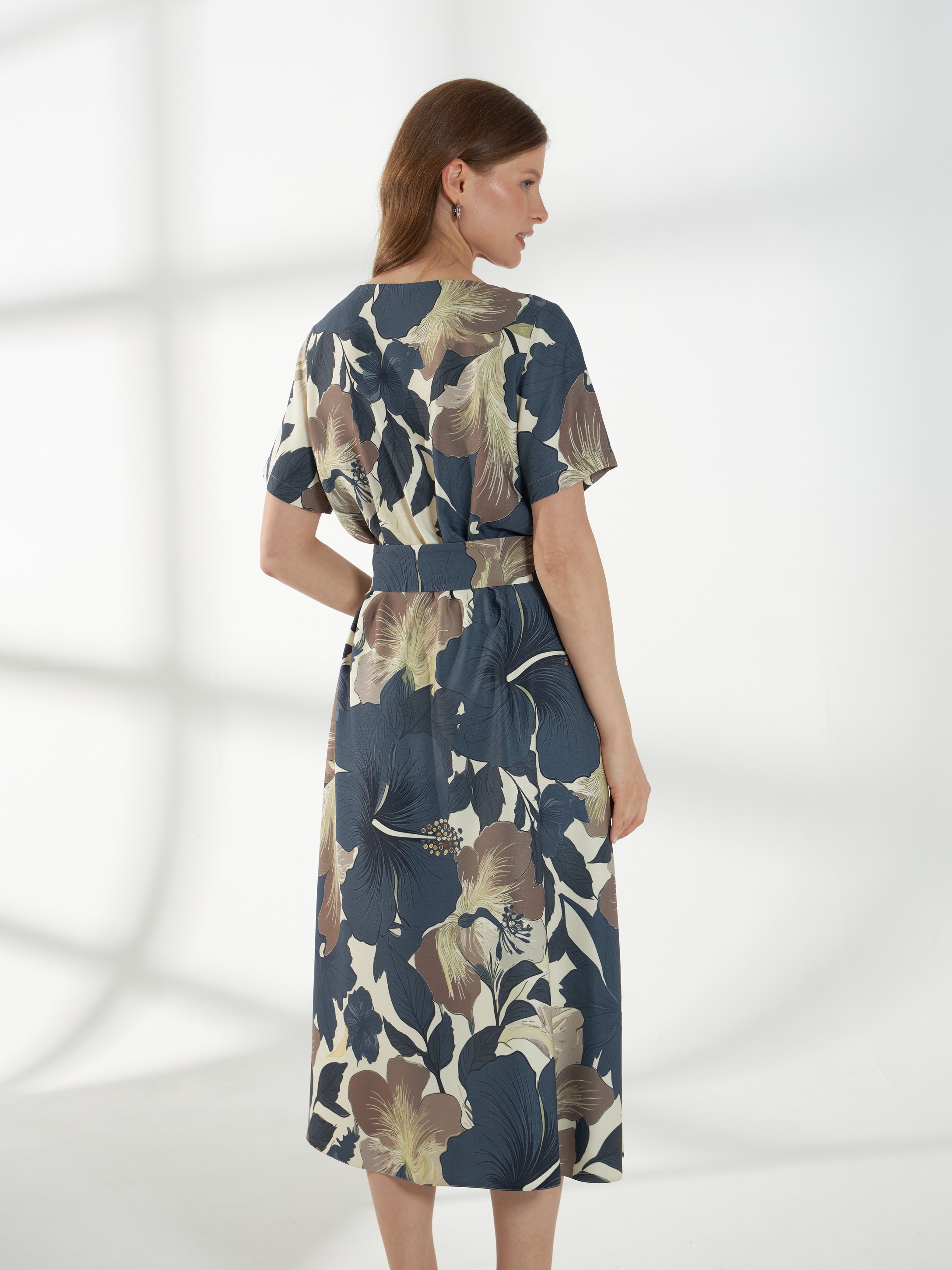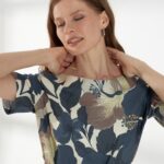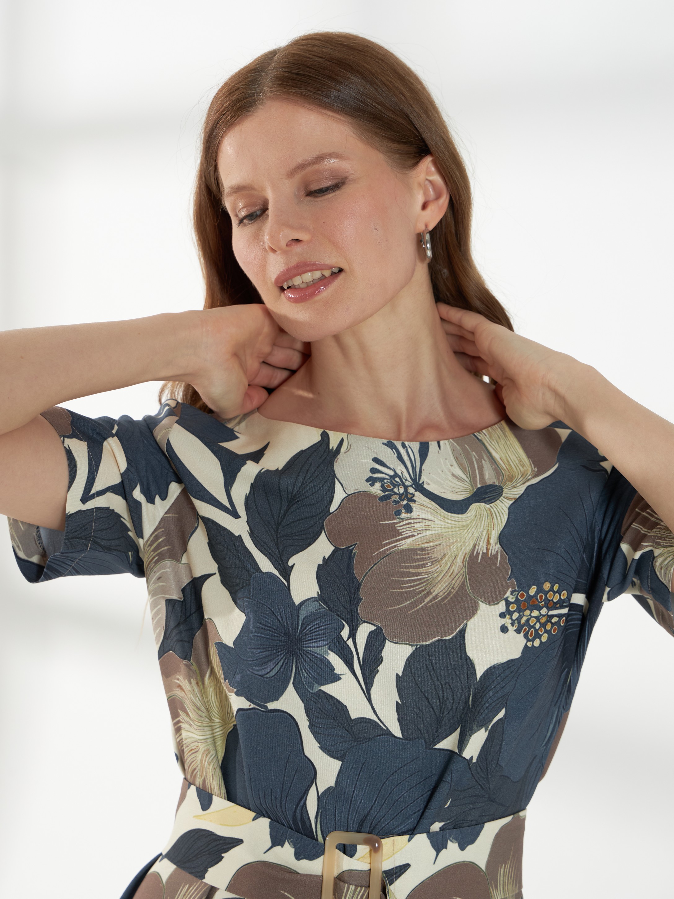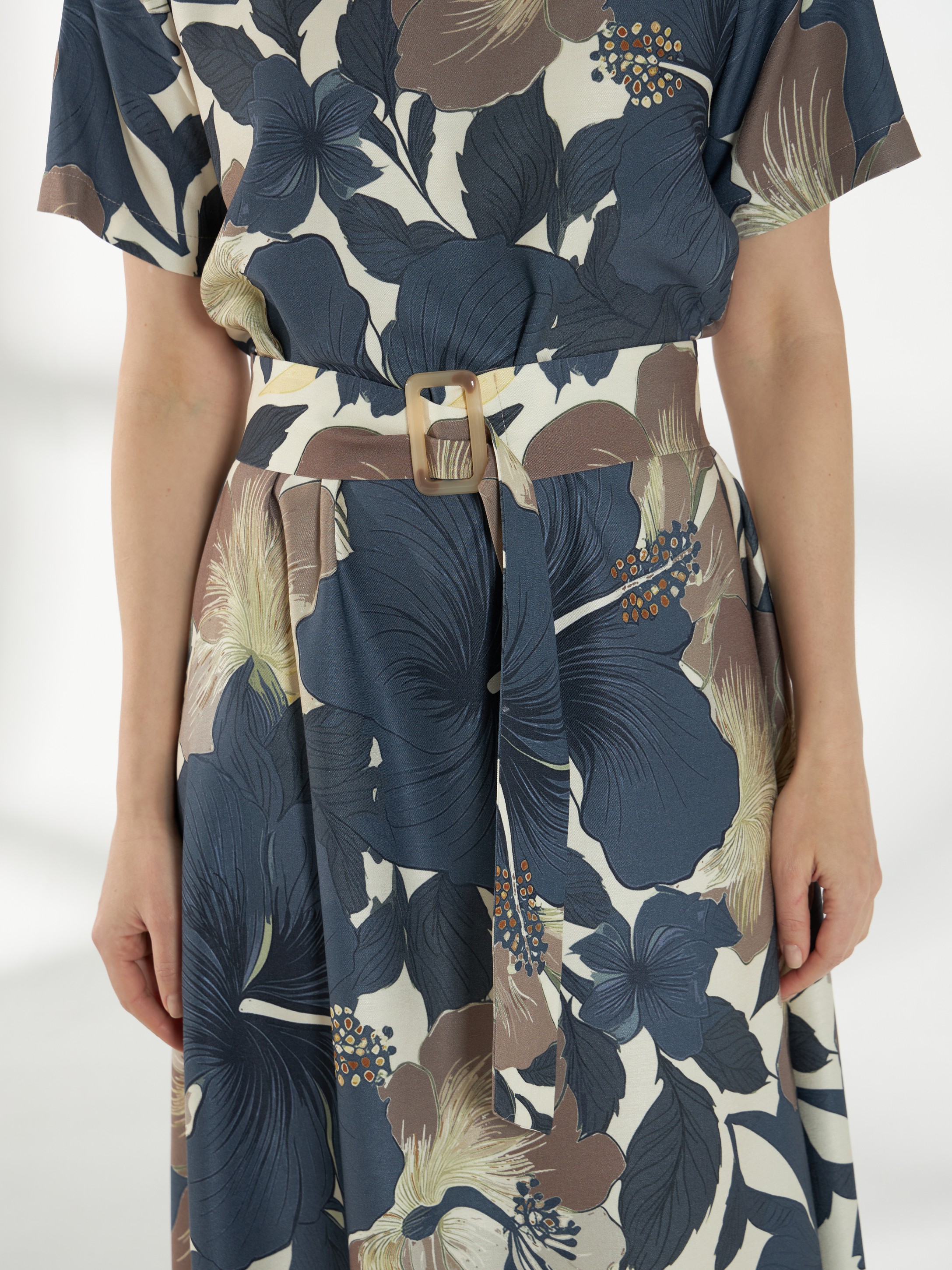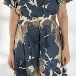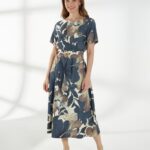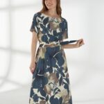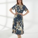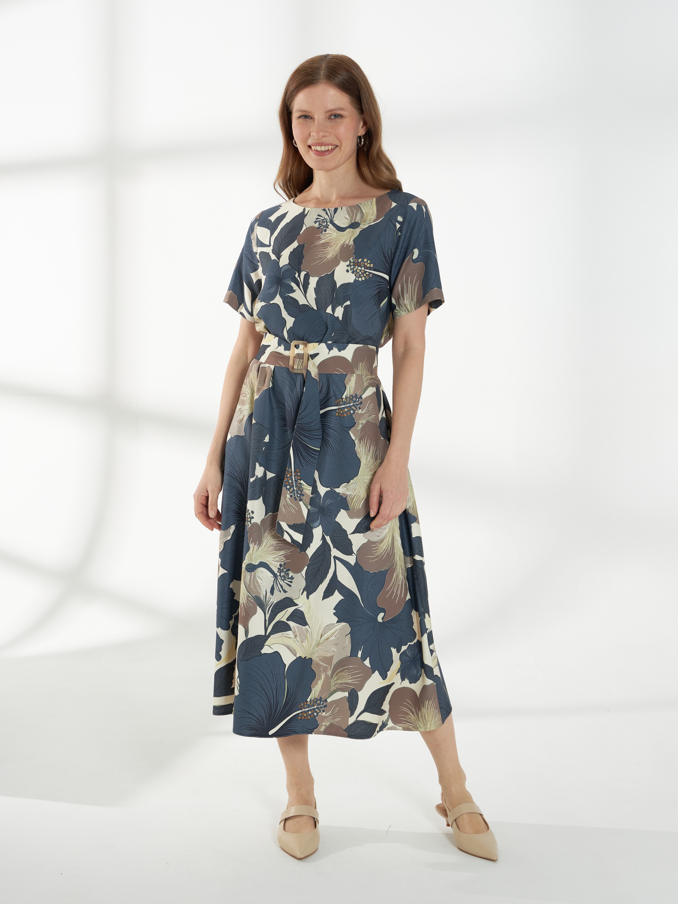 Элегантное платье из плотного вискозного штапеля с роскошным цветочным принтом. Лаконичная горловина и короткие рукава создают аккуратный и женственный верх. Модель отрезная по талии, с широкой расклешённой юбкой, которая мягко ниспадает, подчёркивая силуэт. Завершает образ пояс с пряжкой, аккуратно акцентирующий талию.