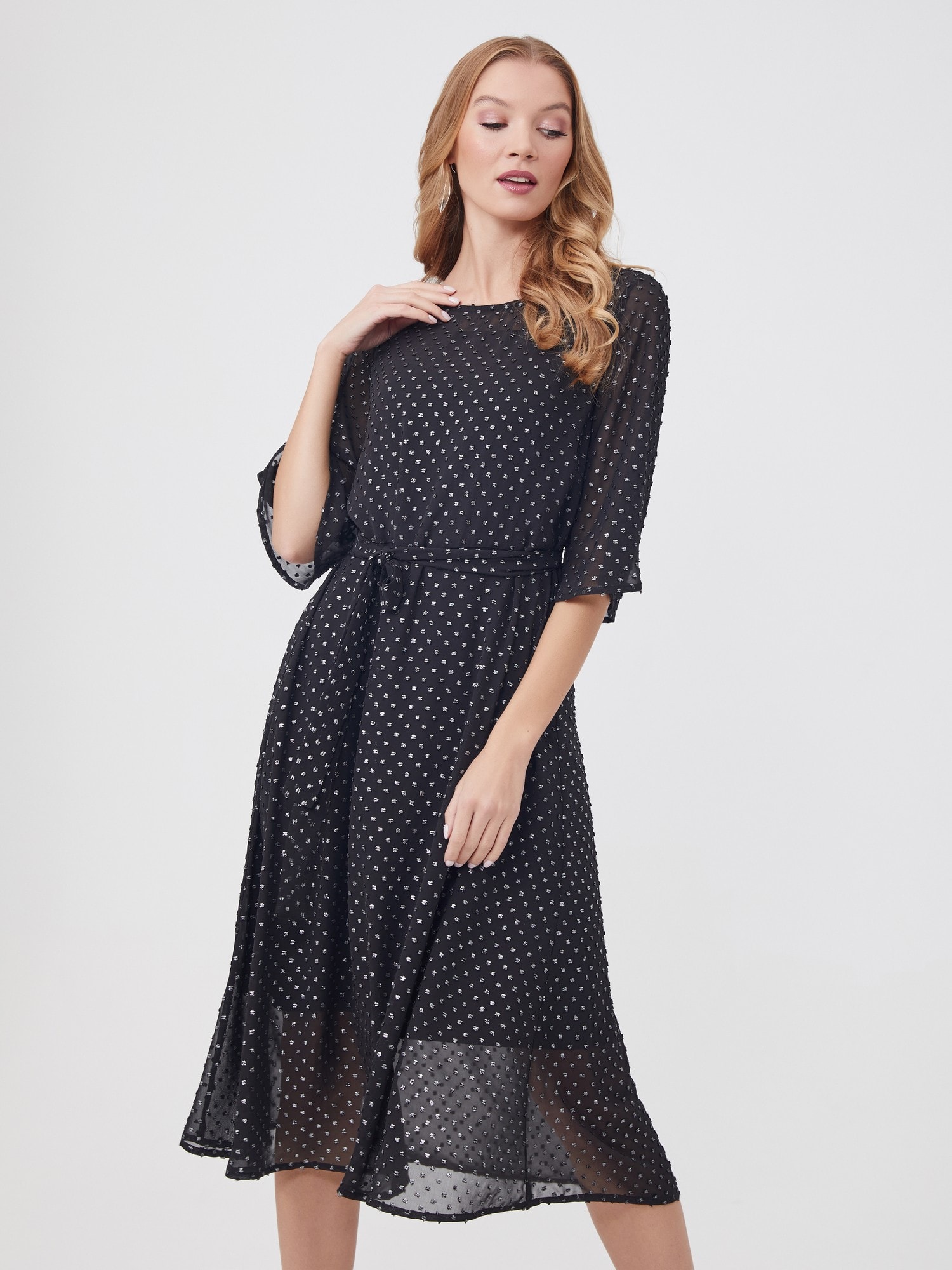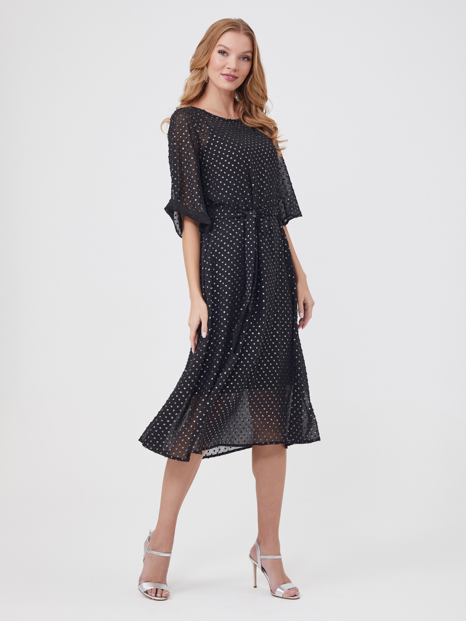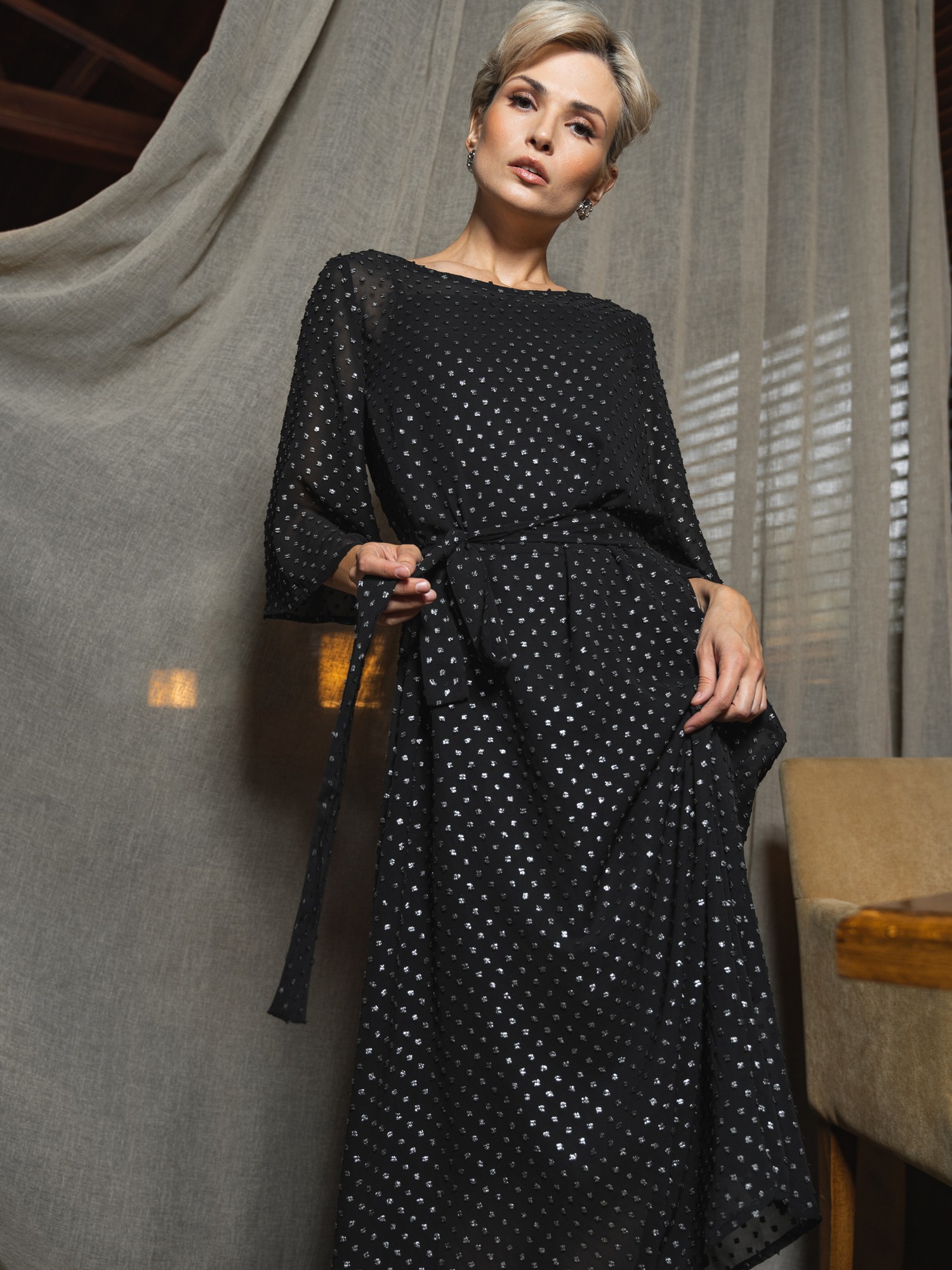 Описание: Платье из полупрозрачного шифона. Легкое, воздушное, с летящей юбкой и свободным рукавом. Талия подчёркнута поясом. Длина миди. Нижнее платье на бретельках выполнено из тонкого крепа, длина — чуть ниже колена. Его можно использовать как самостоятельное платье-комбинацию на тонких бретелях. Выполненное в чёрном цвете с изящным мерцанием серебристых капель, это платье станет вашим фаворитом для праздничных дней.