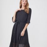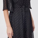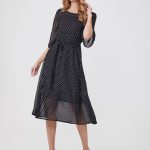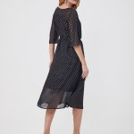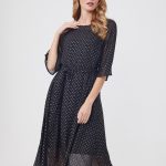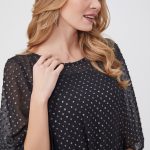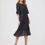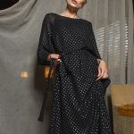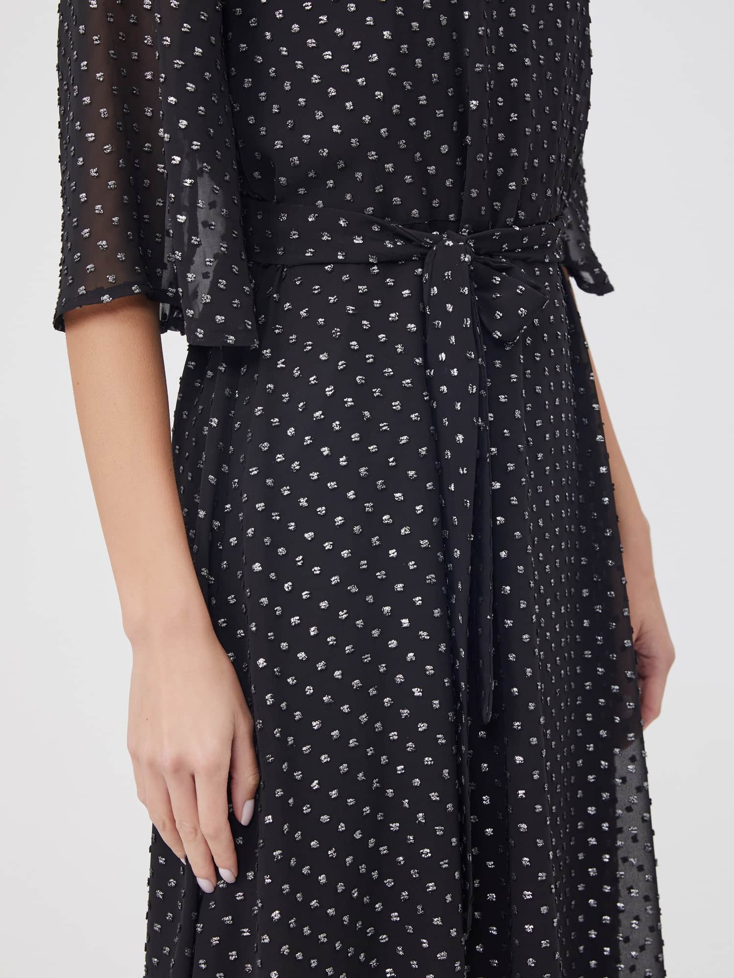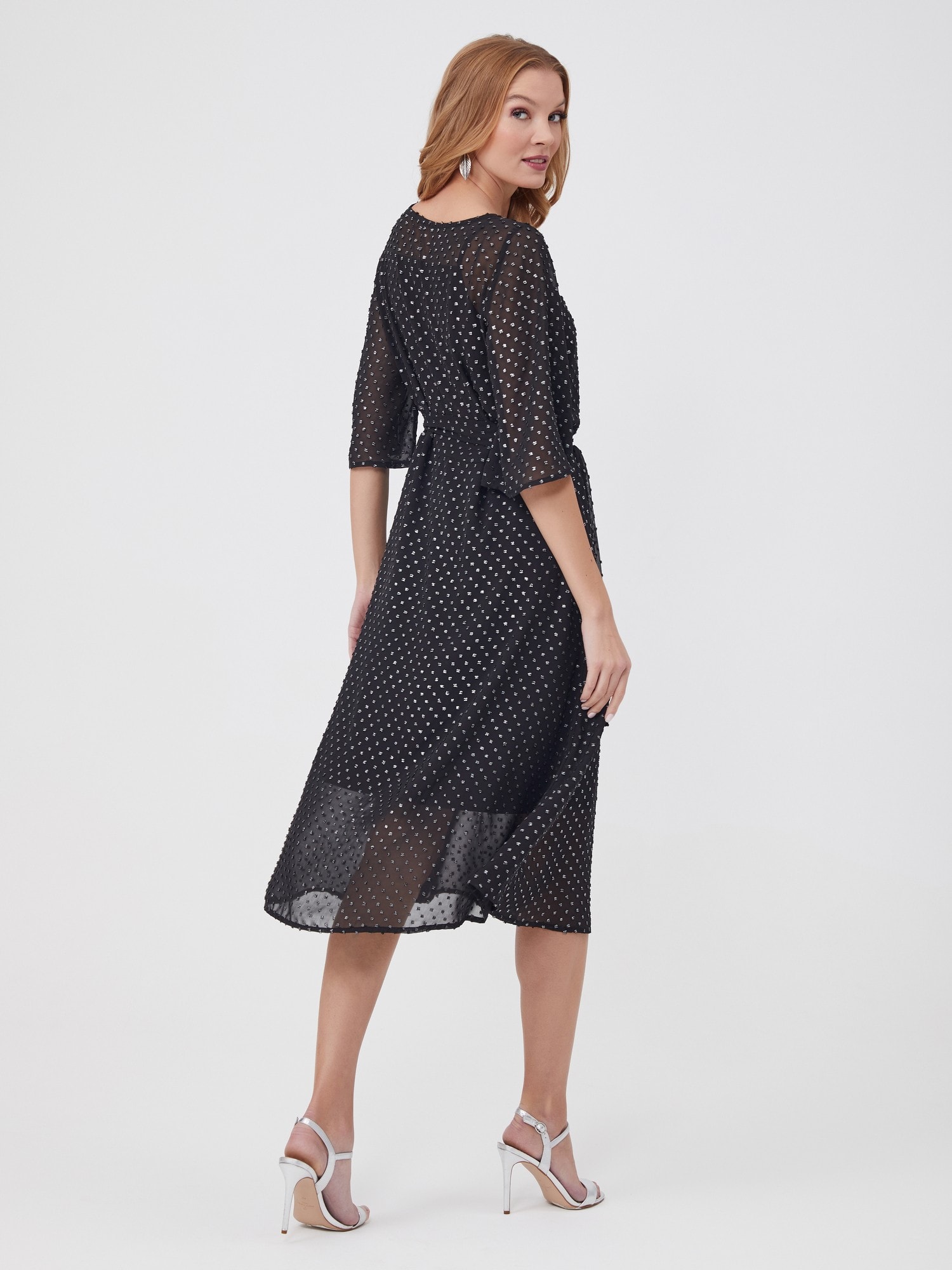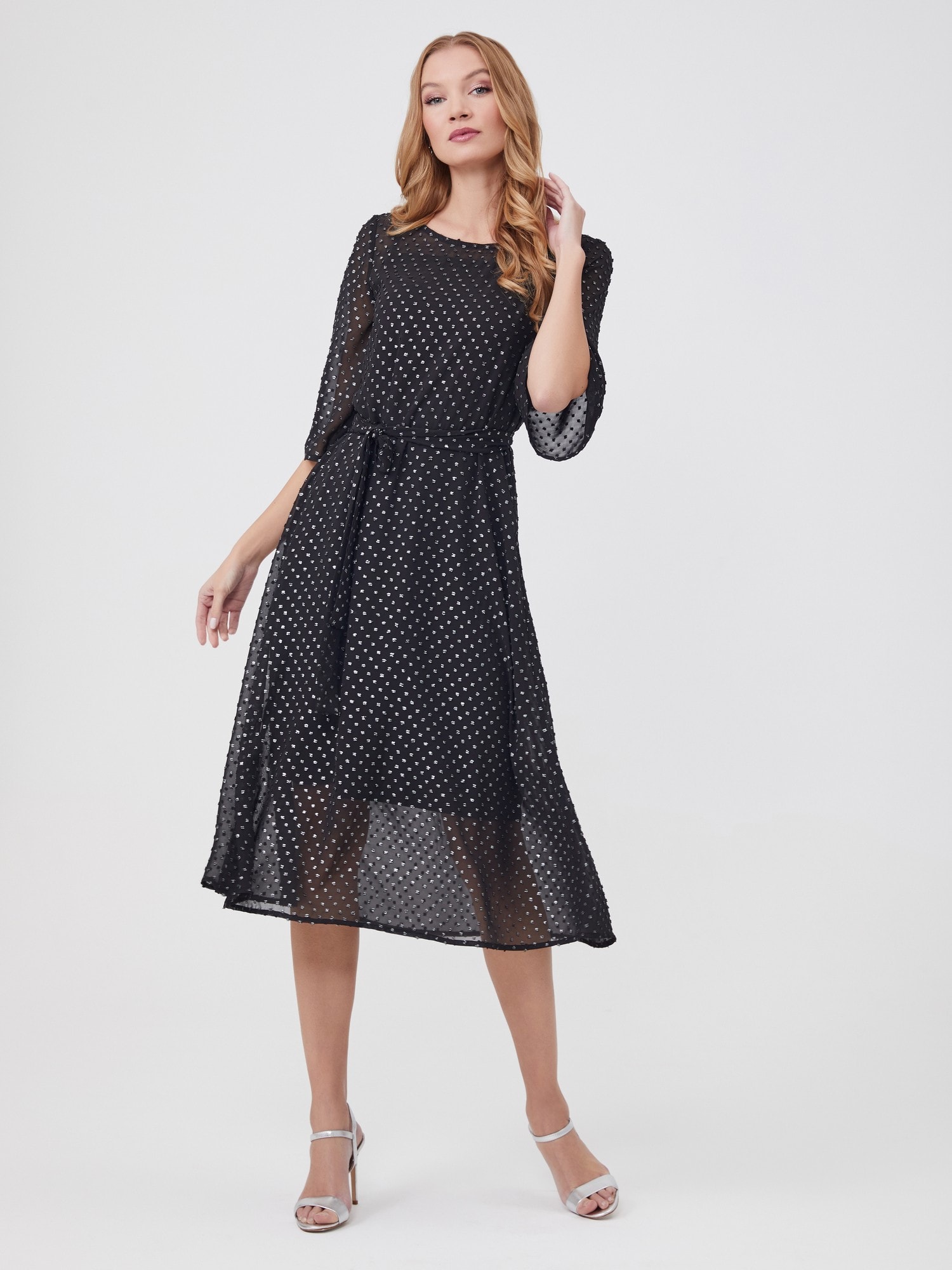 Описание: Платье из полупрозрачного шифона. Легкое, воздушное, с летящей юбкой и свободным рукавом. Талия подчёркнута поясом. Длина миди. Нижнее платье на бретельках выполнено из тонкого крепа, длина — чуть ниже колена. Его можно использовать как самостоятельное платье-комбинацию на тонких бретелях. Выполненное в чёрном цвете с изящным мерцанием серебристых капель, это платье станет вашим фаворитом для праздничных дней.