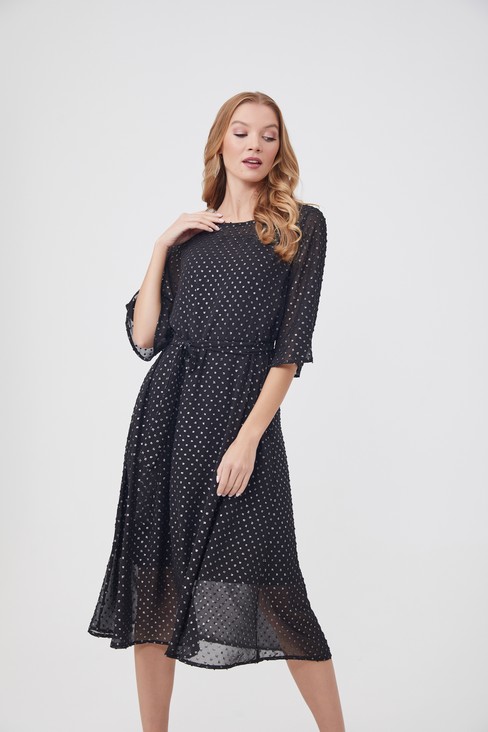 Описание: Платье из полупрозрачного шифона. Легкое, воздушное, с летящей юбкой и свободным рукавом. Талия подчёркнута поясом. Длина миди. Нижнее платье на бретельках выполнено из тонкого крепа, длина — чуть ниже колена. Его можно использовать как самостоятельное платье-комбинацию на тонких бретелях. Выполненное в чёрном цвете с изящным мерцанием серебристых капель, это платье станет вашим фаворитом для праздничных дней.
