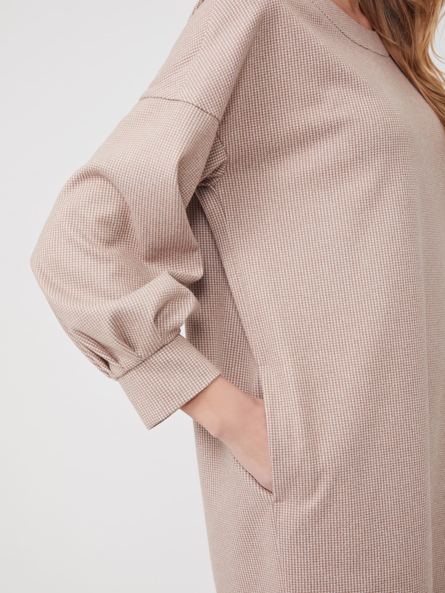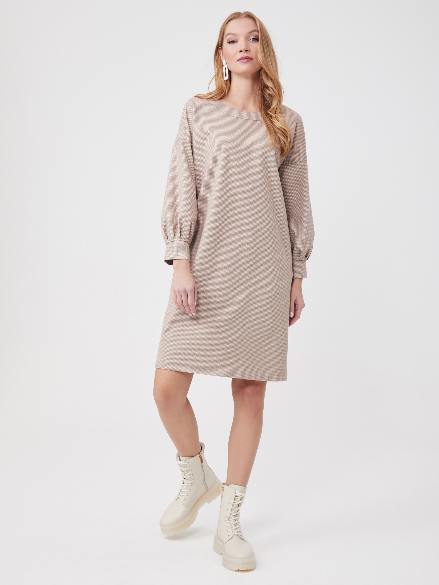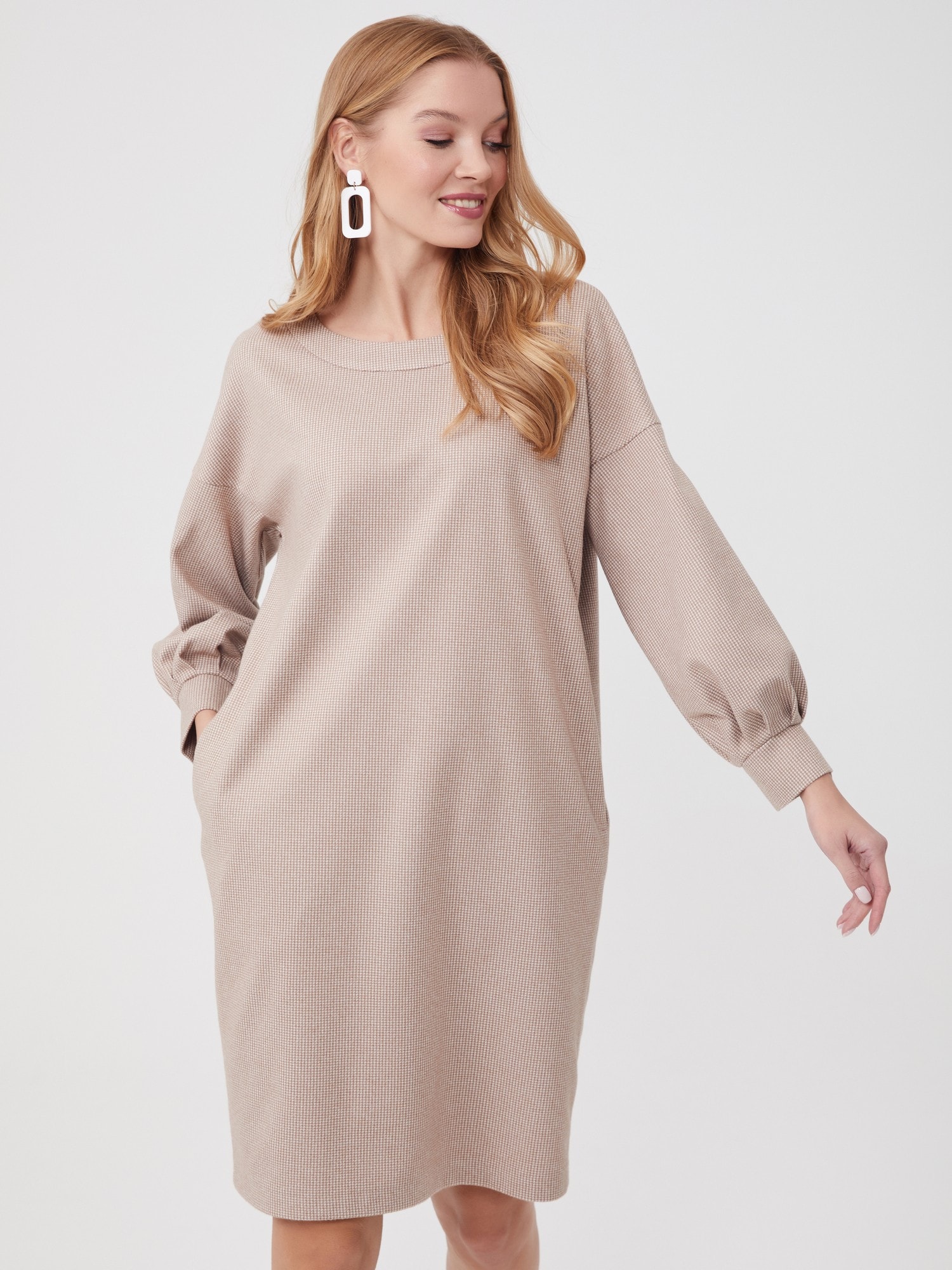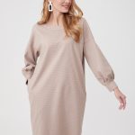 Описание: Платье свободного кроя с мягкой линией плеча - самое тёплое и самое уютное. Объемный рукав на манжете со складками, карманы в боковых швах. Принт микролапка в бежевом оттенке. Платье смотрится одновременно молодёжно и элегантно.