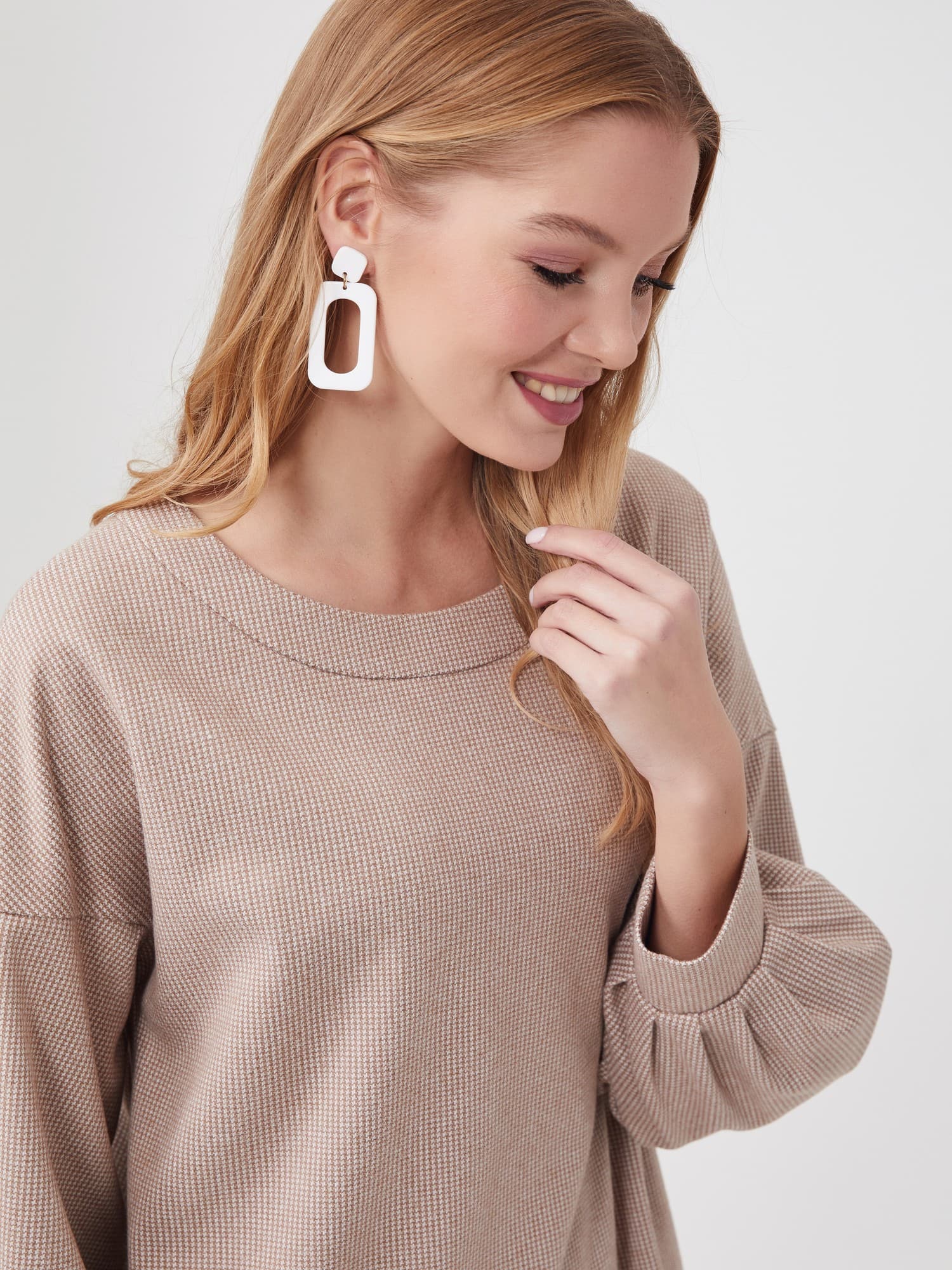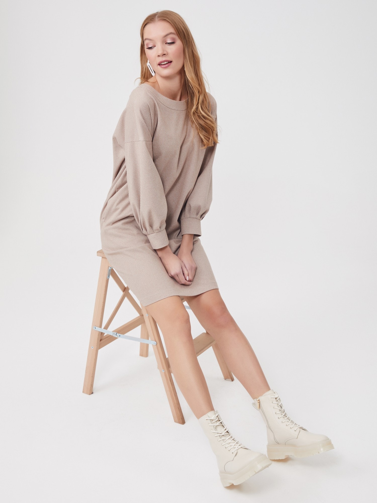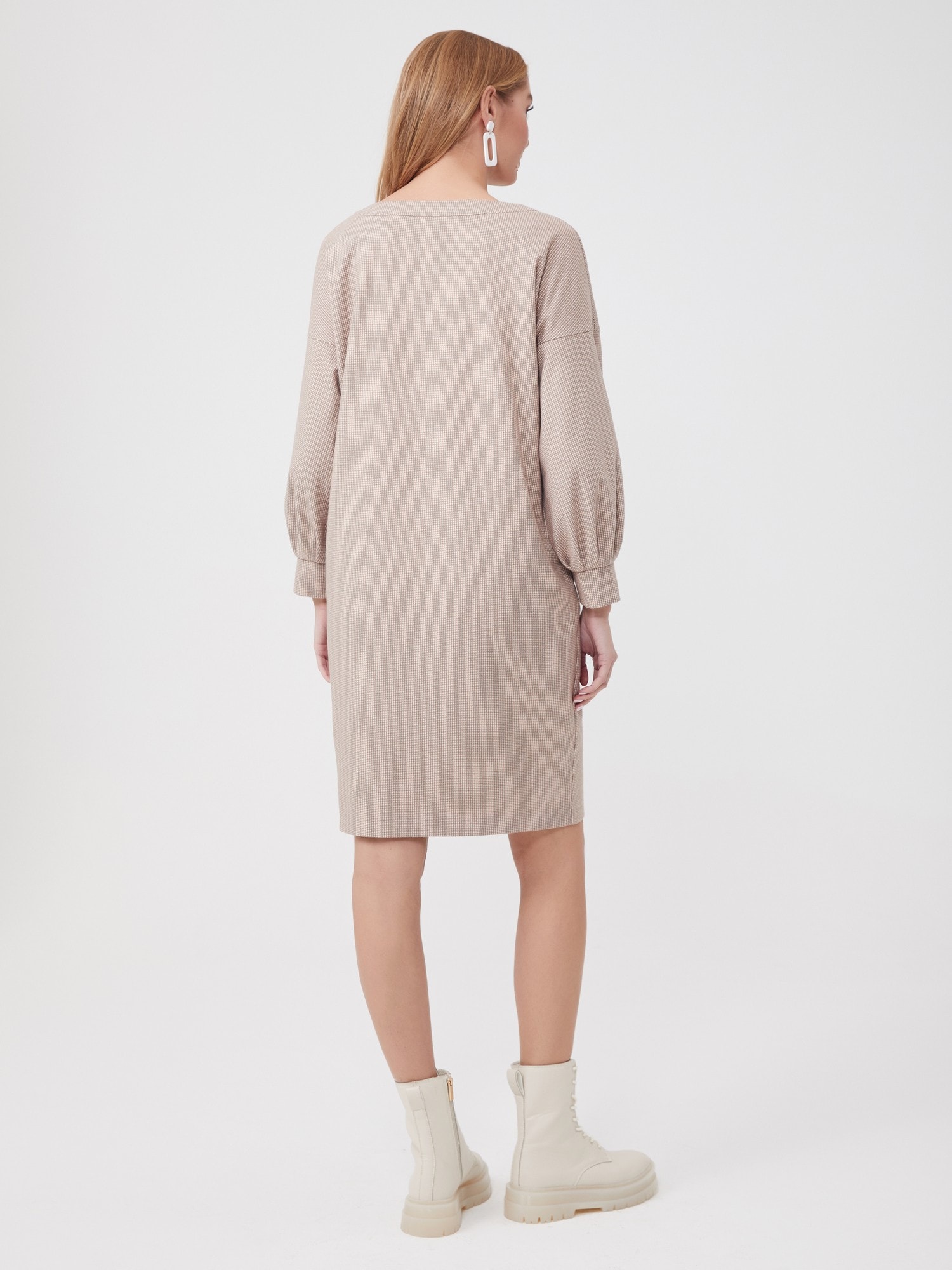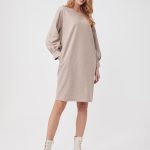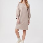 Описание: Платье свободного кроя с мягкой линией плеча - самое тёплое и самое уютное. Объемный рукав на манжете со складками, карманы в боковых швах. Принт микролапка в бежевом оттенке. Платье смотрится одновременно молодёжно и элегантно.