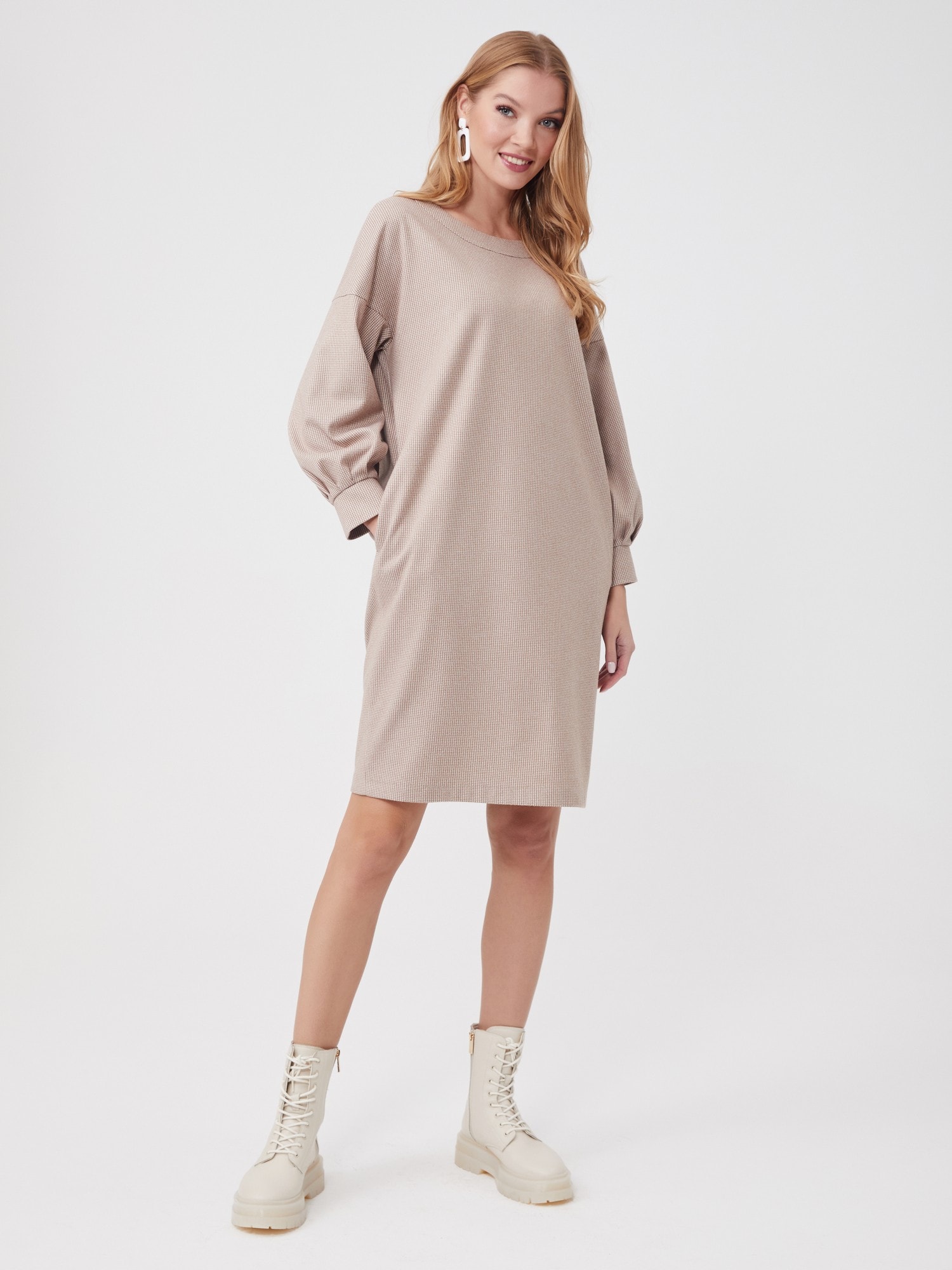 Описание: Платье свободного кроя с мягкой линией плеча - самое тёплое и самое уютное. Объемный рукав на манжете со складками, карманы в боковых швах. Принт микролапка в бежевом оттенке. Платье смотрится одновременно молодёжно и элегантно.