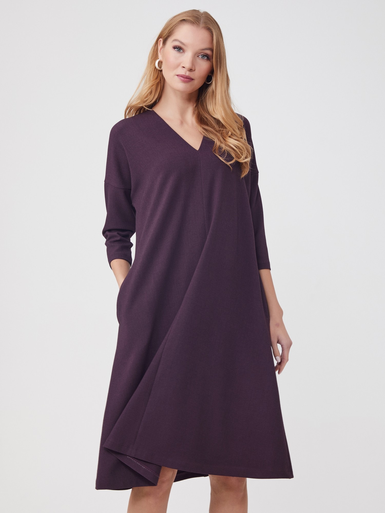 Описание: Платье в сливовом оттенке длины миди. V-образный вырез. Благодаря объемному крою можно легко играть с силуэтом, при желании добавив к платью пояс. Спущенная линия плеча и не широкий рукав для комфортной посадки. В боковых швах спрятаны карманы, чтобы всегда иметь с собой самое необходимое.