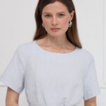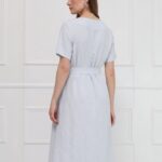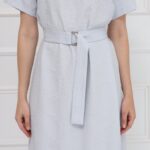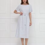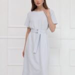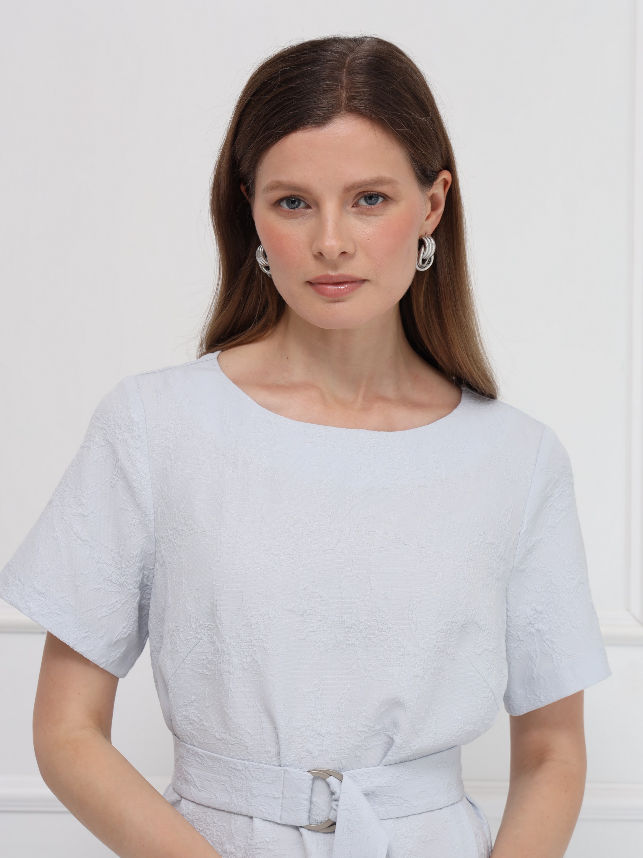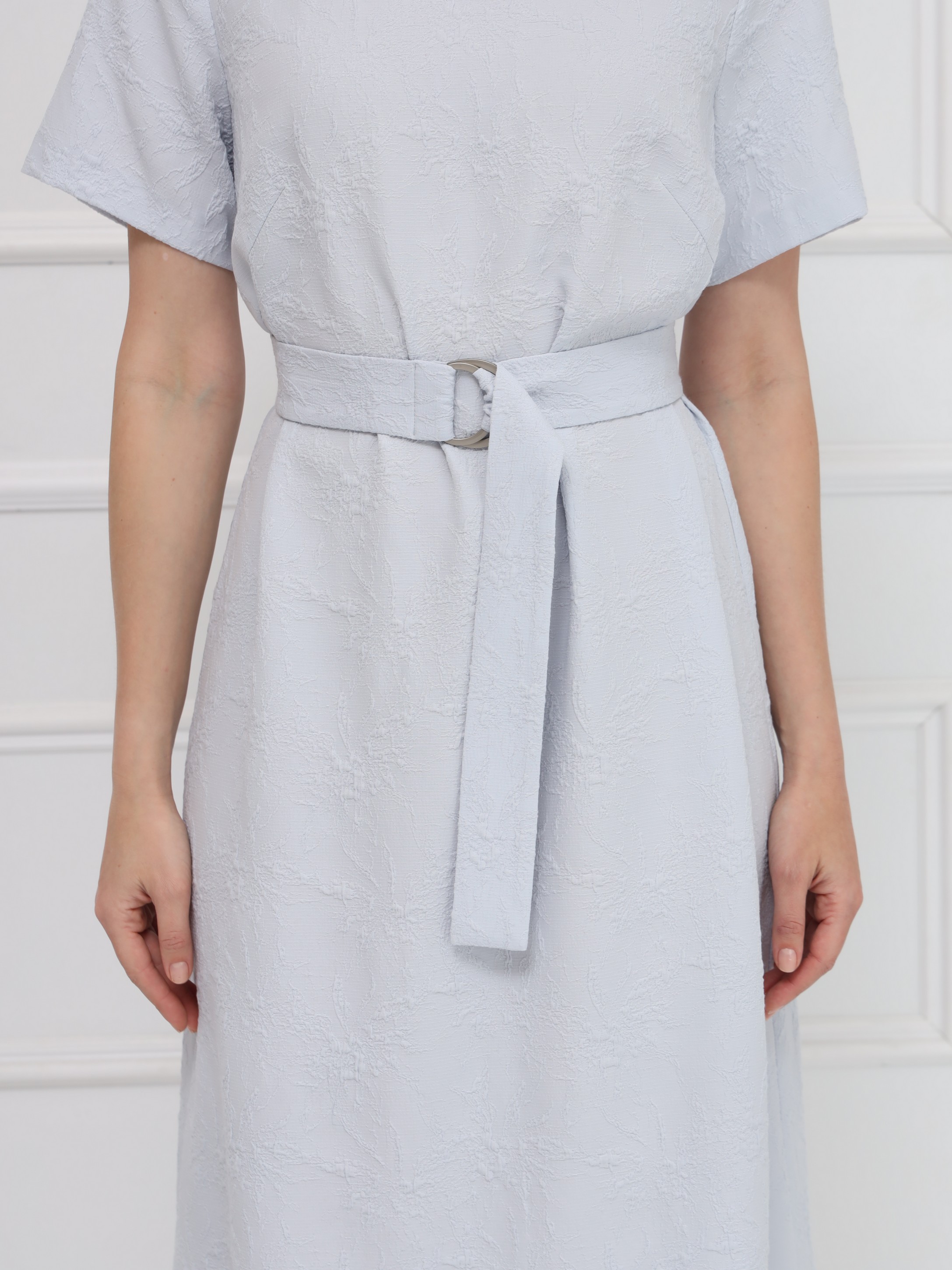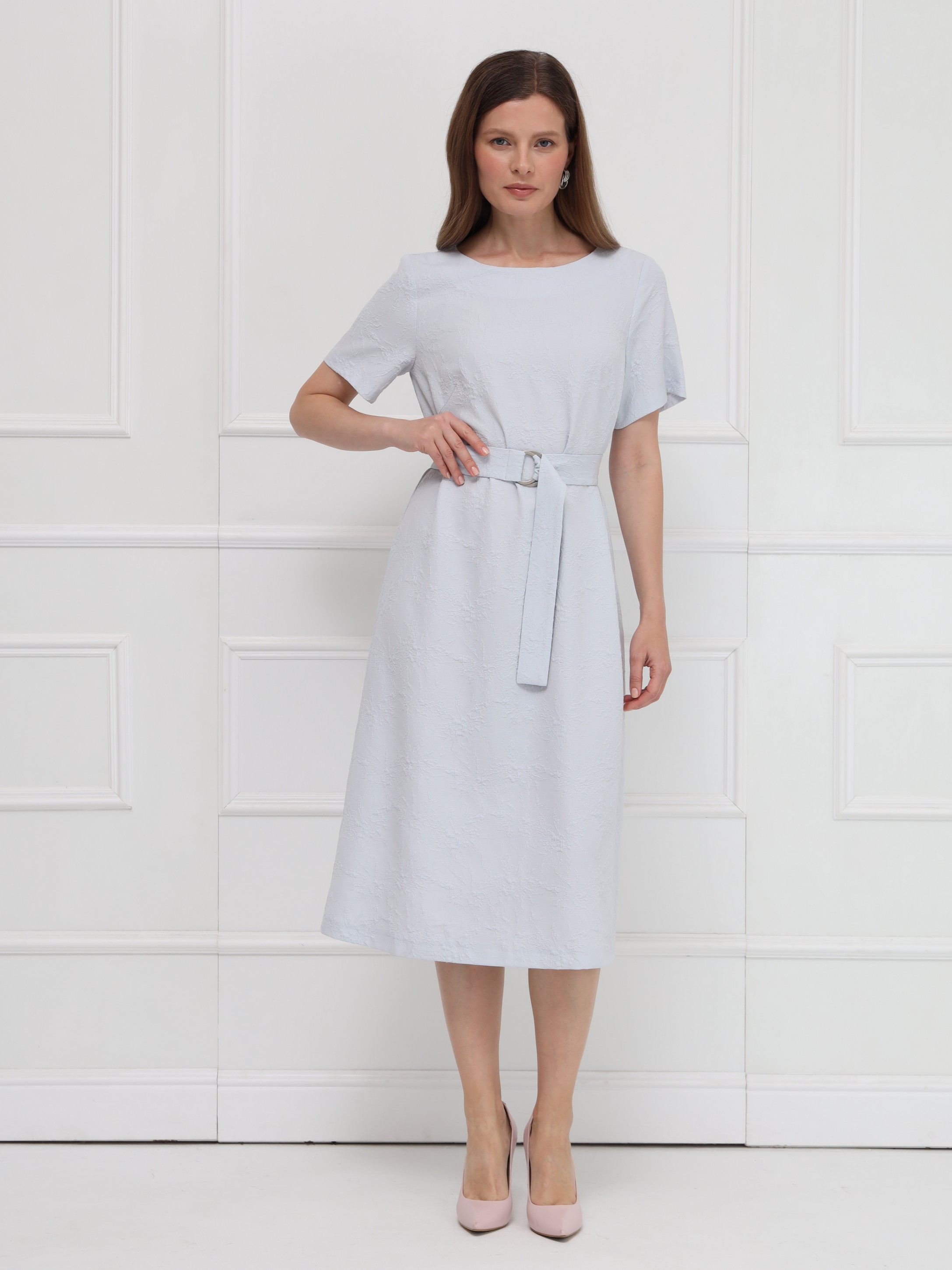 Платье-миди прямого кроя выполнено в сдержанном, элегантном стиле и дополнено поясом с серебристой пряжкой, подчёркивающим линию талии. Мягкая, пластичная ткань с выпуклым жаккардовым рисунком создаёт благородную фактуру и делает модель по-особому выразительной. Нежный светло-серый цвет придаёт образу утончённость, универсальность и современную лёгкость.
