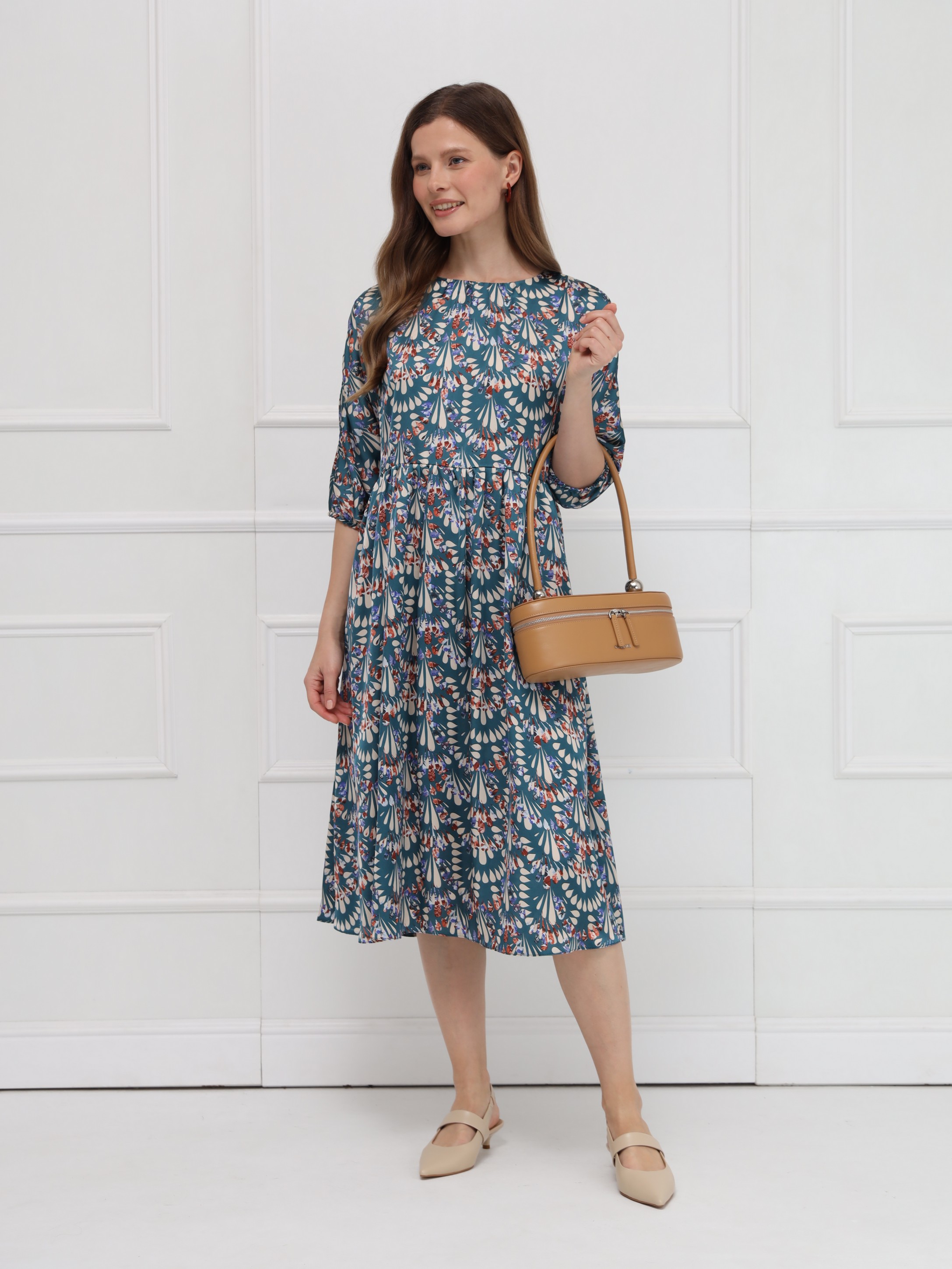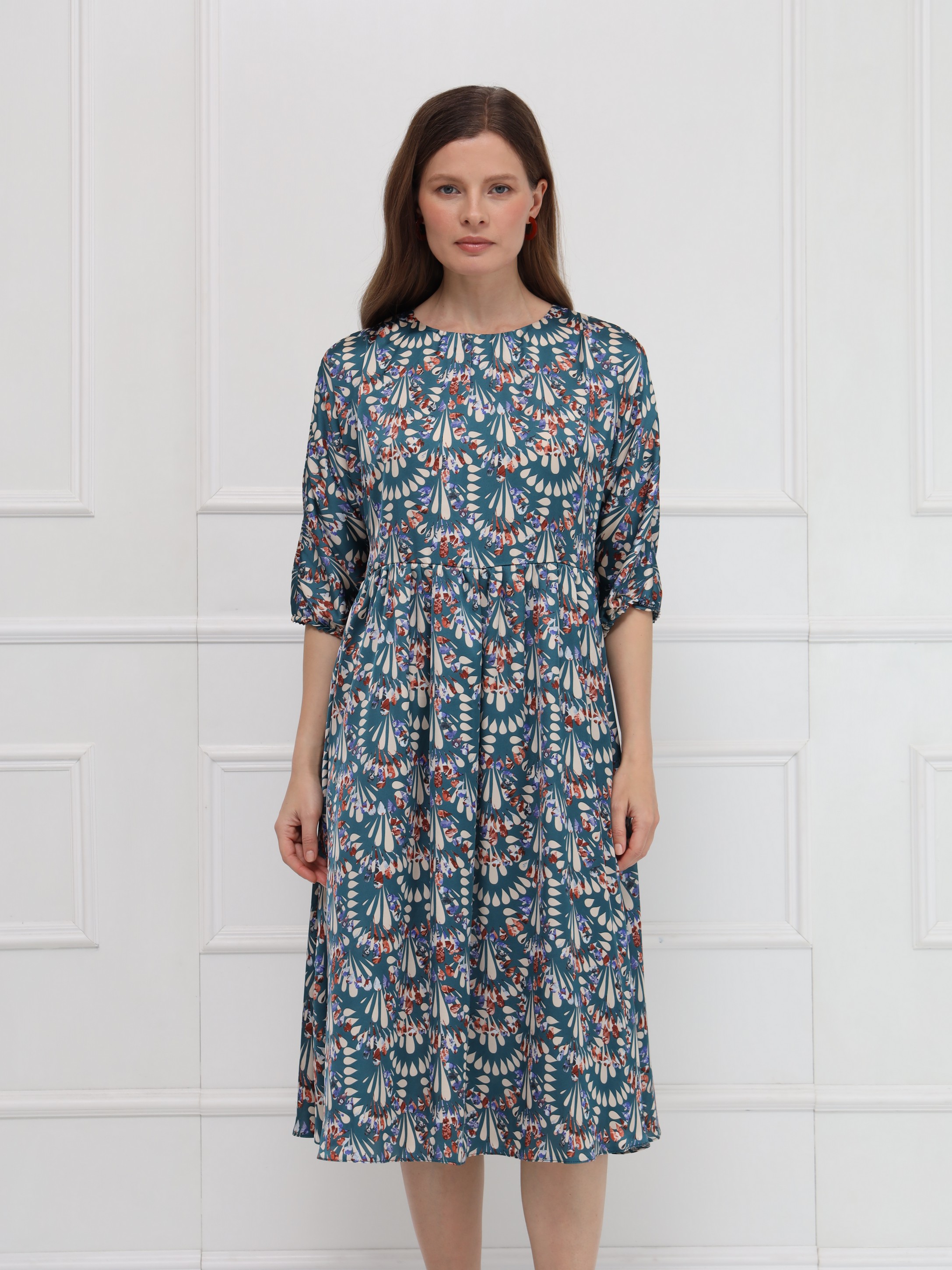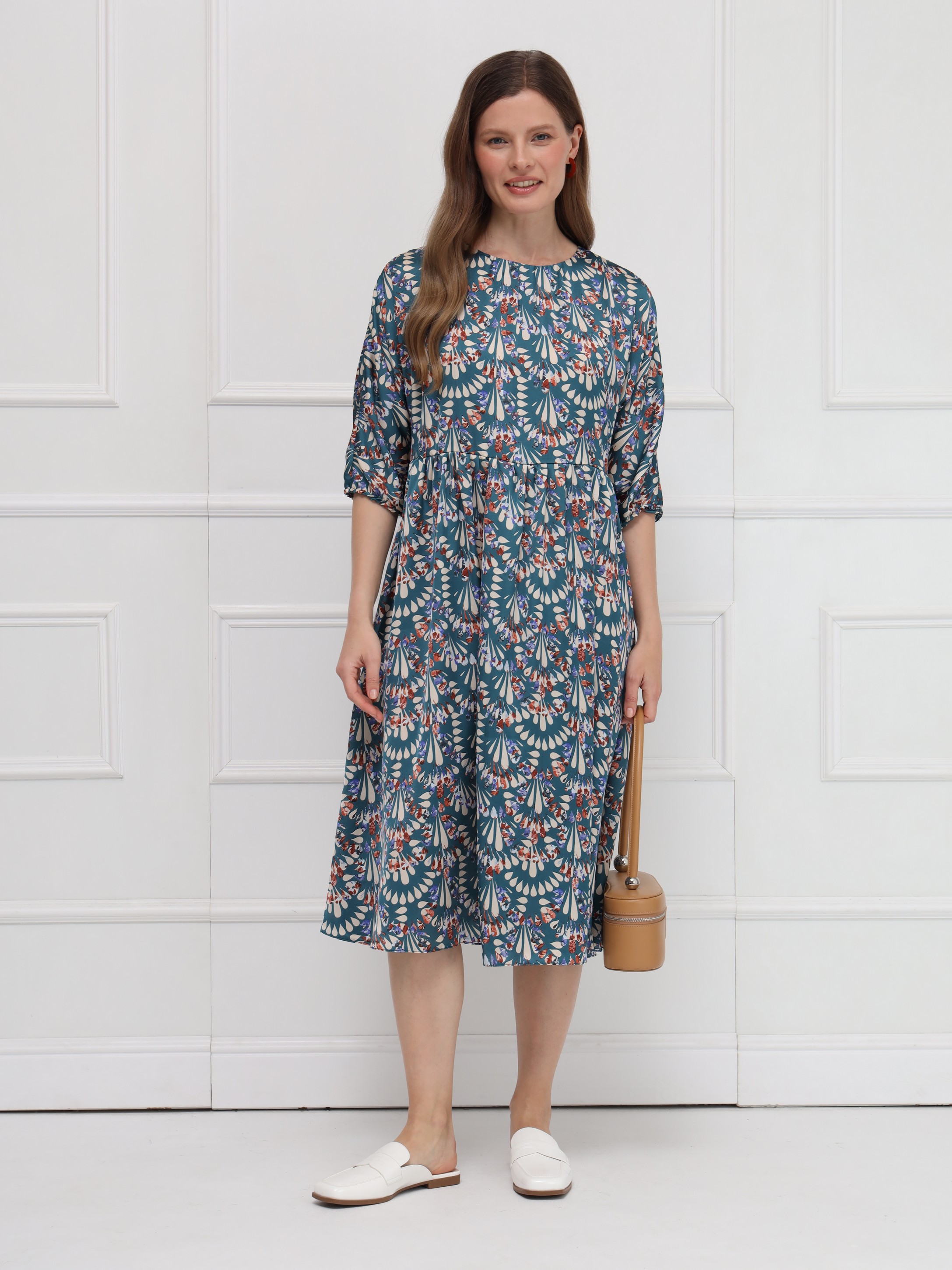 Платье миди выполнено из легкой ткани с авторским принтом, мягко струящейся при движении. Круглая горловина с мягкими складками дополнена застежкой сзади, создавая аккуратный акцент в верхней части. Подрез под грудью и скрытая кулиса позволяют регулировать степень прилегания. Цельнокроеные рукава длиной 3/4 собраны по низу на эластичную тесьму. Присборенная юбка добавляет воздушности и свободы.