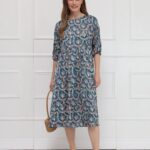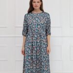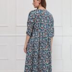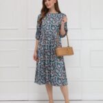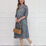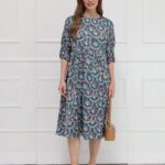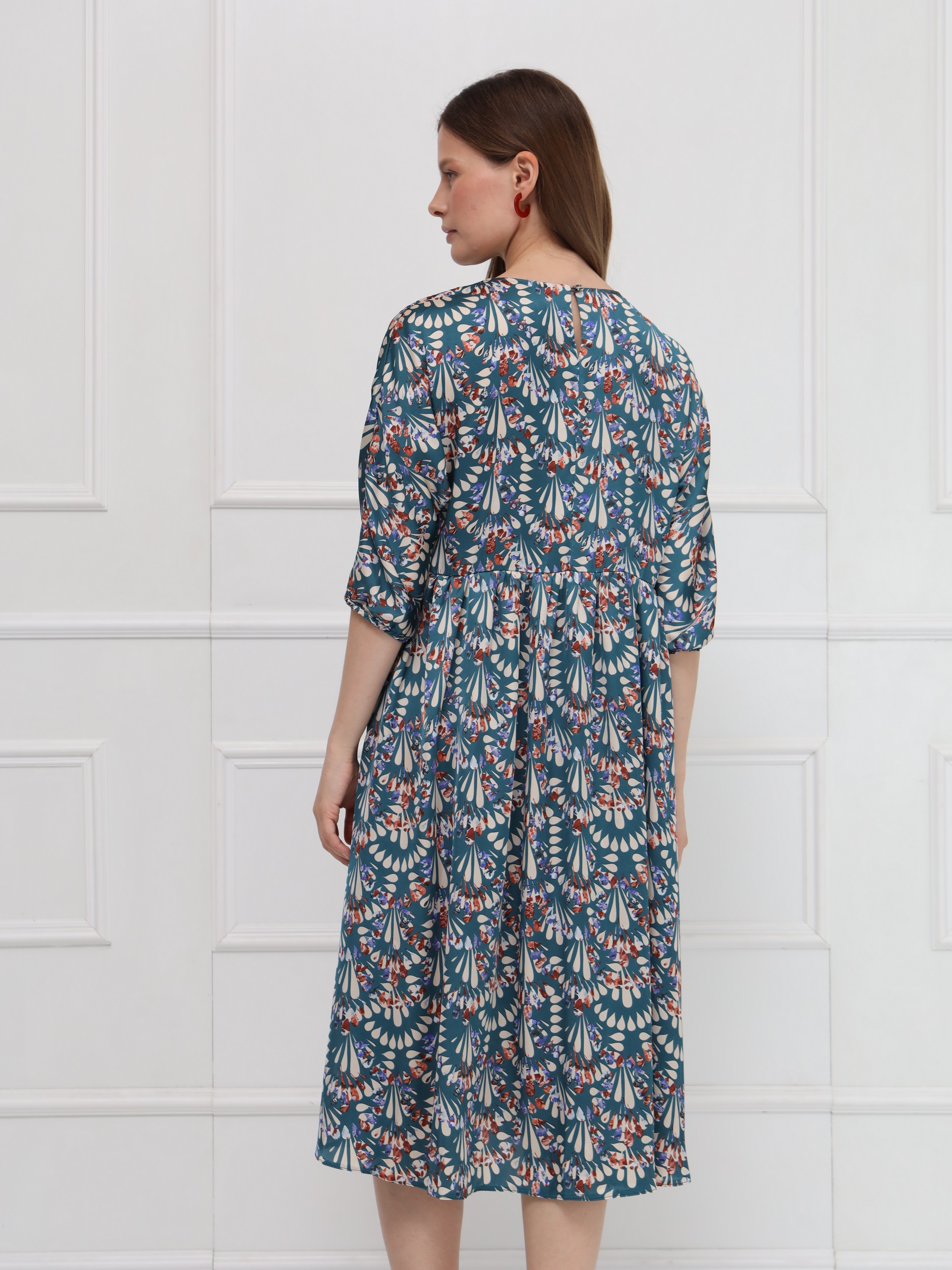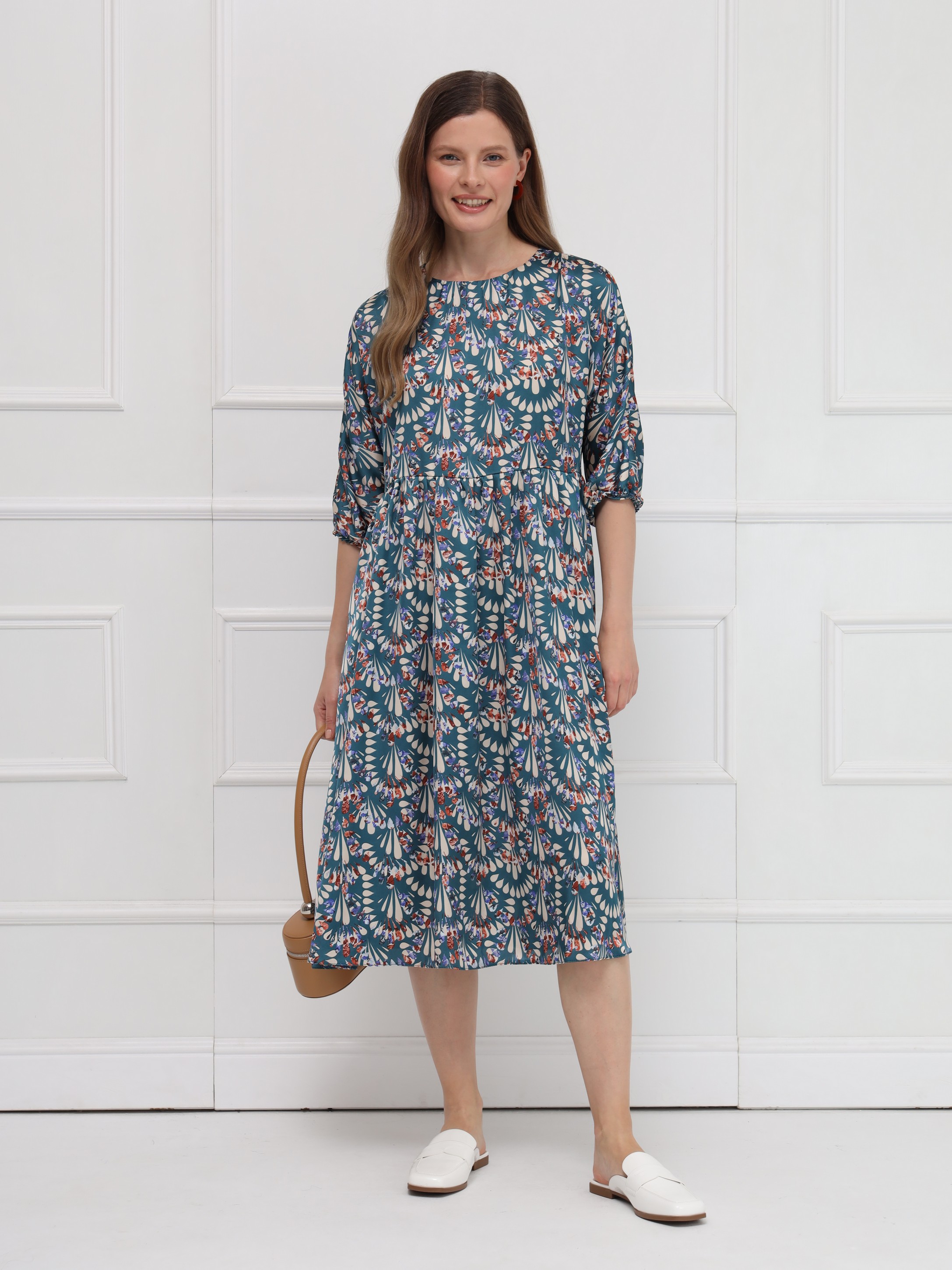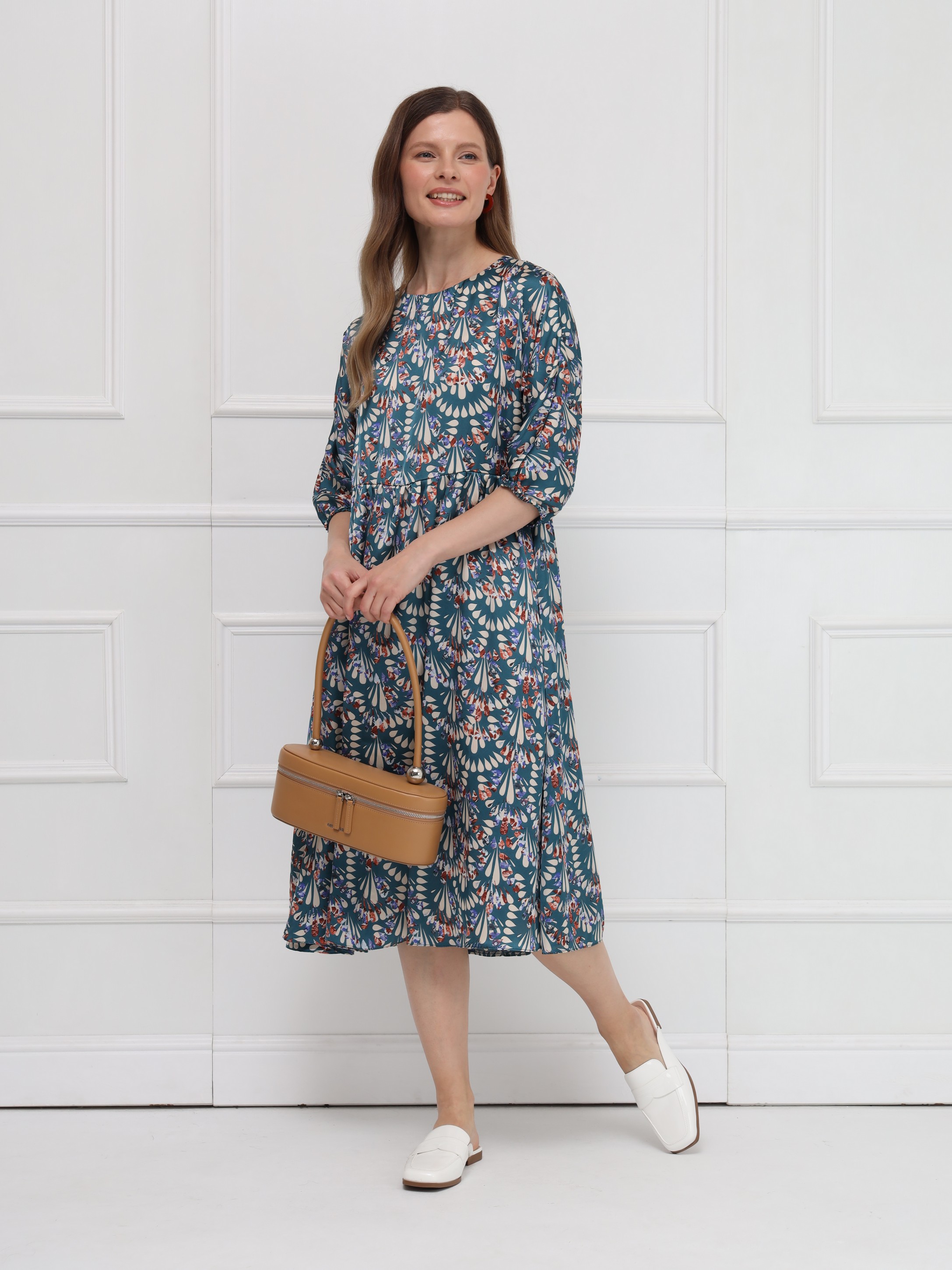 Платье миди выполнено из легкой ткани с авторским принтом, мягко струящейся при движении. Круглая горловина с мягкими складками дополнена застежкой сзади, создавая аккуратный акцент в верхней части. Подрез под грудью и скрытая кулиса позволяют регулировать степень прилегания. Цельнокроеные рукава длиной 3/4 собраны по низу на эластичную тесьму. Присборенная юбка добавляет воздушности и свободы.
